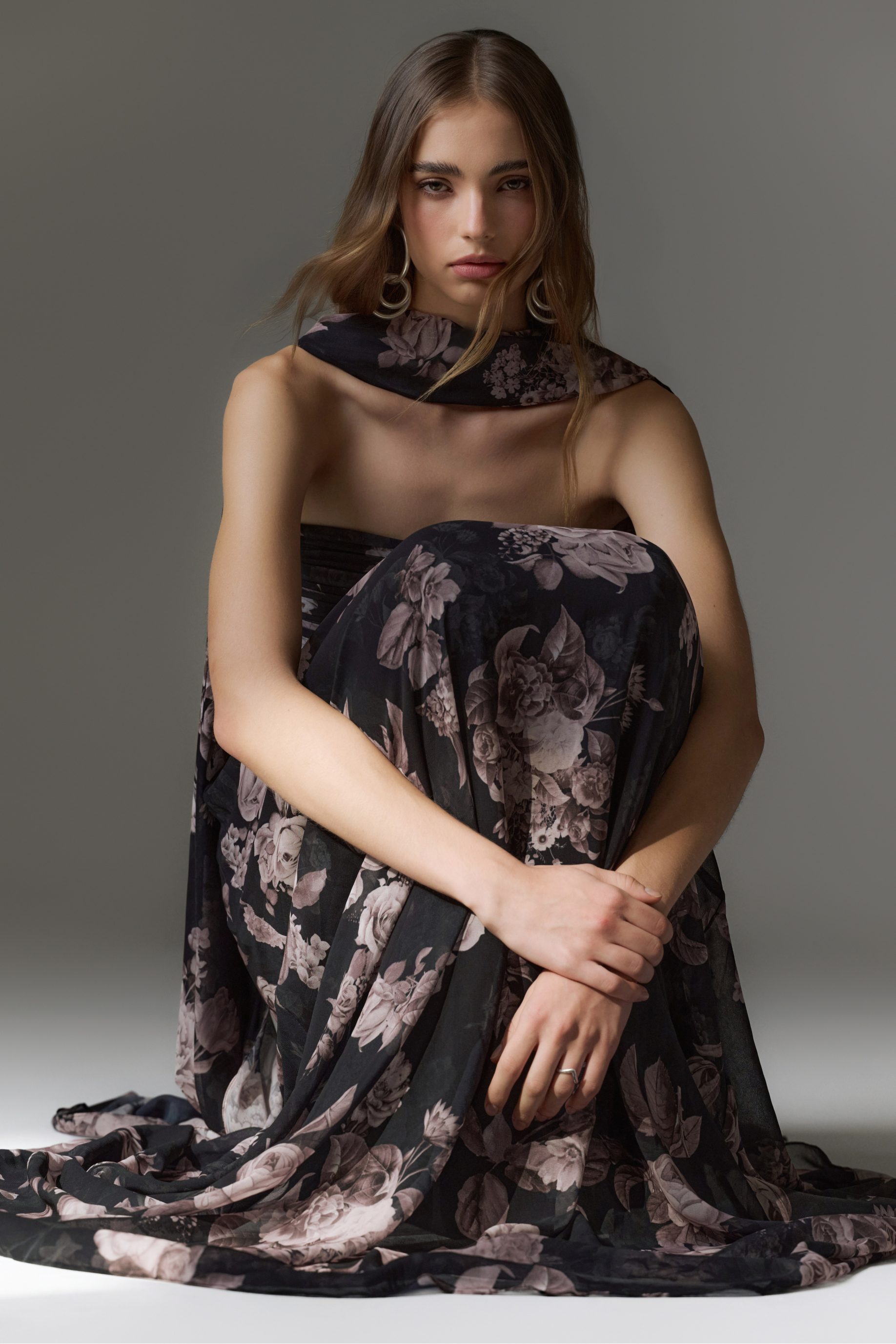Echarpe de musseline com estampa digital exclusiva, podendo ser usada no pescoço ou sobre o colo.
