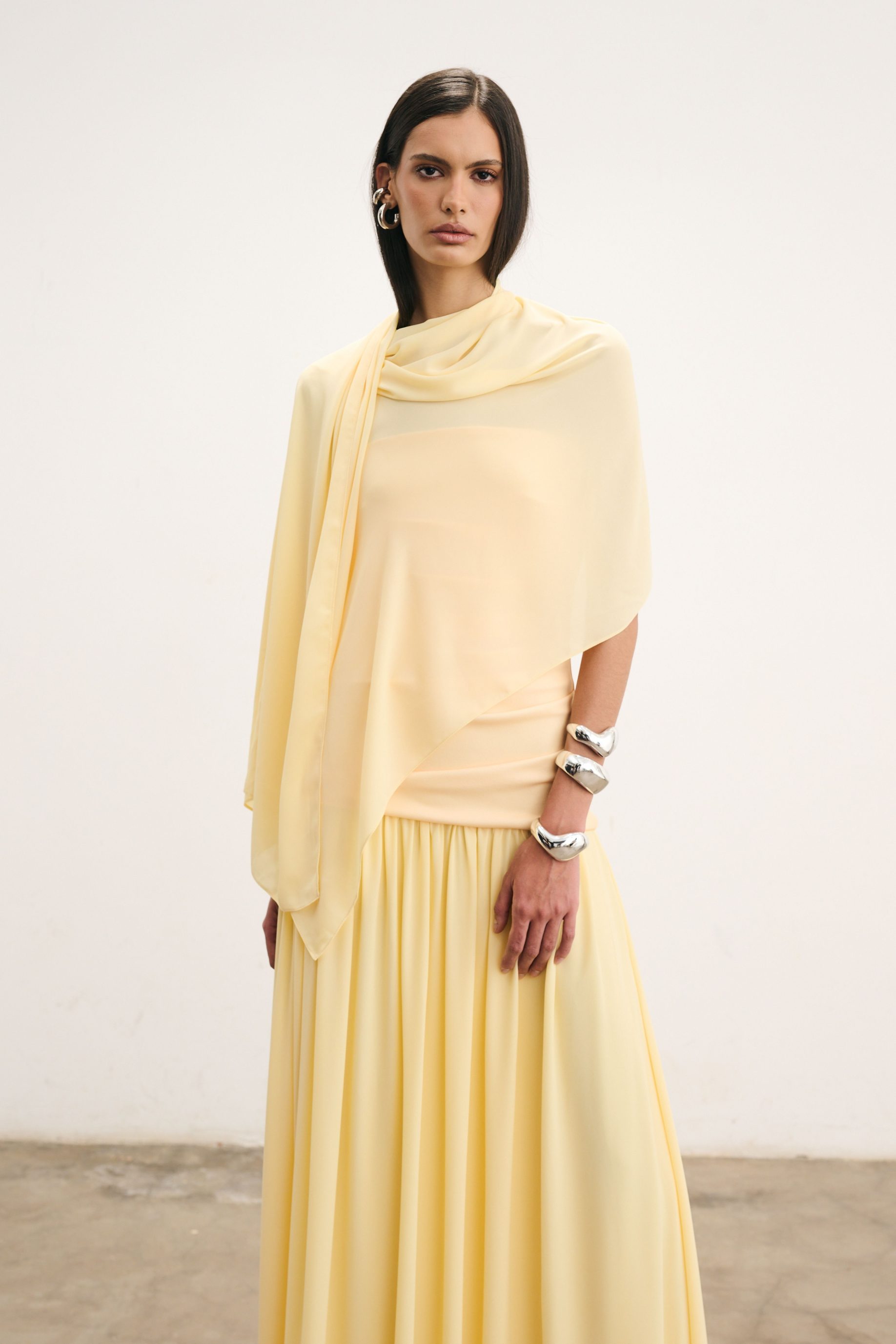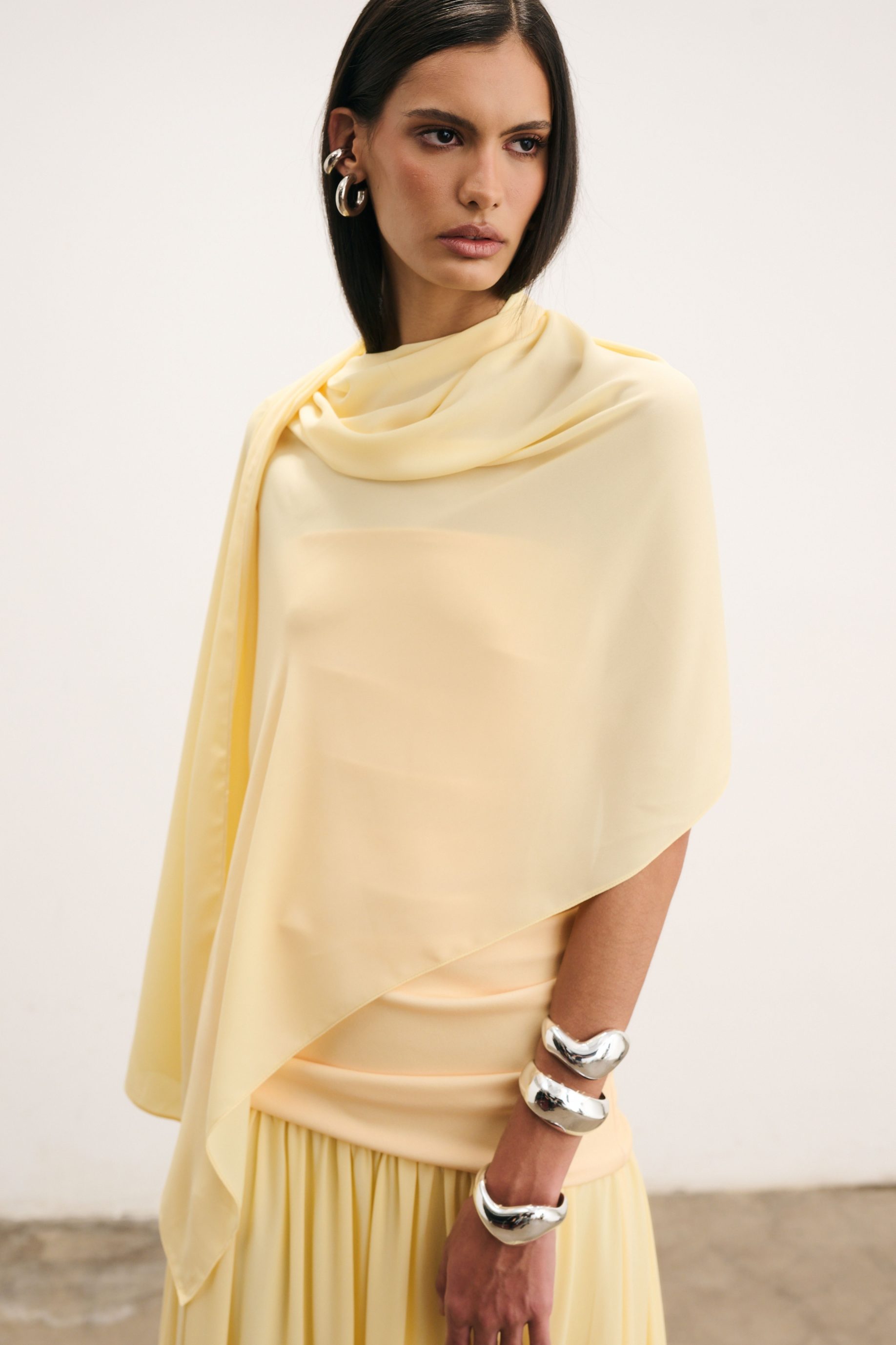 Echarpe de musseline, Amarelo claro podendo ser usada no pescoço ou sobre o colo.