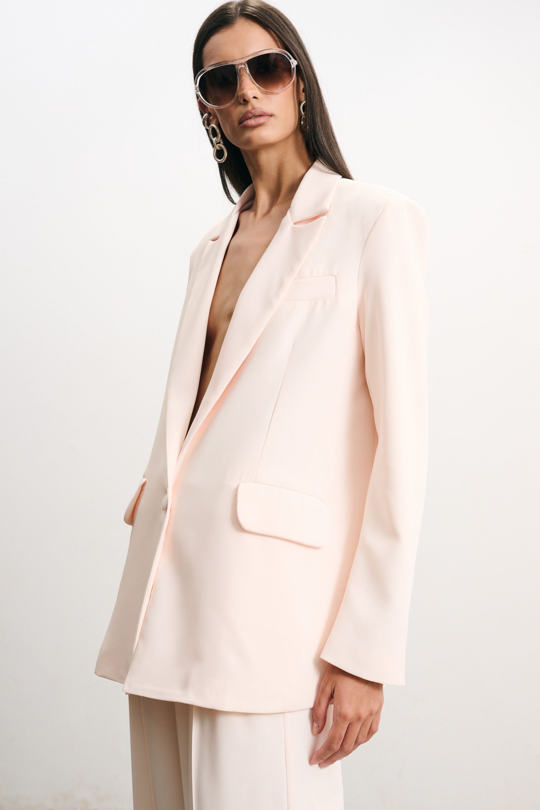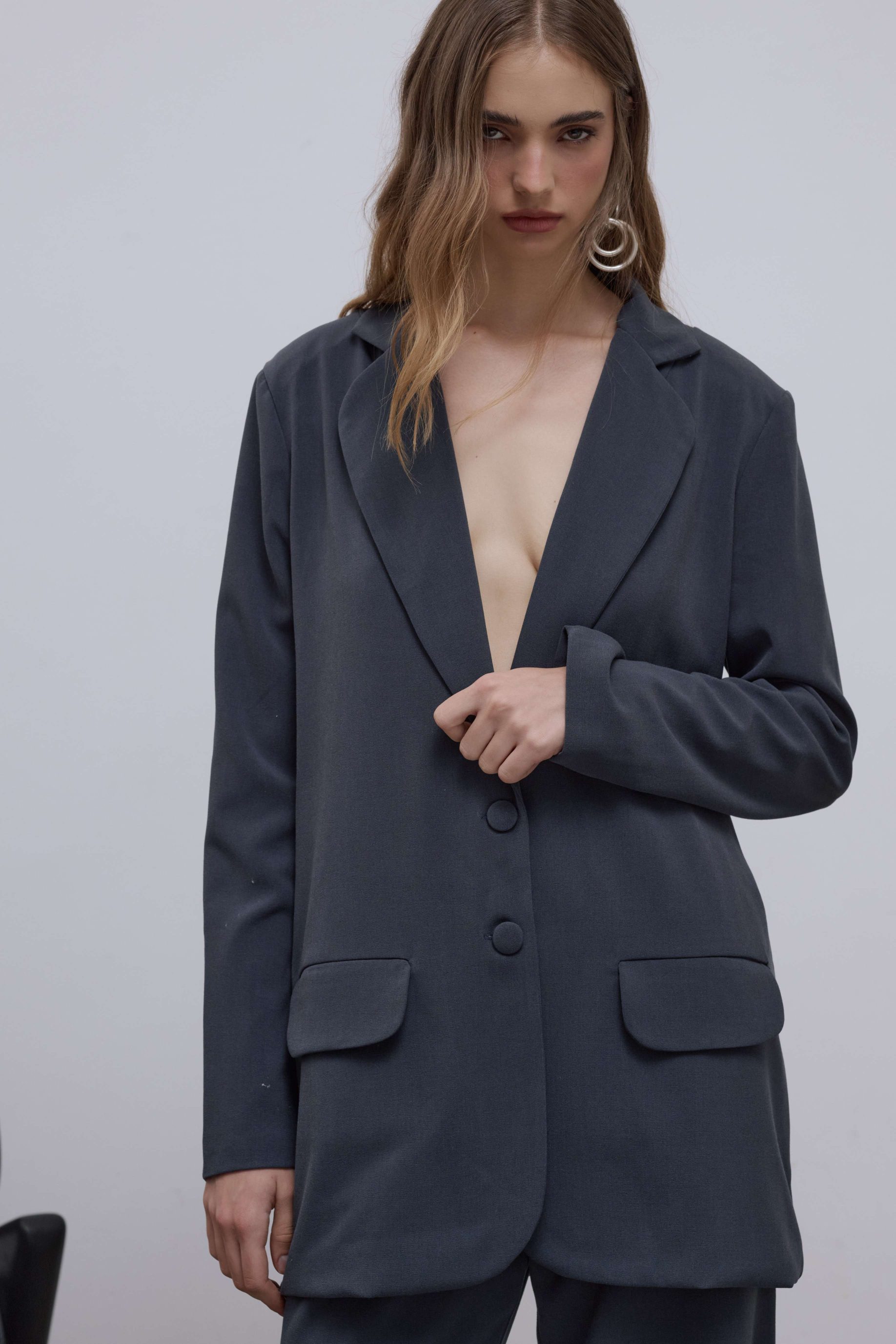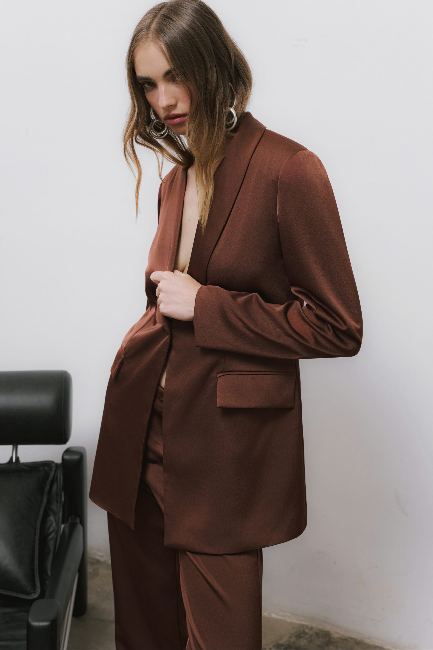 R$648,00 6 x R$108,00Blazer alongado em cetim encorpado, modelagem reta e oversized. Possui lapela clássica, bolsos laterais, fechamento frontal por botão forrado e acabamento interno de alta qualidade. Uma peça atemporal que une elegância e versatilidade.