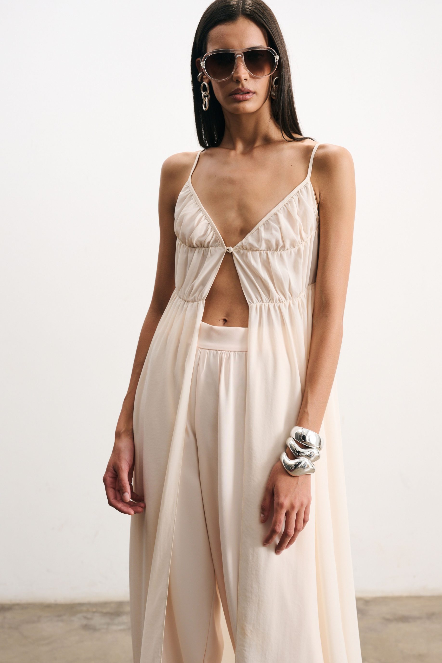 R$428,00 6 x R$71,33Blusa longa em crepe fino na cor pérola. Alcinhas finas e decote em “V”. O recorte frontal cria um jogo sutil de transparência e movimento, valorizando a silhueta de forma delicada. Possui franzido suave na linha do busto e cintura, caimento solto que confere leveza ao visual.
