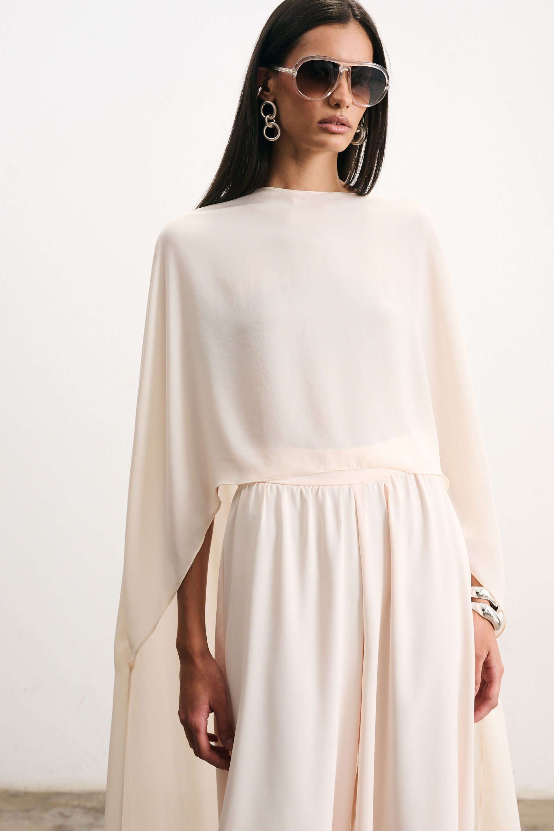 R$428,00 6 x R$71,33Blusa em crepe fino na cor pérola. Modelagem reta e caimento fluido. Possui mangas amplas que se prolongam formando uma capa delicada nas costas, criando movimento e elegância. O decote fechado equilibra a fluidez da peça, resultando em uma silhueta moderna e atemporal.