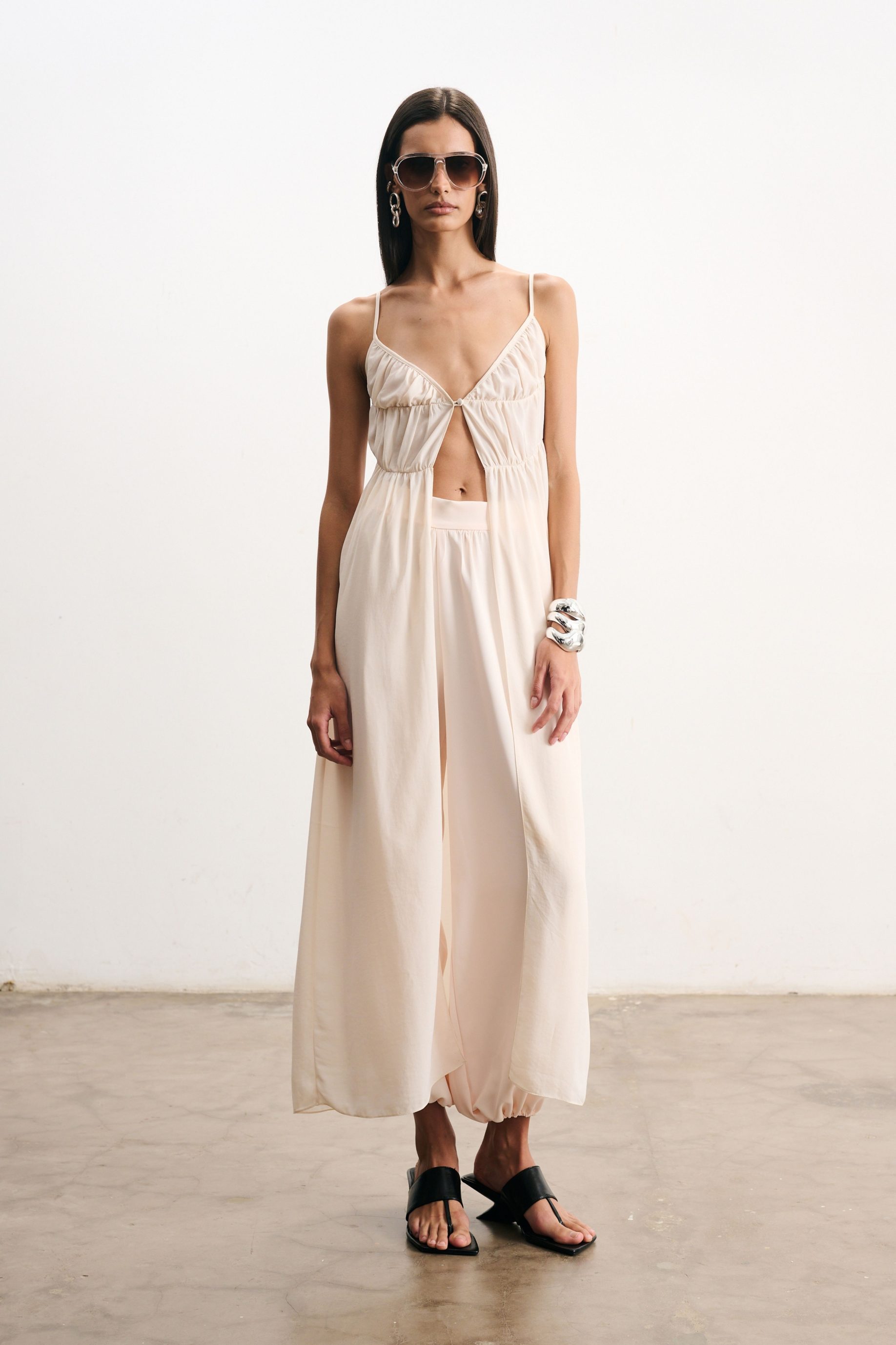 R$428,00 6 x R$71,33Blusa longa em crepe fino na cor pérola. Alcinhas finas e decote em “V”. O recorte frontal cria um jogo sutil de transparência e movimento, valorizando a silhueta de forma delicada. Possui franzido suave na linha do busto e cintura, caimento solto que confere leveza ao visual.