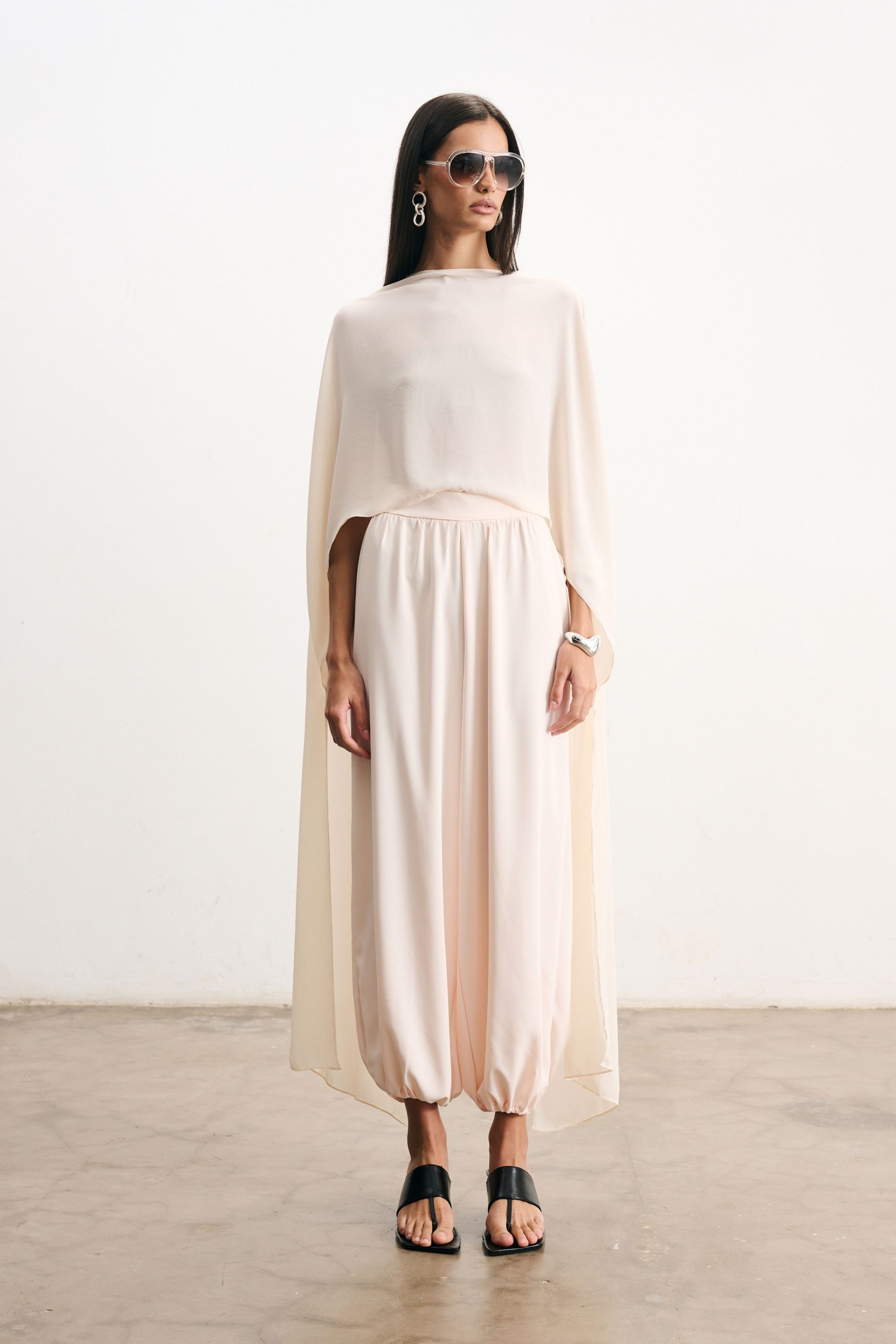 R$428,00 6 x R$71,33Blusa em crepe fino na cor pérola. Modelagem reta e caimento fluido. Possui mangas amplas que se prolongam formando uma capa delicada nas costas, criando movimento e elegância. O decote fechado equilibra a fluidez da peça, resultando em uma silhueta moderna e atemporal.