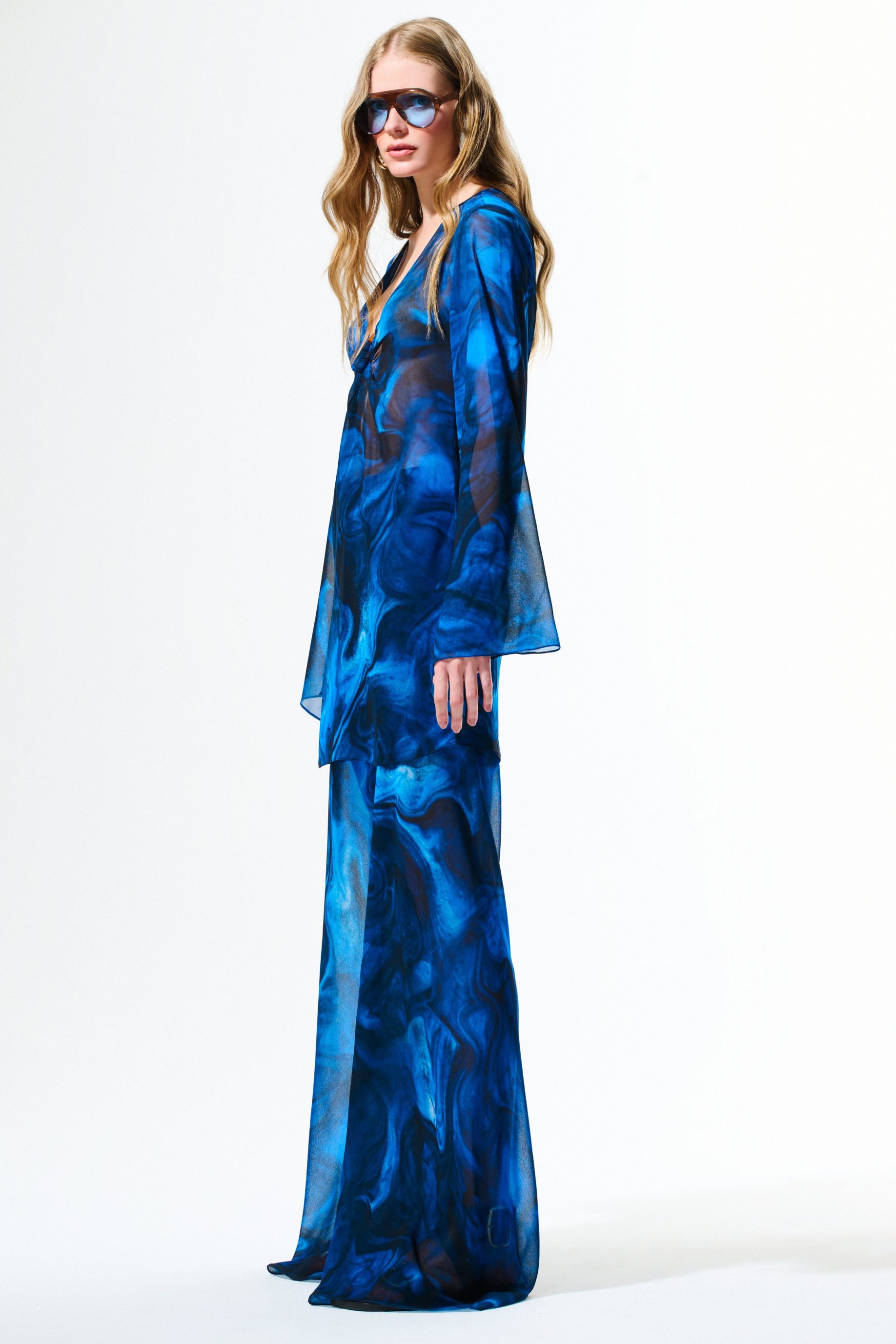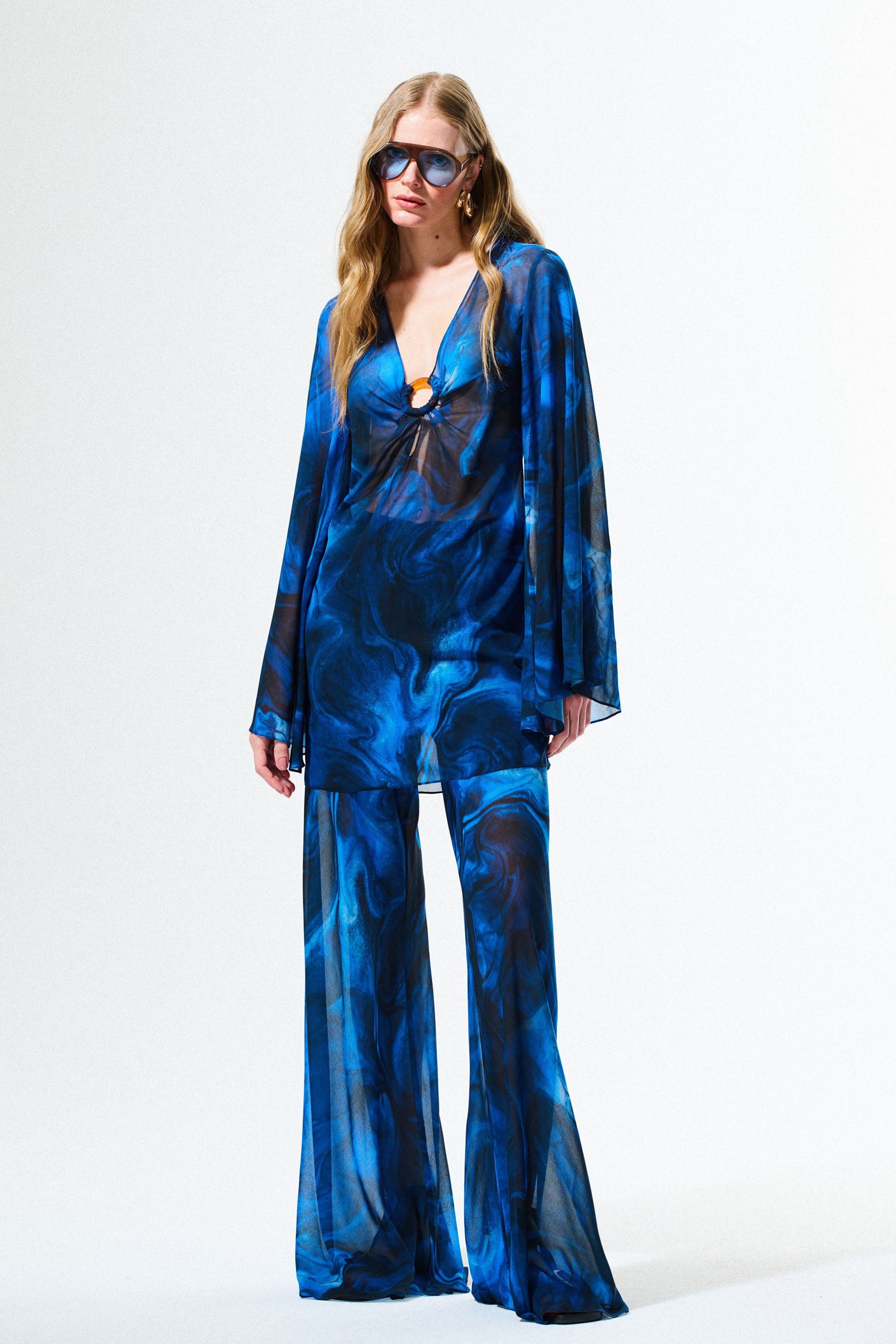 R$428,00 6 x R$71,33Bata de musseline com estampa digital exclusiva, manga sino ampla e detalhe de argola de acrílico tartaruga no busto. Possui comprimento alongado que permite ser usada também como vestido curto.