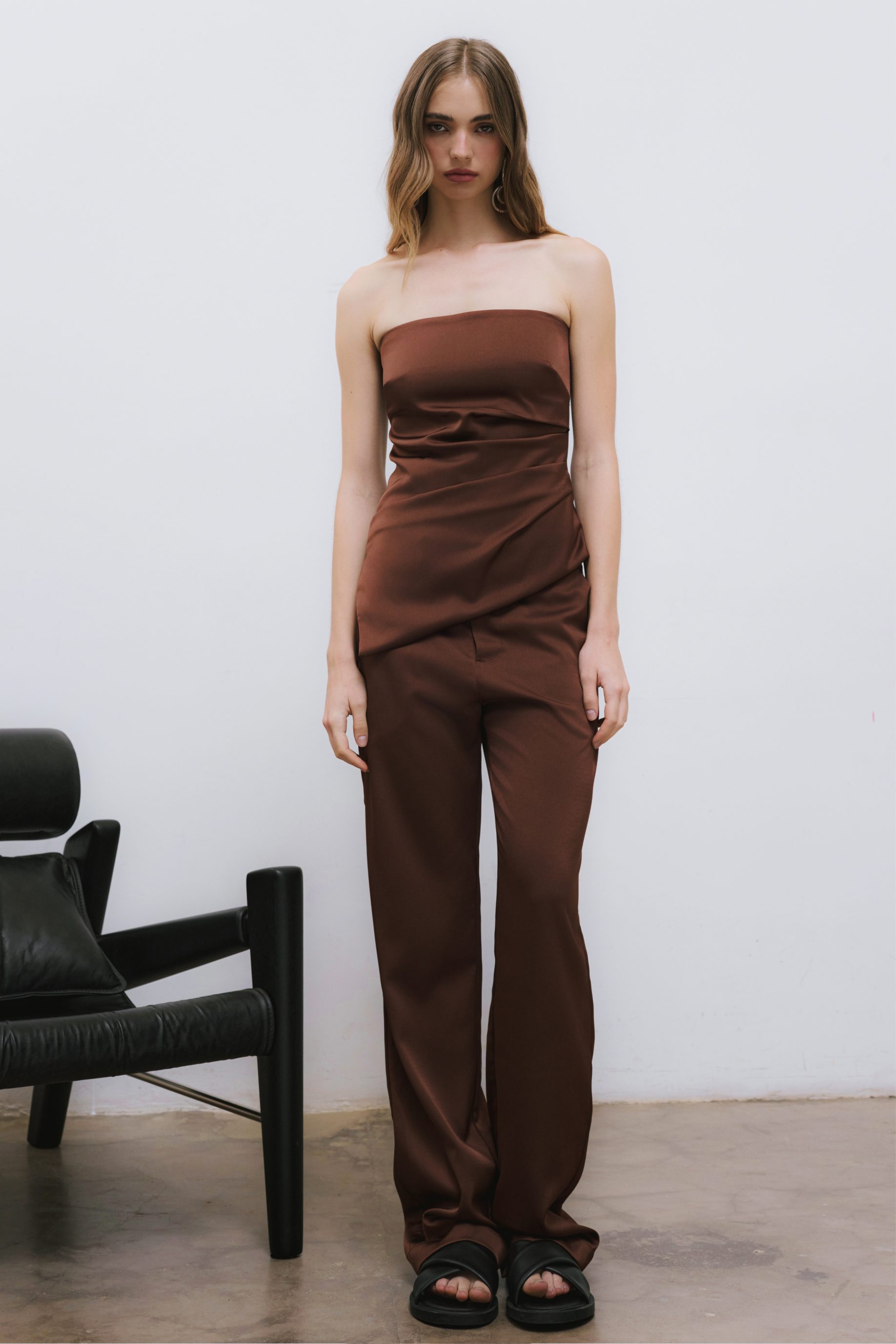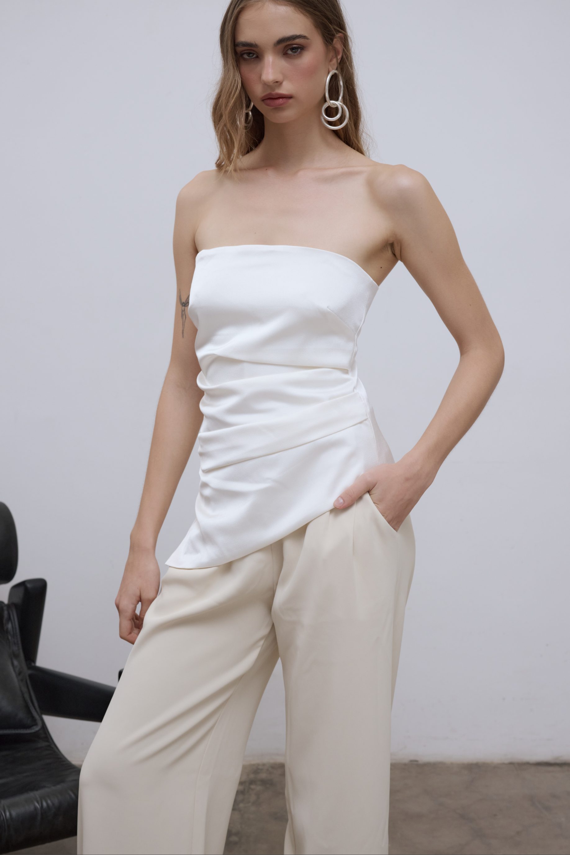 R$398,00R$148,00 6 x R$24,67Blusa estruturada de crepe acetinado com shape acinturado e forro embutido. Possui modelagem tomara que caia, barra assimétrica e drapeado na lateral. Fechamento com zíper invisível na parte de trás da peça.