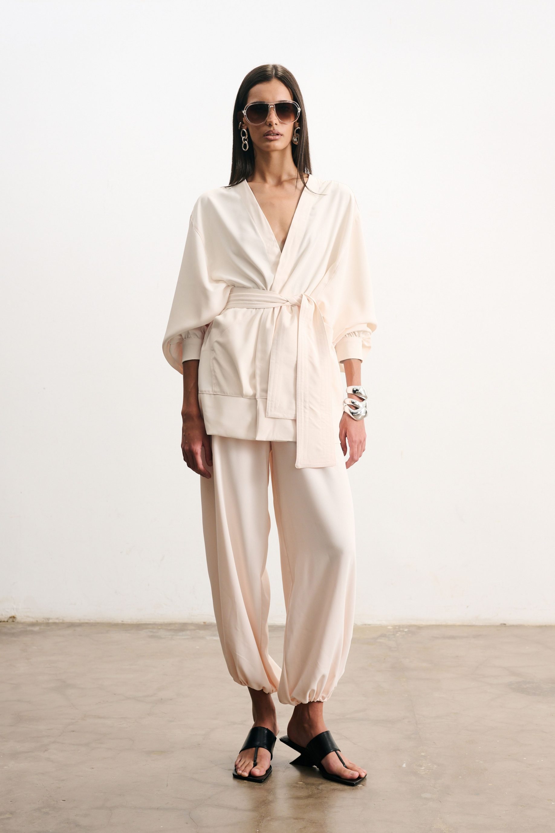 R$458,00 6 x R$76,33Calça estilo Aladim em crepe fluido com caimento leve e toque acetinado na cor pérola. O modelo apresenta cós alto e elástico ajustado nos tornozelos, criando um volume elegante e moderno na silhueta.