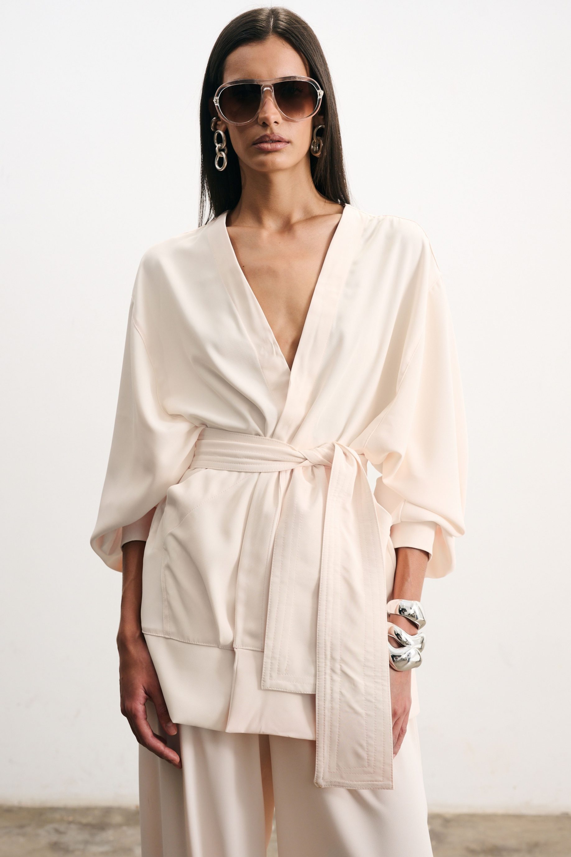 R$468,00 6 x R$78,00Jaqueta Kimono em crepe pérola. Possui modelagem ampla, com manga comprida e bufante, com bolso embutido com pregas. Acompanha faixa para amarração.