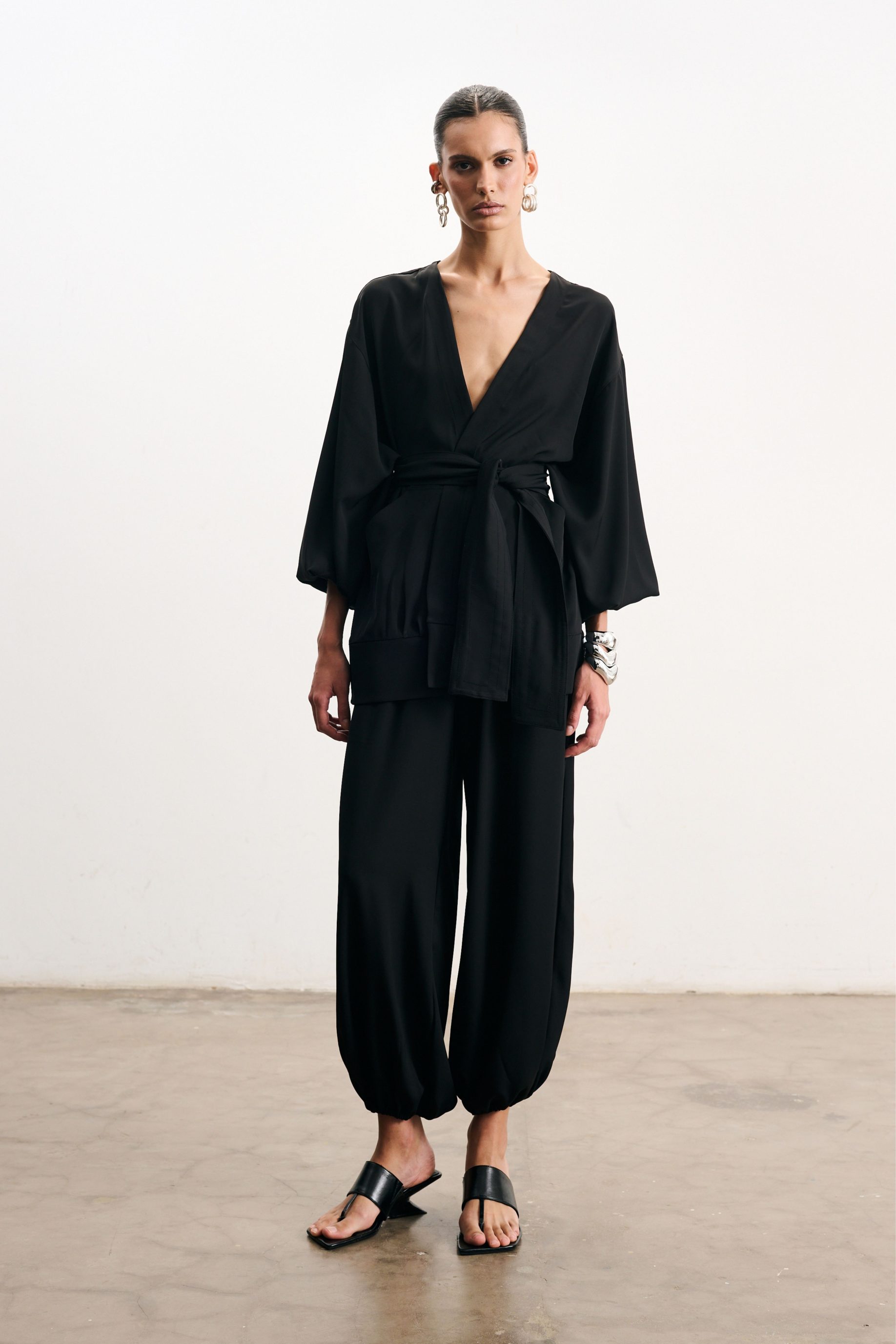 R$458,00 6 x R$76,33Calça estilo Aladim em crepe fluido com caimento leve e toque acetinado na cor preta. O modelo apresenta cós alto e elástico ajustado nos tornozelos, criando um volume elegante e moderno na silhueta.