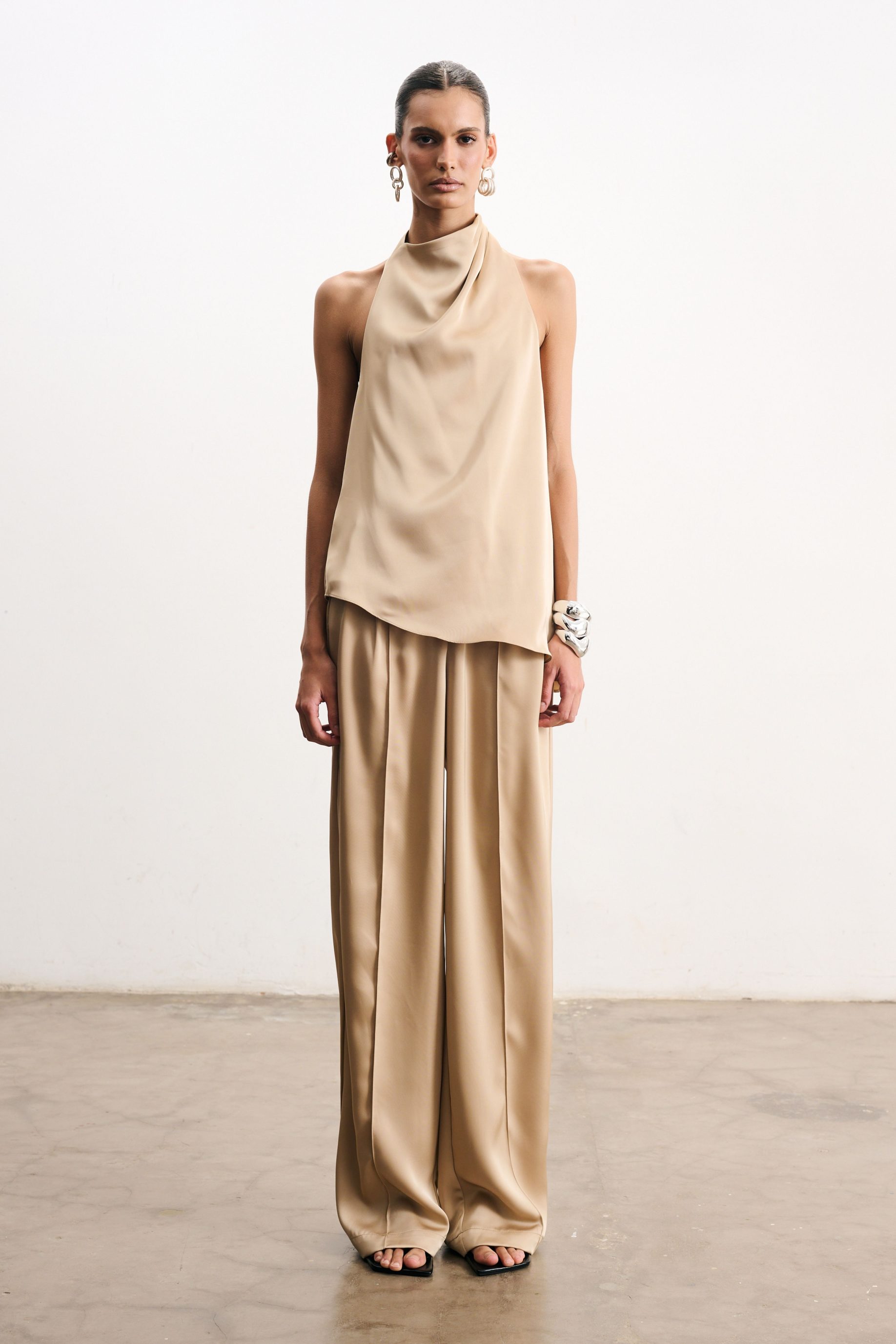Calça de alfaiataria em cetim macadâmia, toda forrada, modelagem reta e caimento fluido. Possui cintura média, pregas frontais que valorizam a silhueta e fechamento por zíper e gancho embutidos, garantindo sofisticação e conforto.