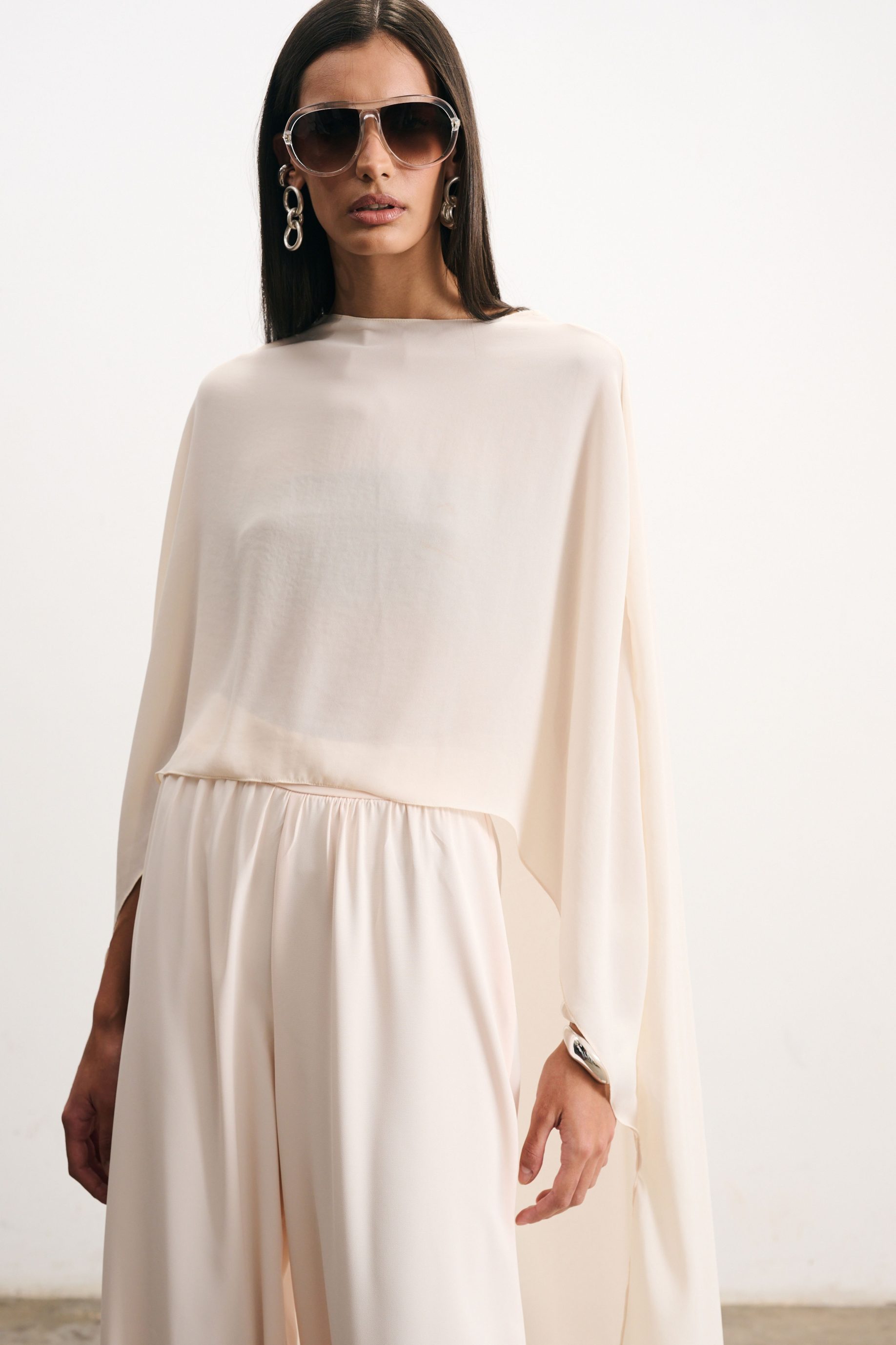 Calça de alfaiataria em cetim offwhite, toda forrada, modelagem reta e caimento fluido. Possui cintura média, pregas frontais que valorizam a silhueta e fechamento por zíper e gancho embutidos, garantindo sofisticação e conforto.
