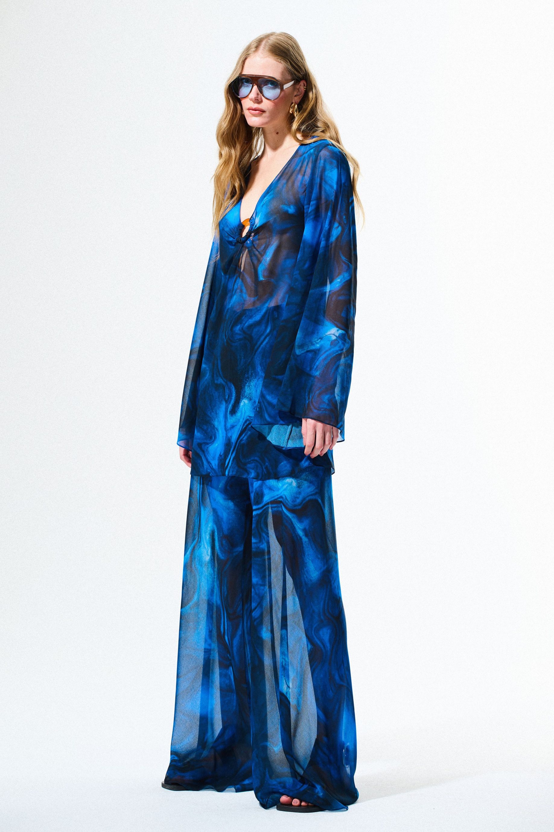 R$428,00 6 x R$71,33Calça pantalona de musseline com estampa exclusiva, cós com elástico e cordinha do mesmo tecido para regular o tamanho da cintura. Cortada no viés para um caimento perfeito mas pernas. Pode ser usada com cintura alta ou baixa.