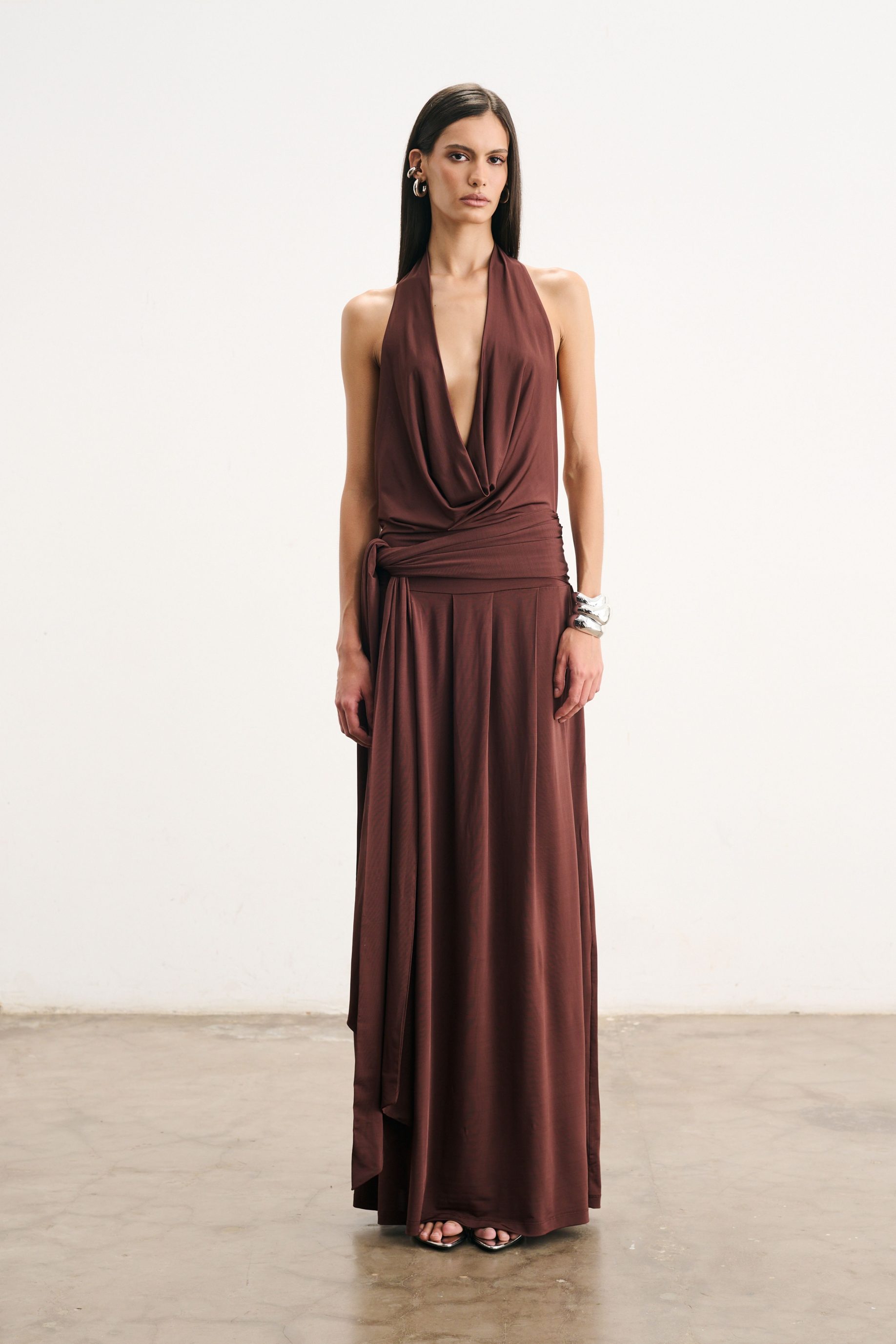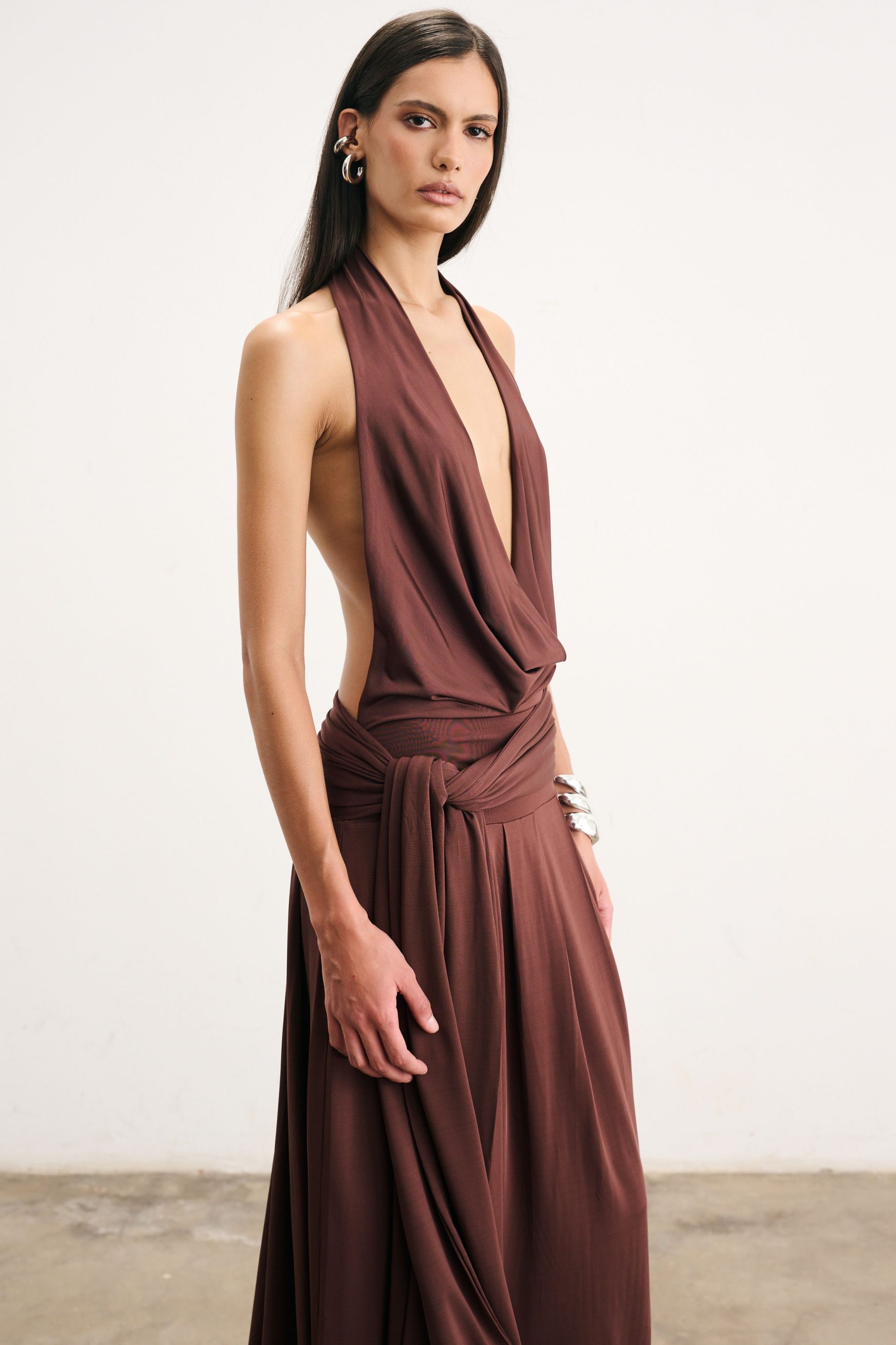 R$798,00 6 x R$133,00Vestido em Jersey de viscose, marrom, com decote profundo em “V” e amarração frontal que realça a cintura com elegância. A modelagem soltinha e o tecido leve proporcionam movimento, enquanto as costas abertas e o caimento suave trazem um toque de sensualidade sofisticada. Ideal para eventos noturnos ou ocasiões especiais que pedem um visual marcante e moderno.