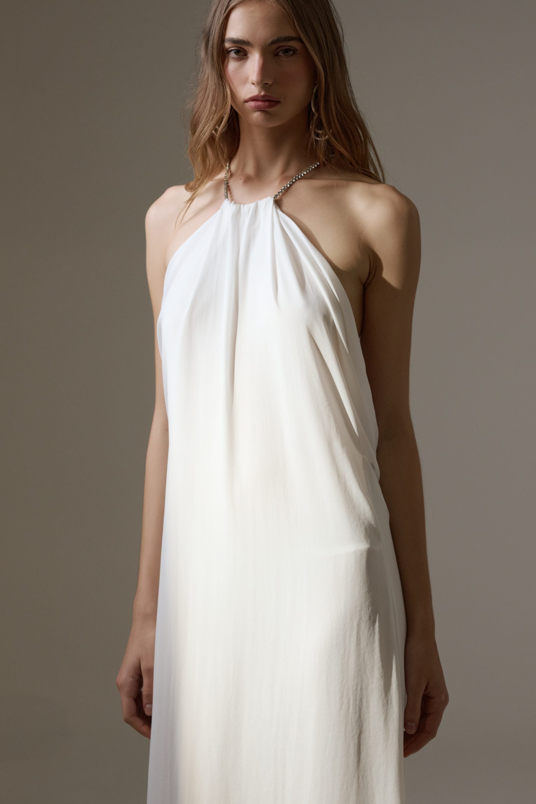 R$1.398,00 6 x R$233,00Vestido longo de crepe com caimento fluido, forrado do próprio tecido. Possui modelagem frente única, com tira de strass cruzadas nas costas.