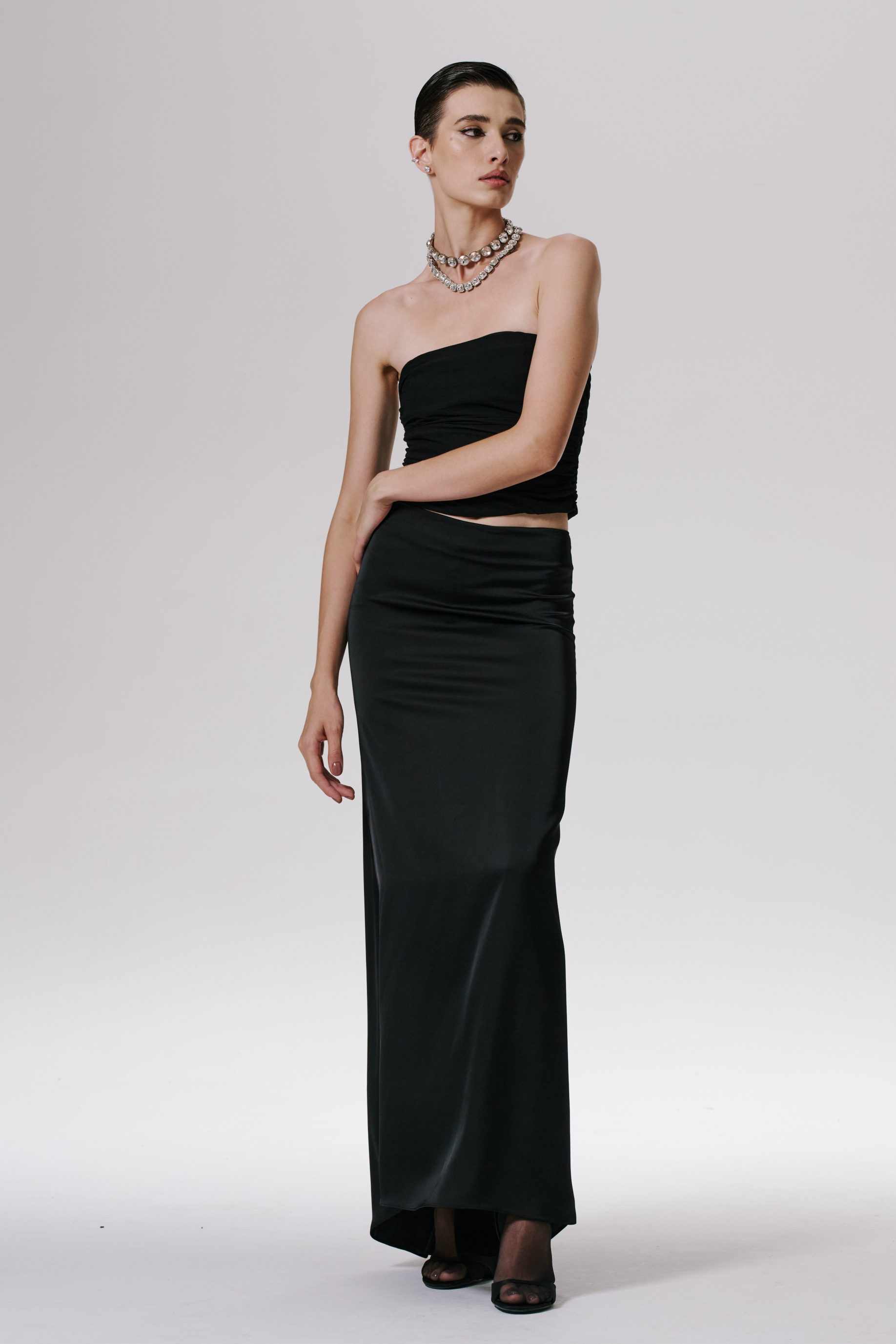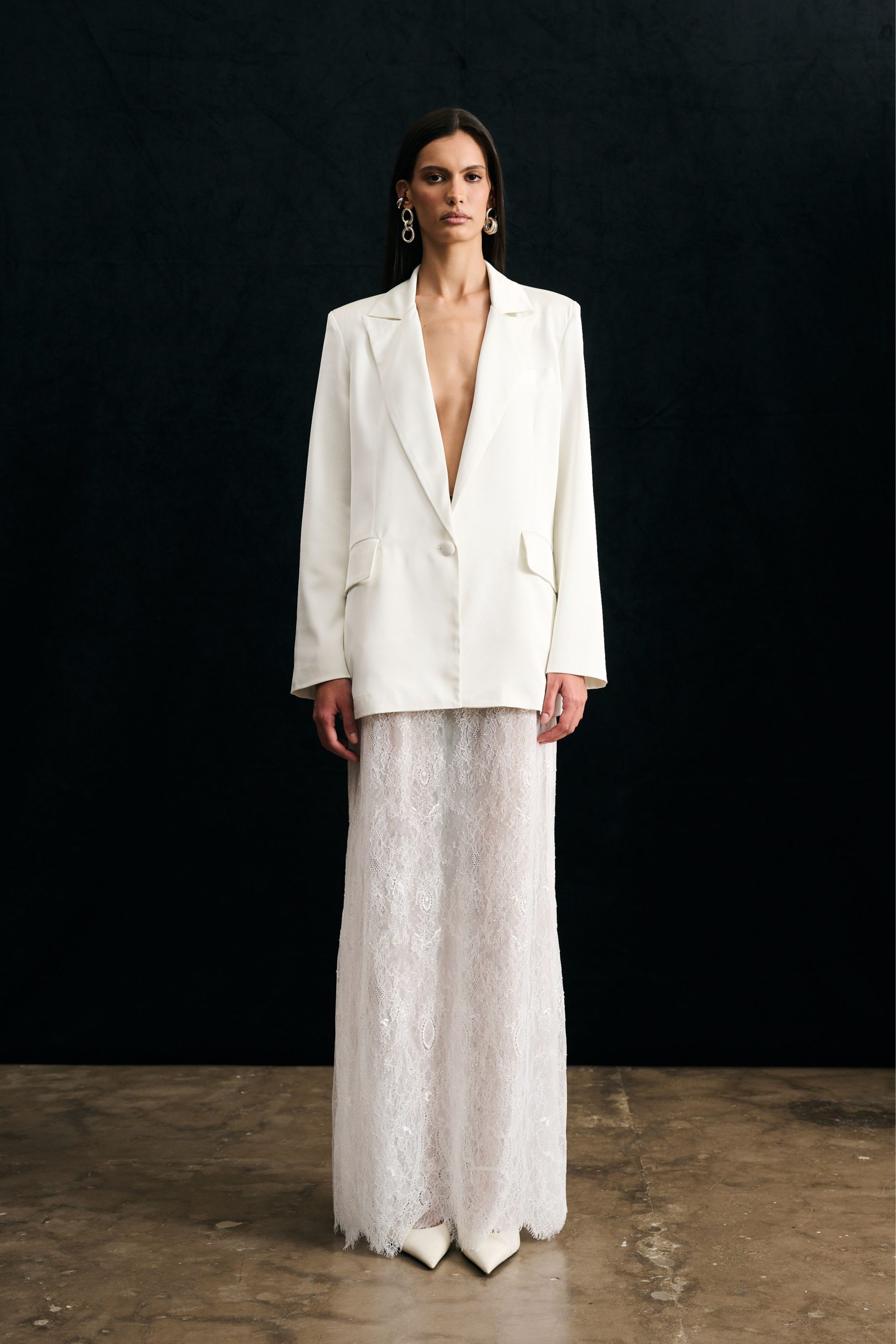 R$998,00 6 x R$166,33Saia longa de renda chantilly, toda dupla, modelagem levemente sereia e cintura baixa. Modela o corpo com delicadeza e personalidade.