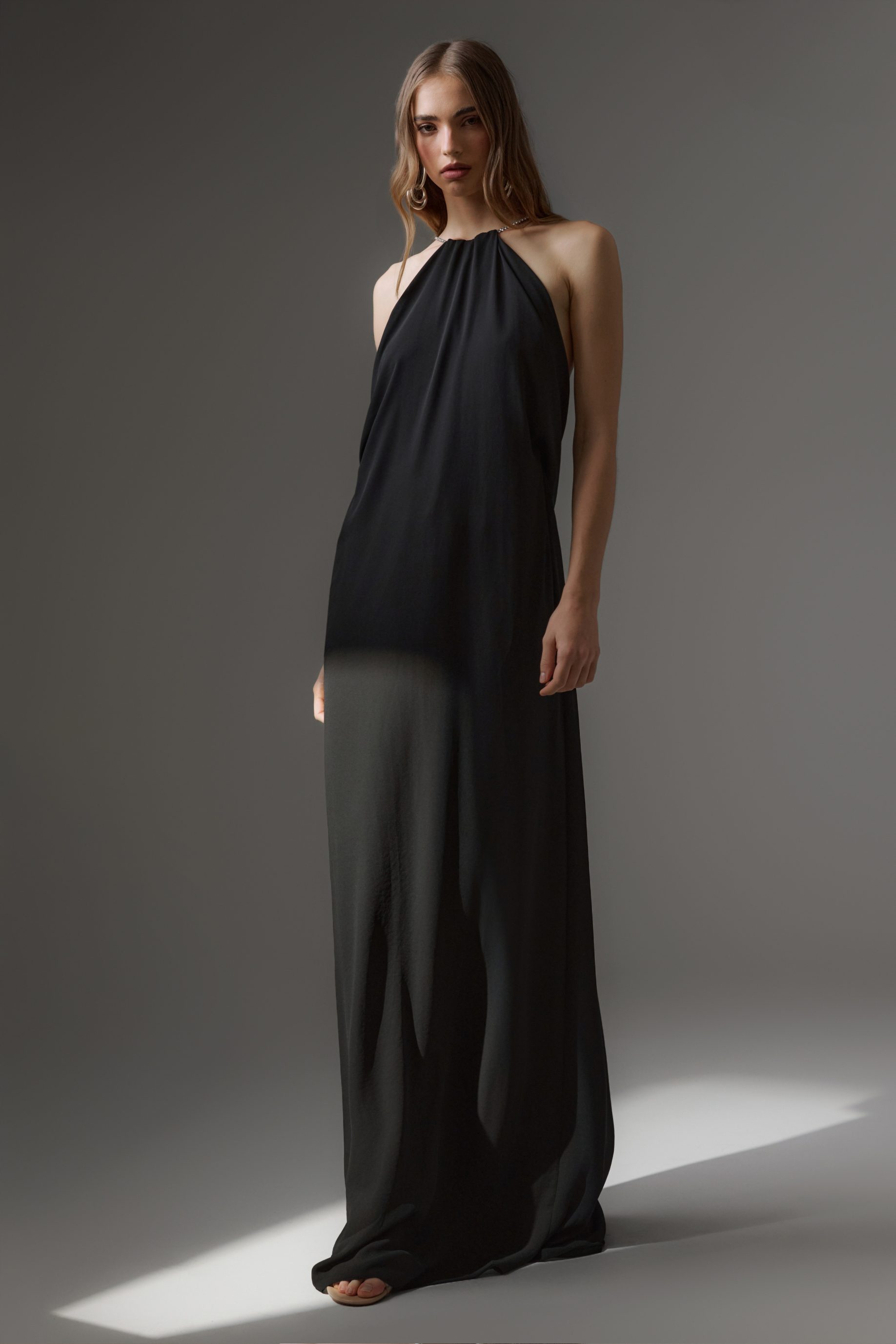 Vestido longo em crepe, todo duplo. Modelo com decote em V com a parte superior toda drapeada frente e costas. Saia com caimento reto fluído. Possui fechamento de zíper invisível nas costas.