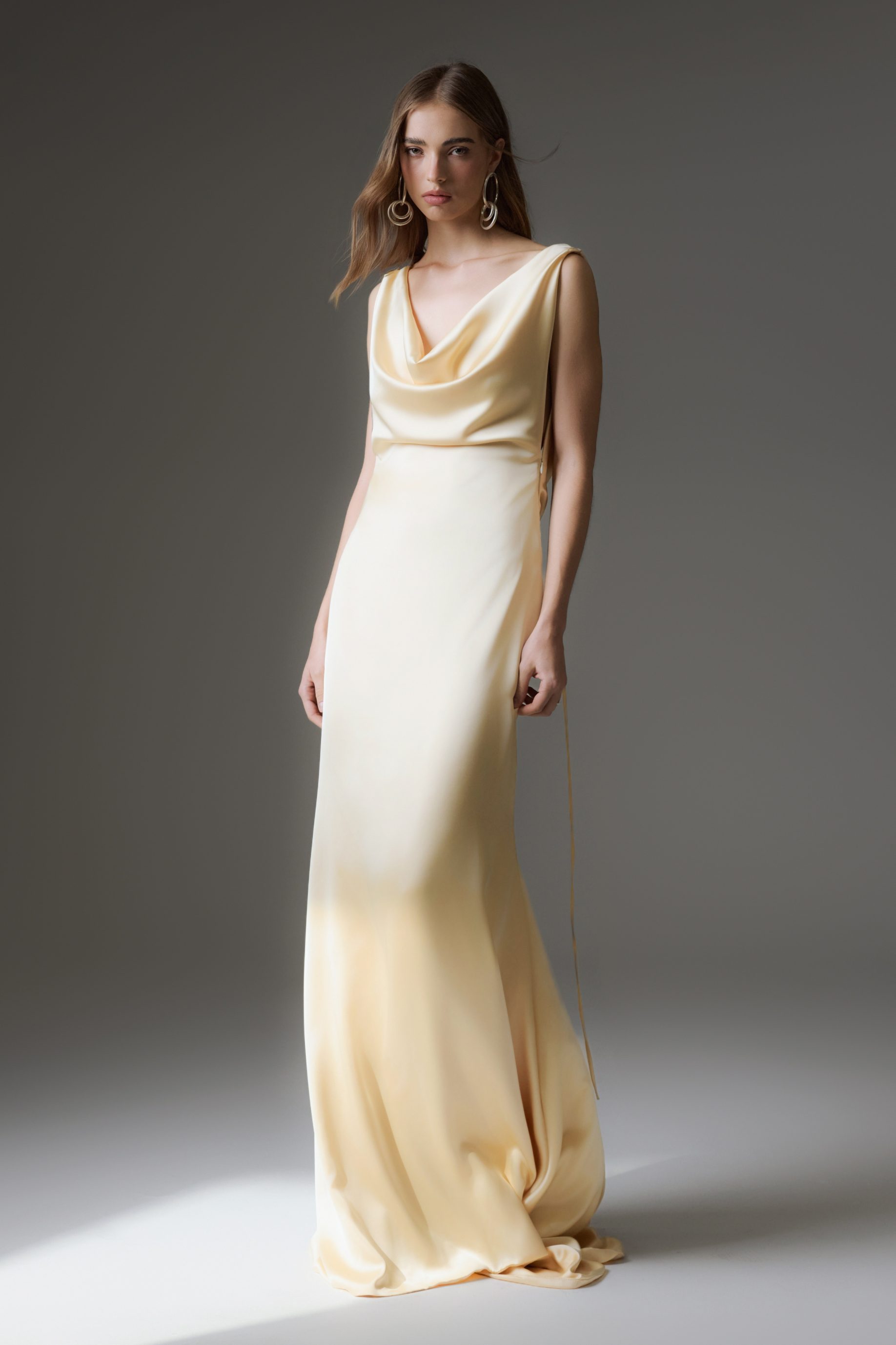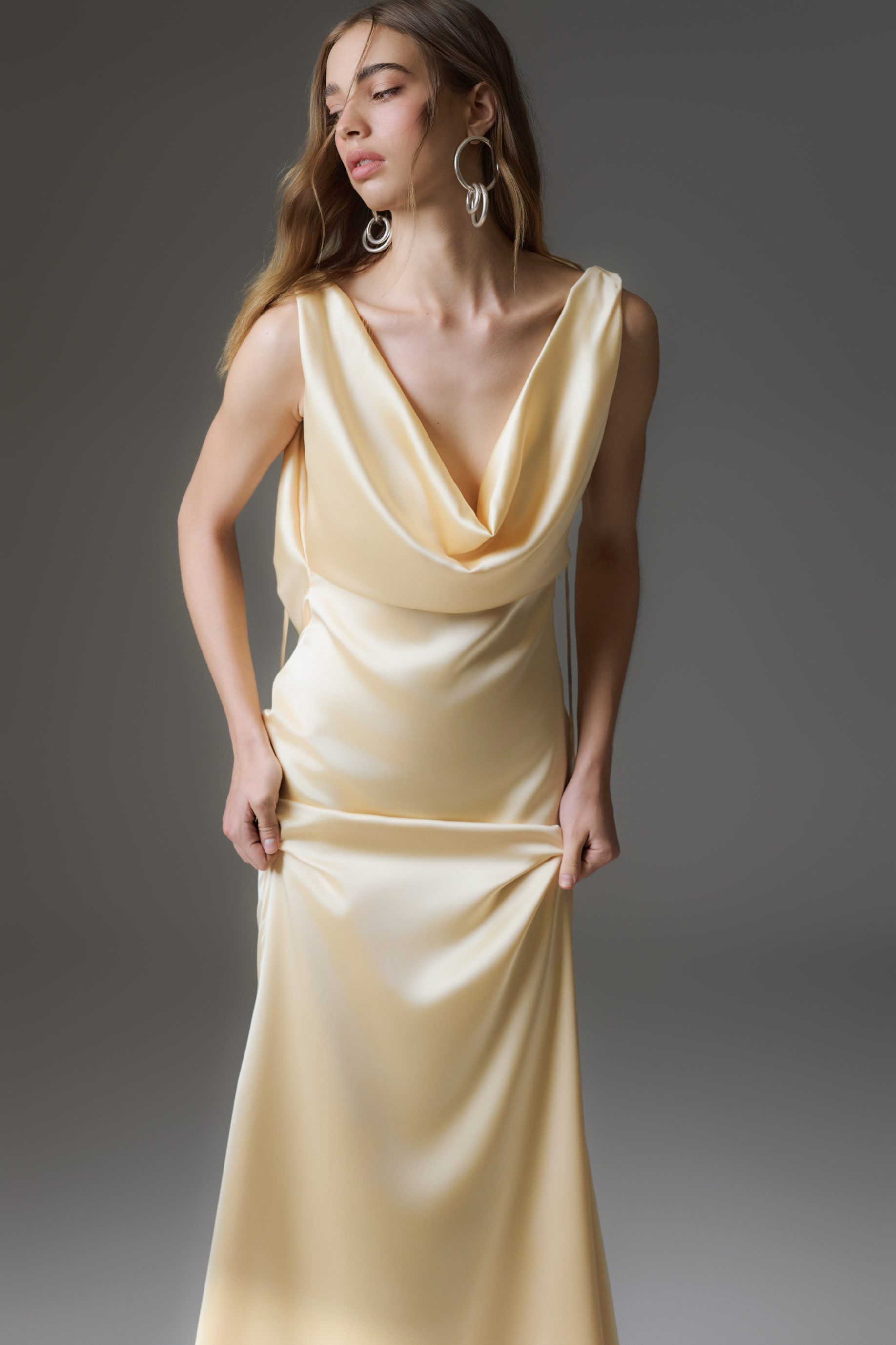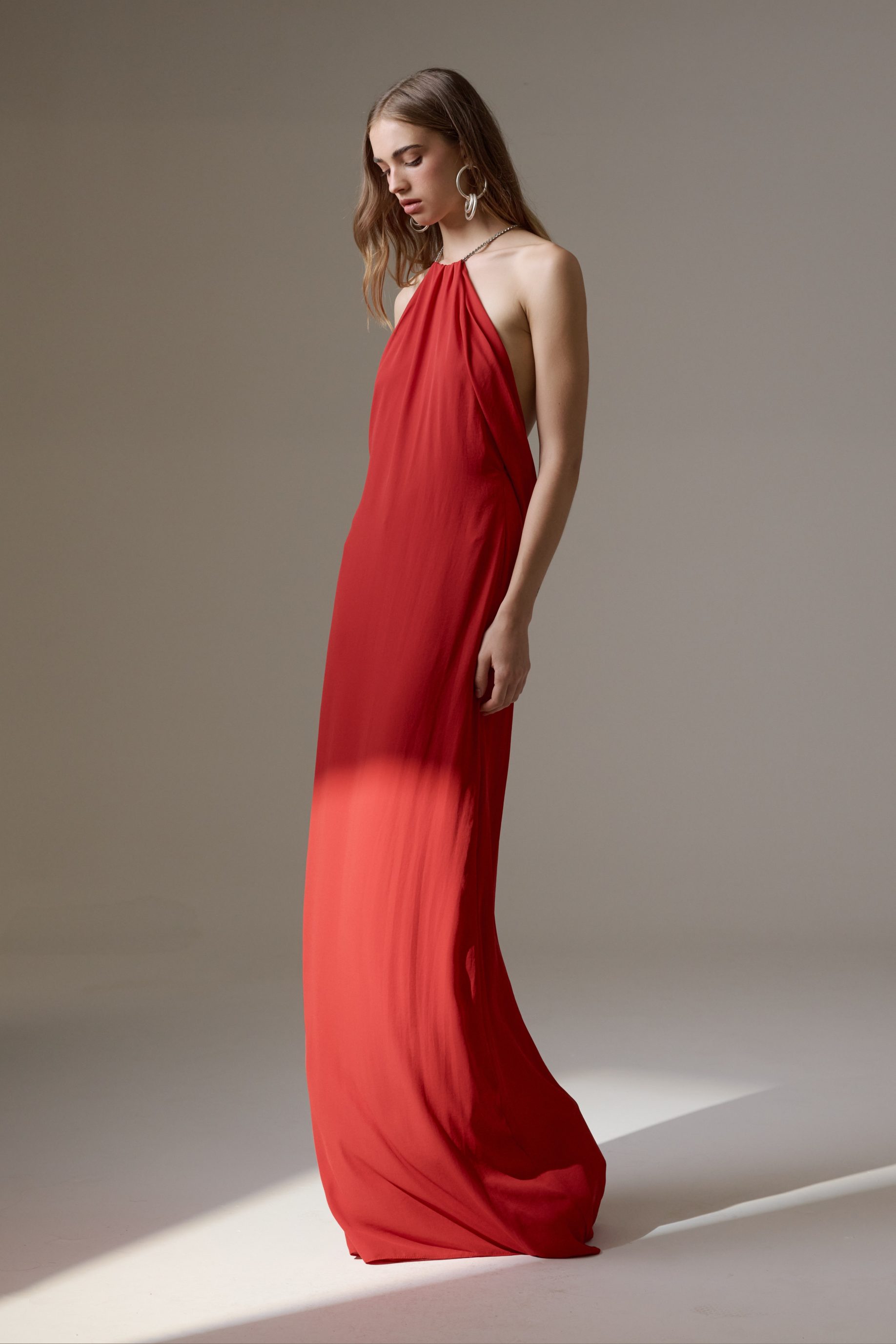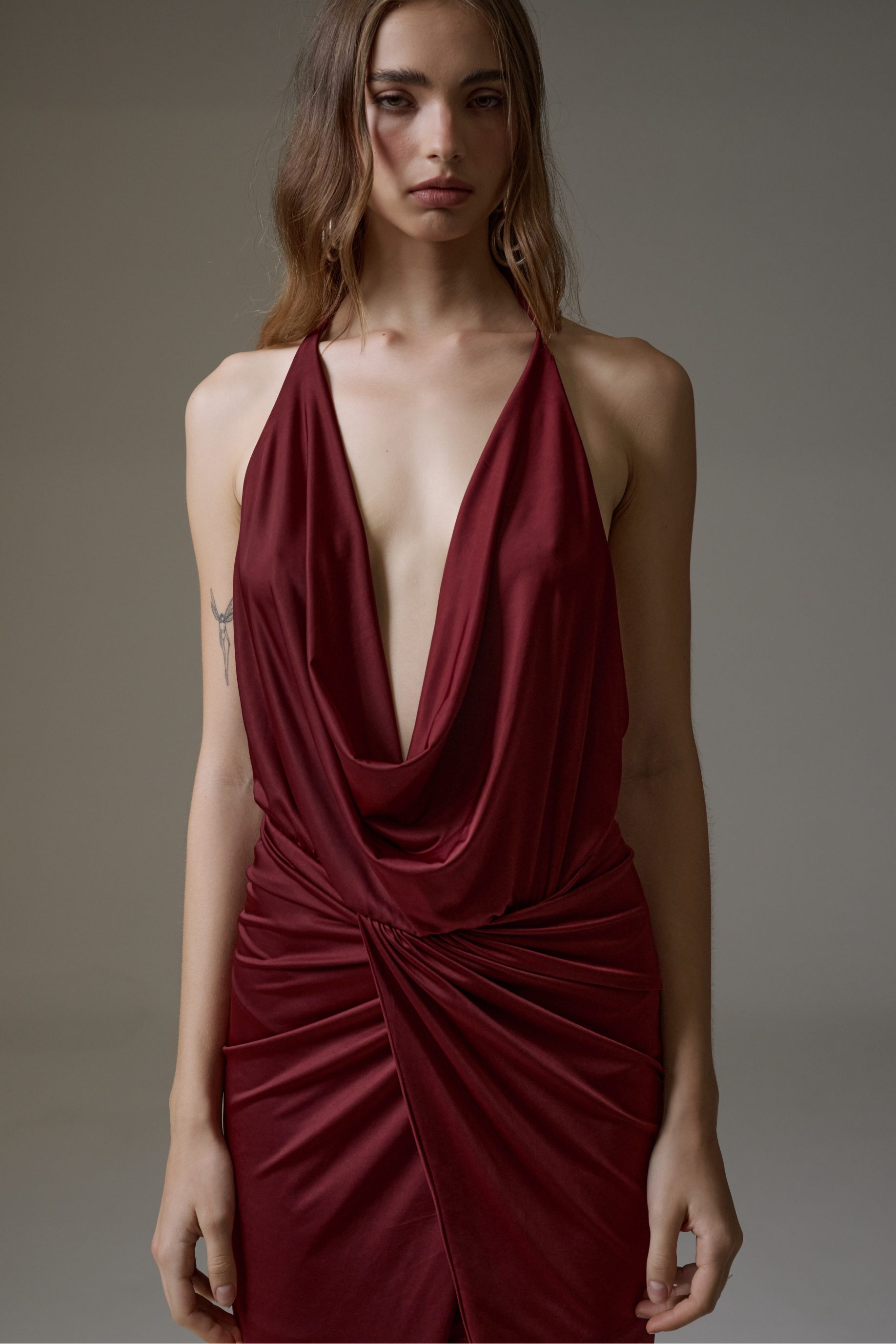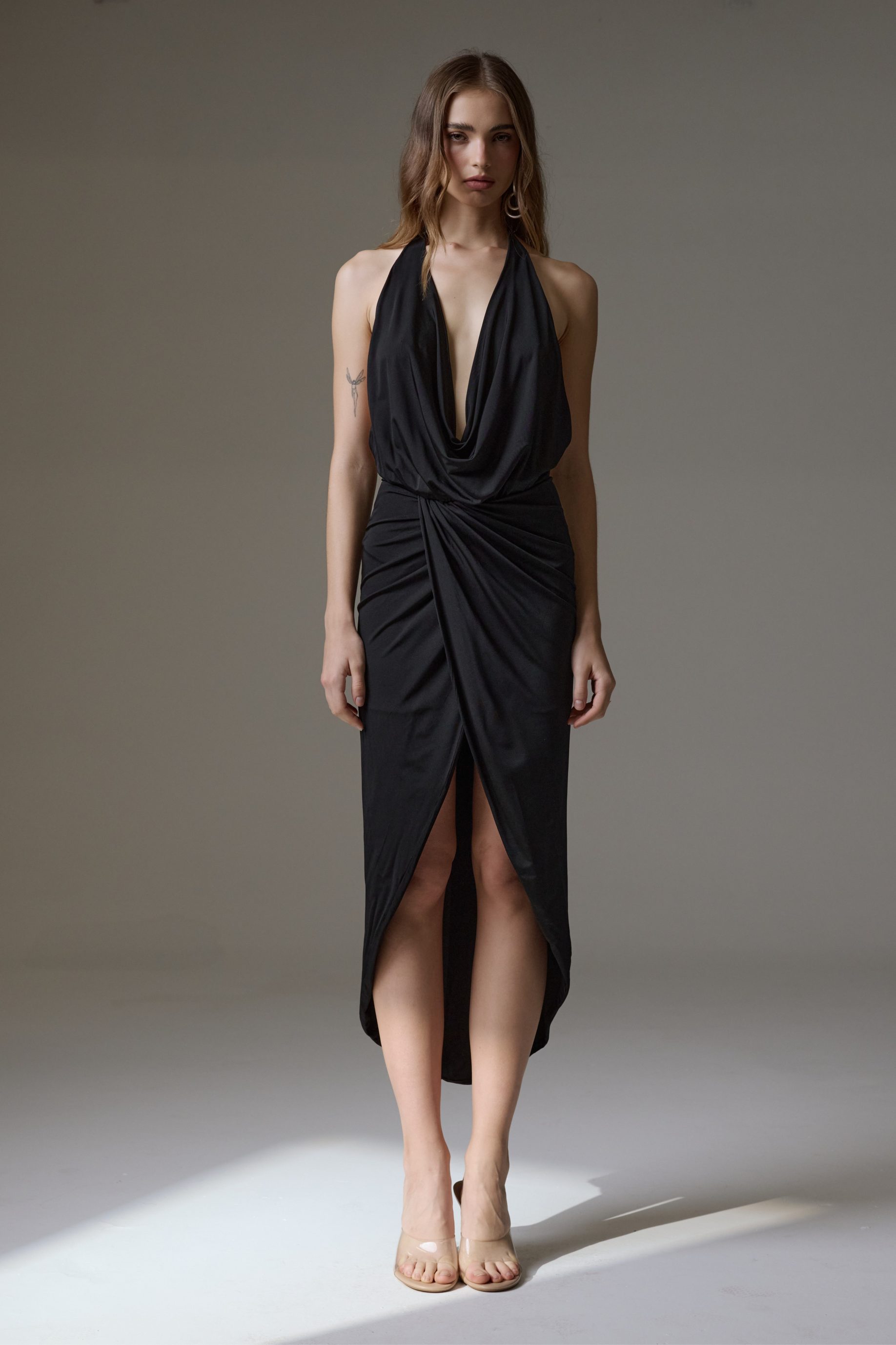 Vestido midi de malha jersey, todo duplo. Modelo frente única com decote slip e ajuste de amarração no pescoço, saia drapeada com transpasse. Possui fechamento de zíper invisível nas costas.