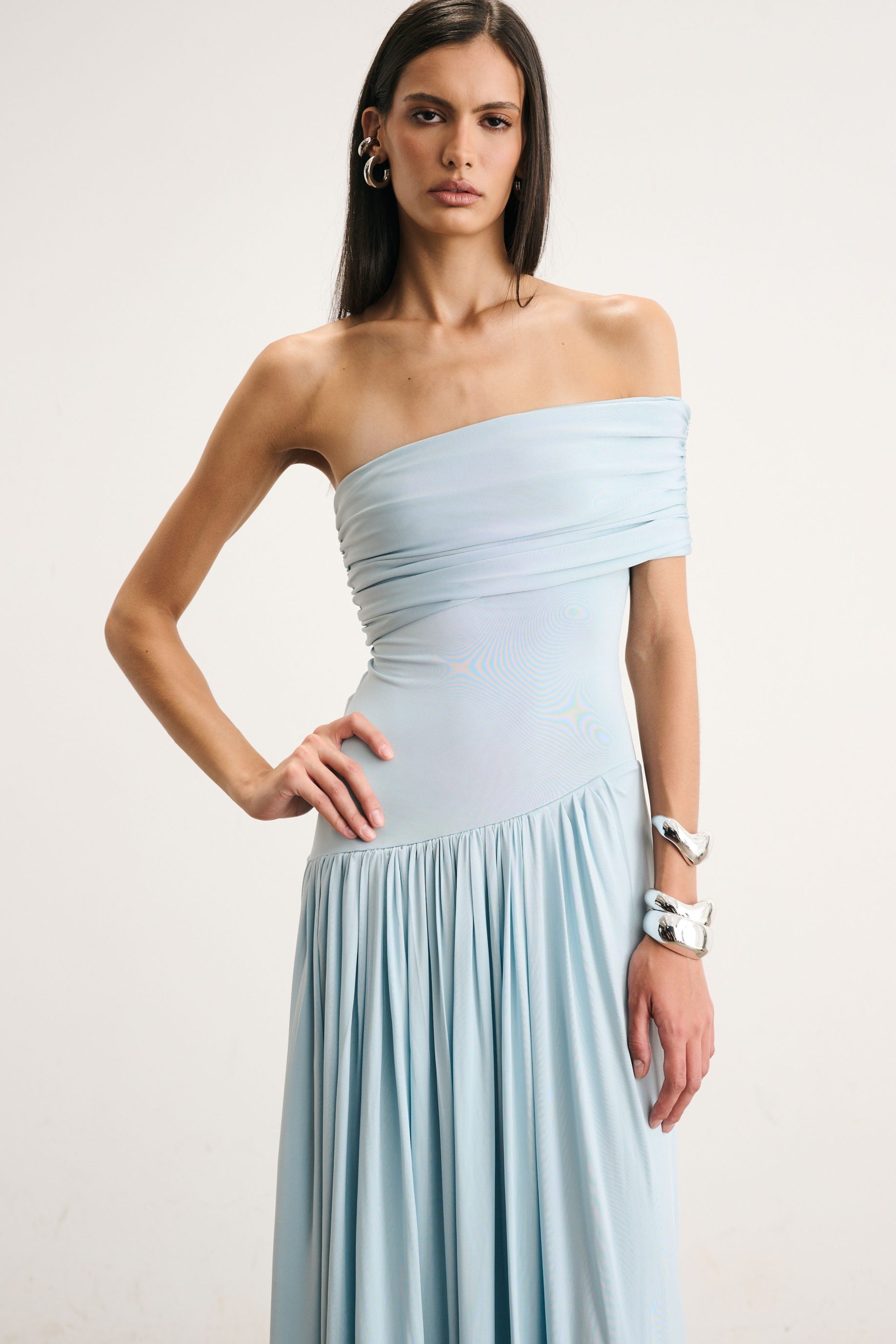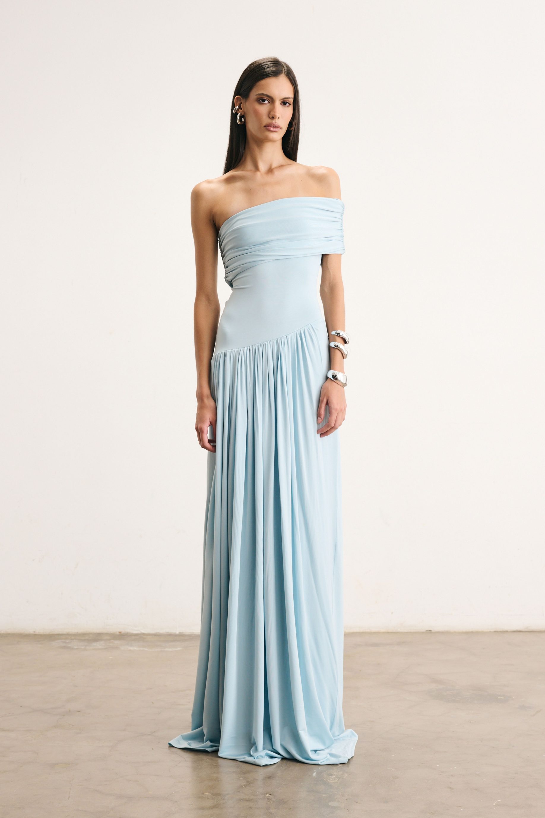 R$998,00 6 x R$166,33Vestido confeccionado em Jersey de viscose, na cor azul claro. O modelo ombro a ombro possui drapeado na região do busto, criando um visual delicado e sofisticado. A saia ampla com franzido traz movimento e elegância, equilibrando conforto e feminilidade. Uma peça atemporal, perfeita para ocasiões especiais.