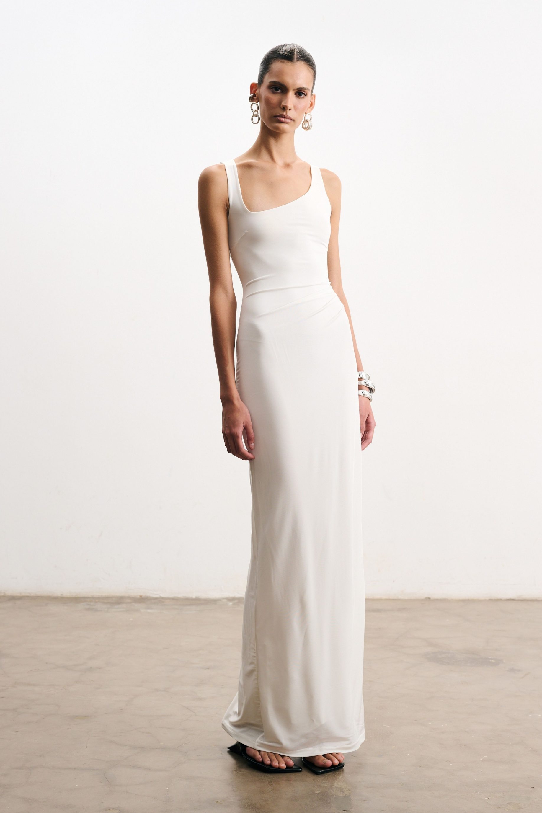 Vestido longo em jersey off white, todo forrado no mesmo tecido. Modelagem fluida com costas abertas e amarração delicada na cintura, valorizando as curvas de forma sutil e feminina.