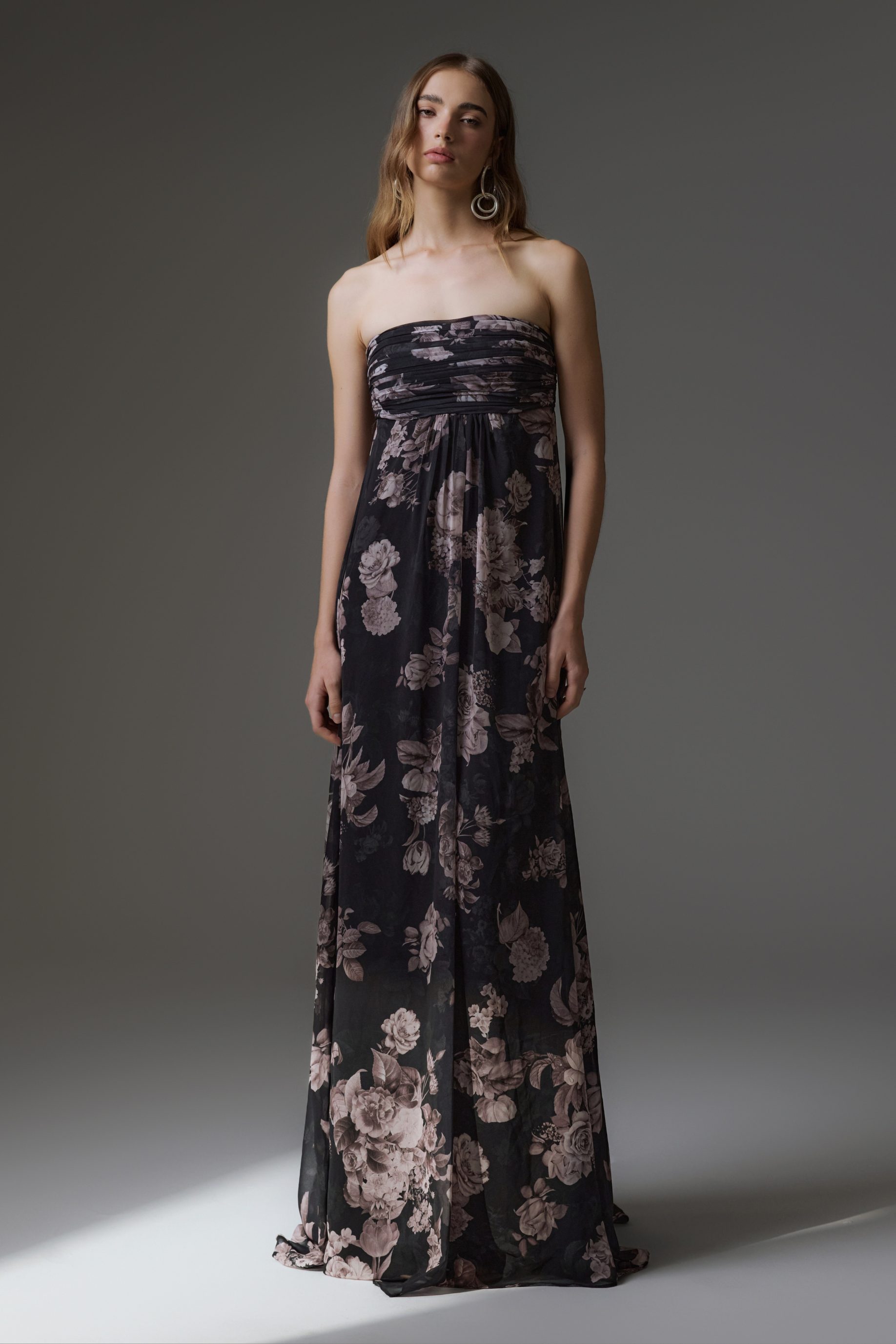 R$1.398,00 6 x R$233,00Vestido longo de musseline com estampa digital exclusiva, com forro embutido de crepe, modelagem ampla. Possui decote tomara que caia com detalhes de pregas. Fechamento nas costas com zíper invisível e cauda.