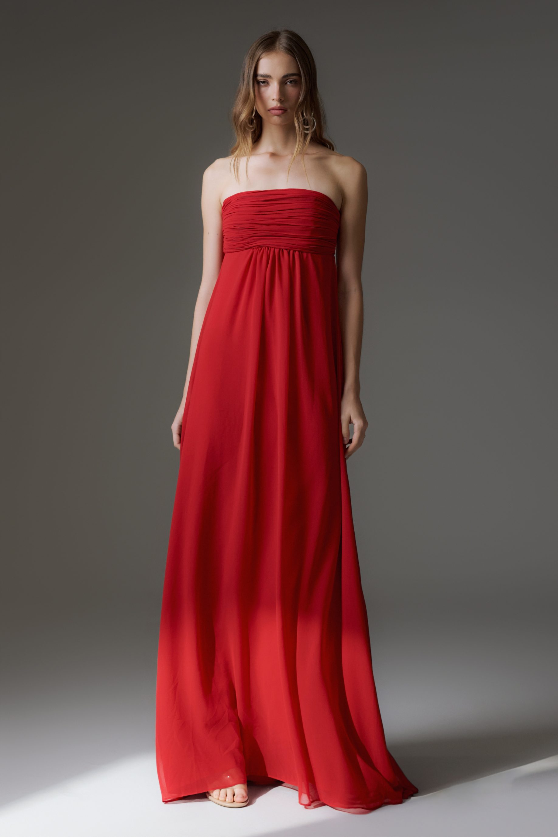 R$1.398,00 6 x R$233,00Vestido longo de musseline, com forro embutido de crepe, modelagem ampla. Possui decote tomara que caia com detalhes de pregas. Fechamento nas costas com zíper invisível e cauda.