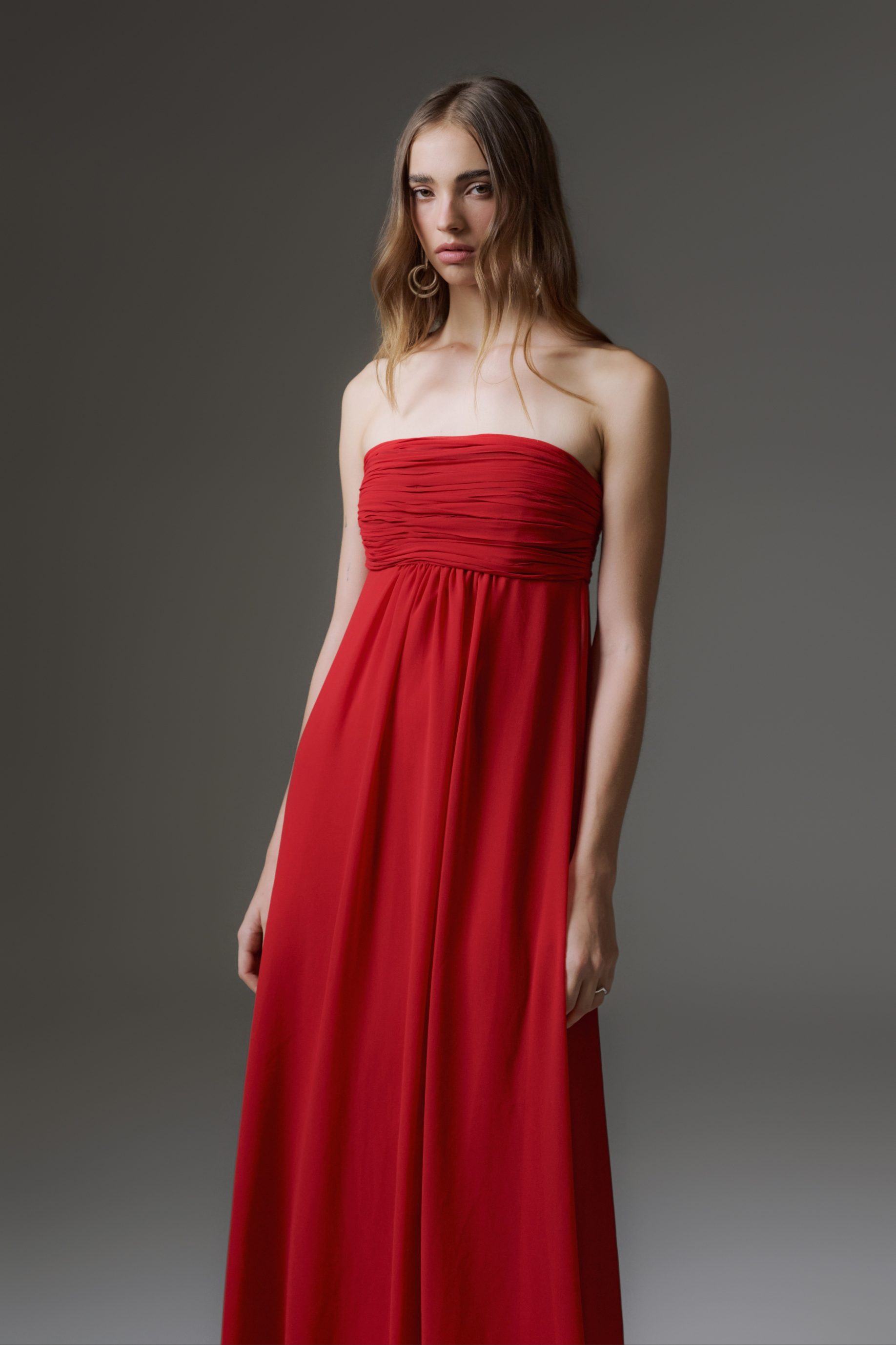 R$1.398,00 6 x R$233,00Vestido longo de musseline, com forro embutido de crepe, modelagem ampla. Possui decote tomara que caia com detalhes de pregas. Fechamento nas costas com zíper invisível e cauda.