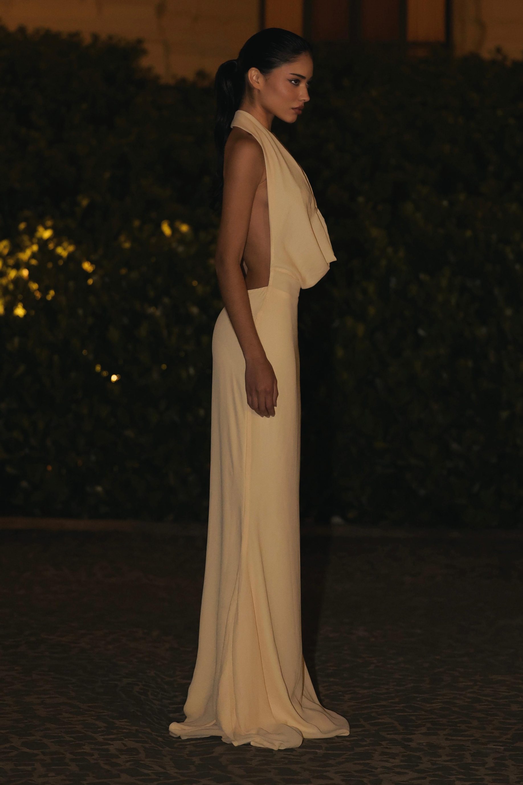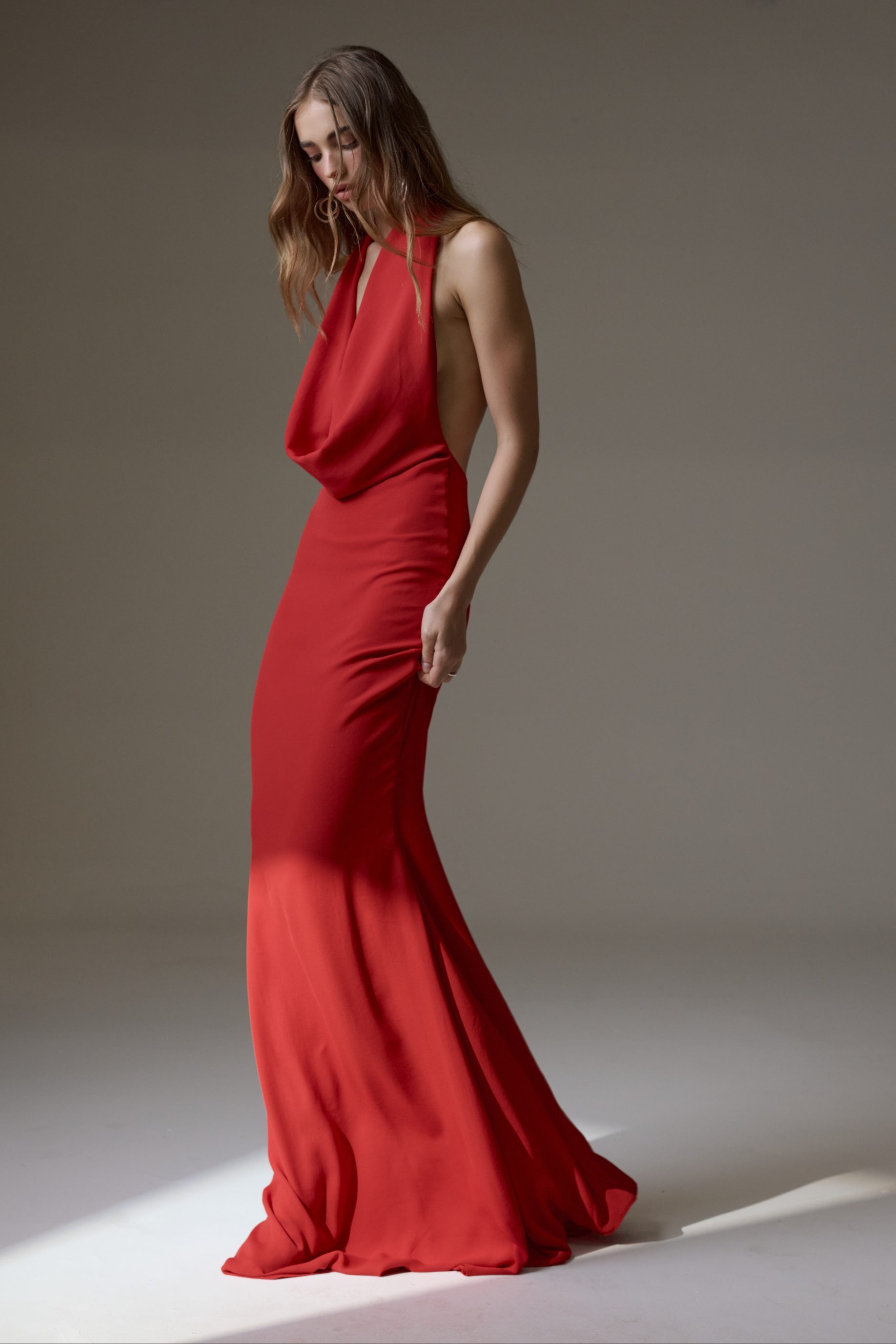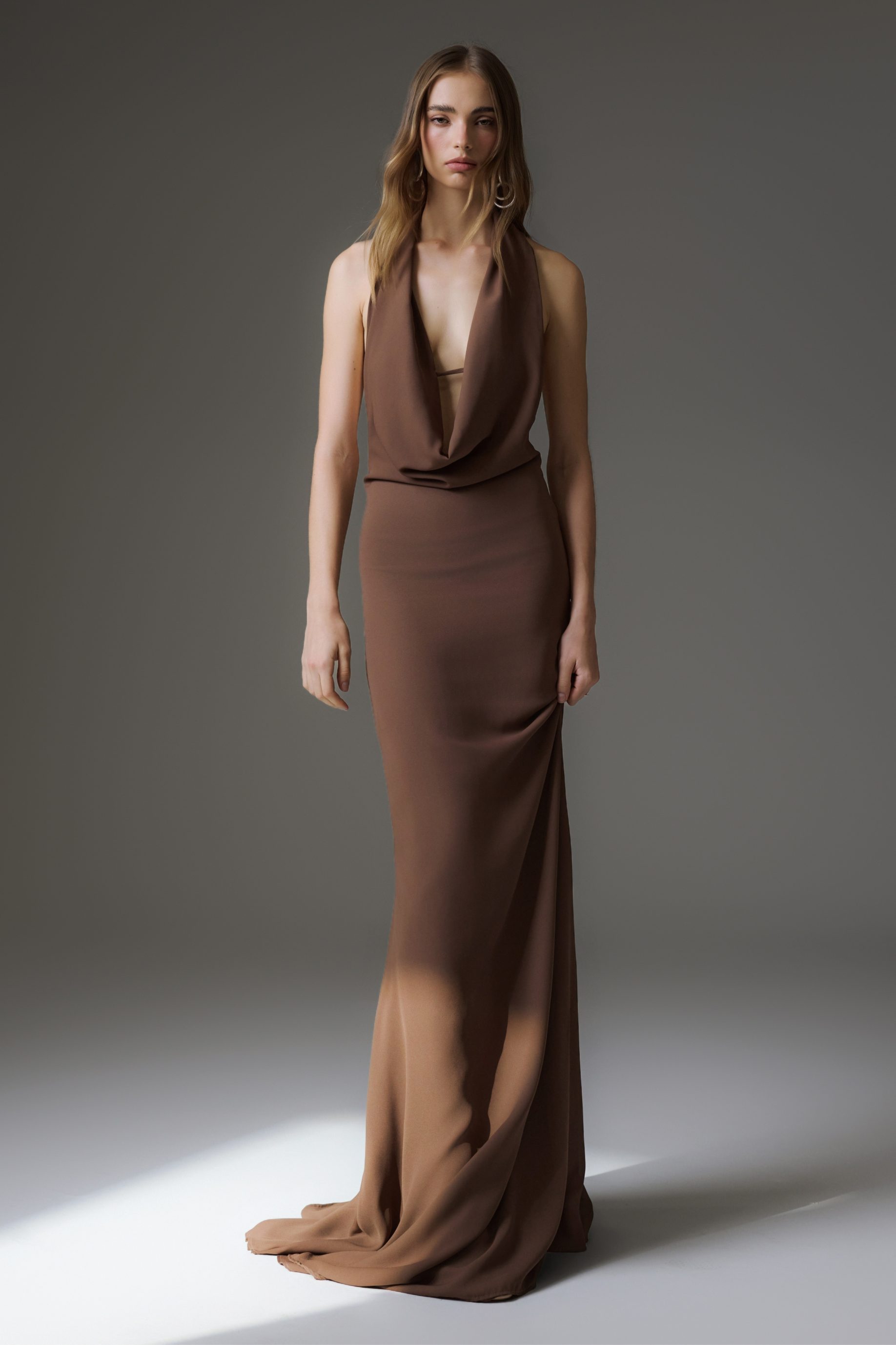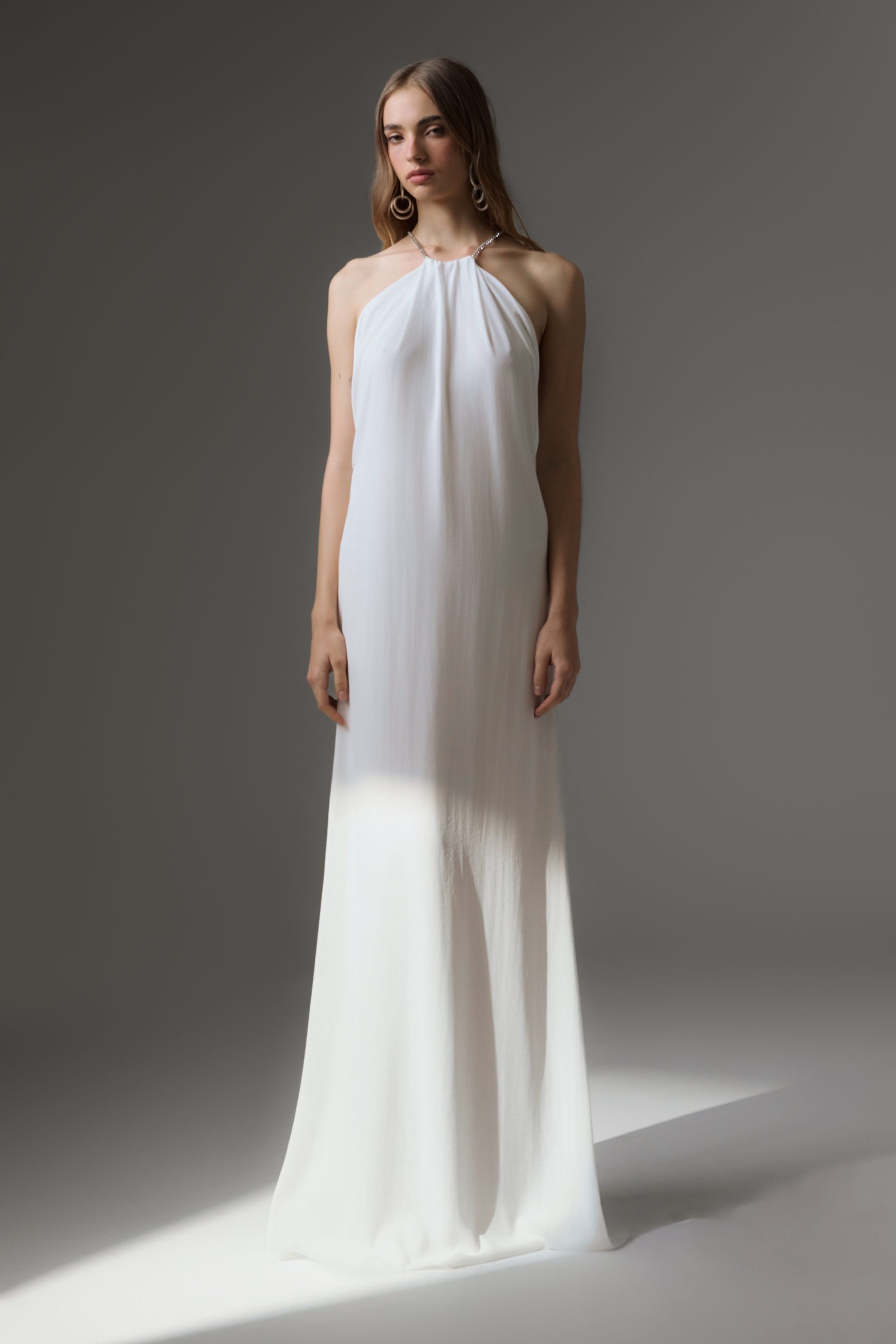 R$1.398,00 6 x R$233,00Vestido longo de crepe com caimento fluido, forrado do próprio tecido. Possui modelagem frente única, com tira de strass cruzadas nas costas.