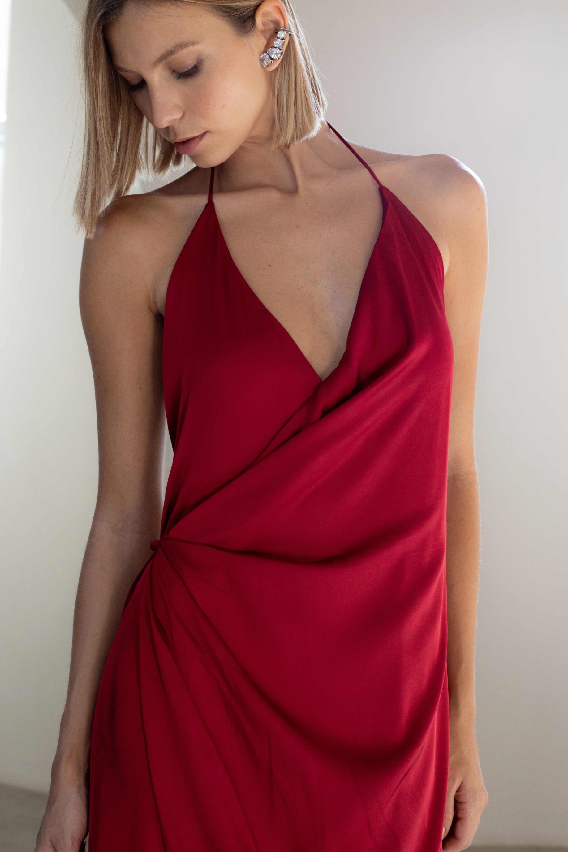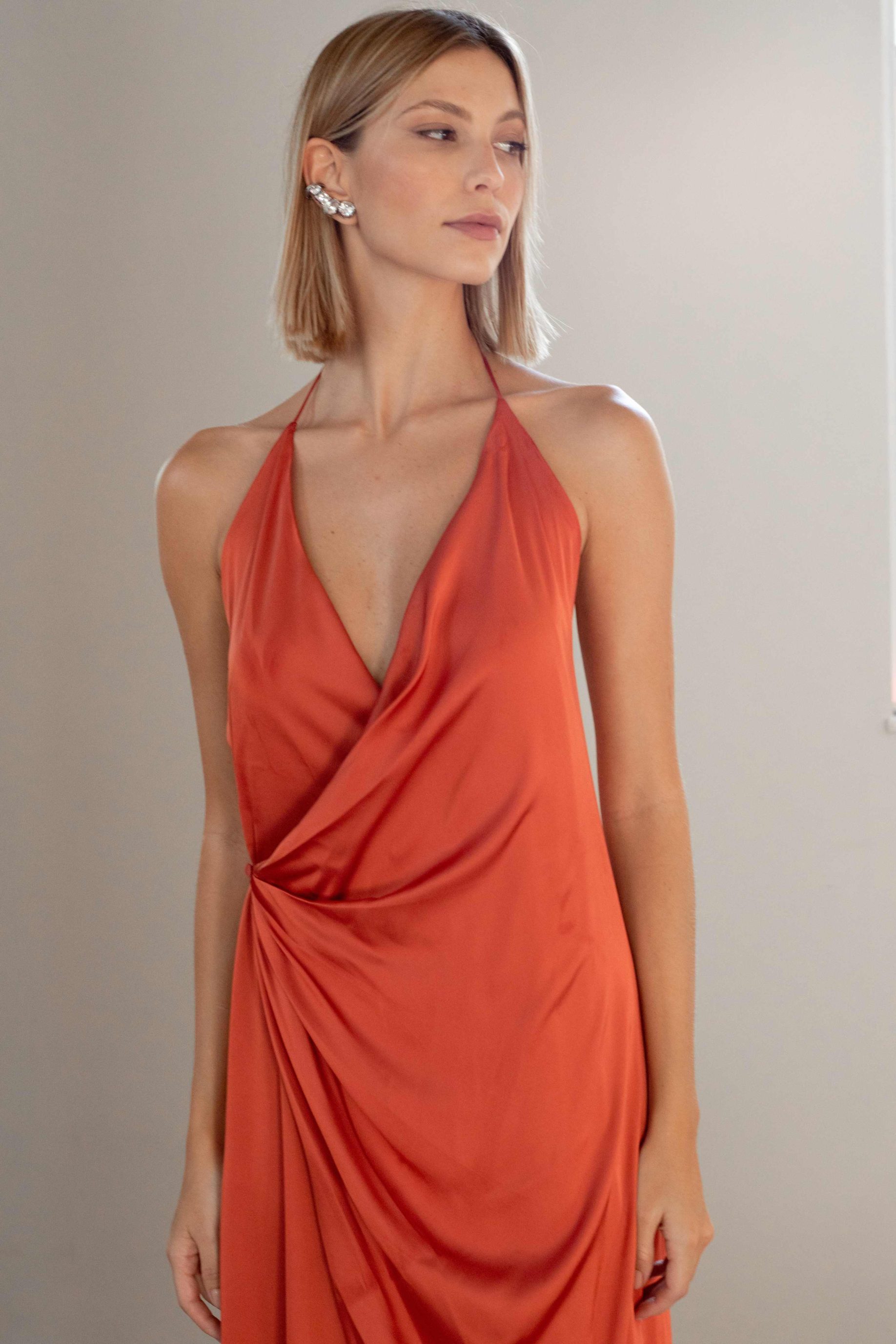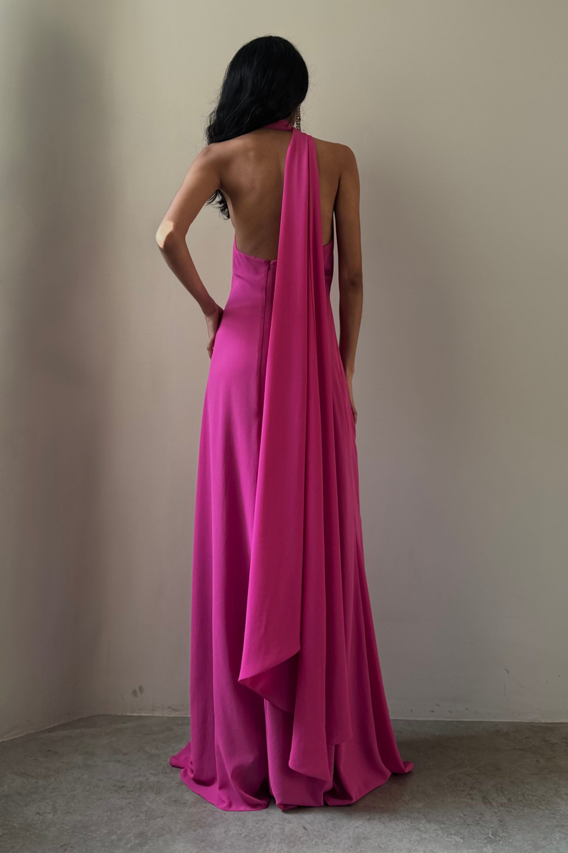 Vestido longo de cetim ajustável, todo duplo, com botão forrado para fechamento e uma cordinha de viés interna para transpassar o vestido. Decote profundo nas costas.