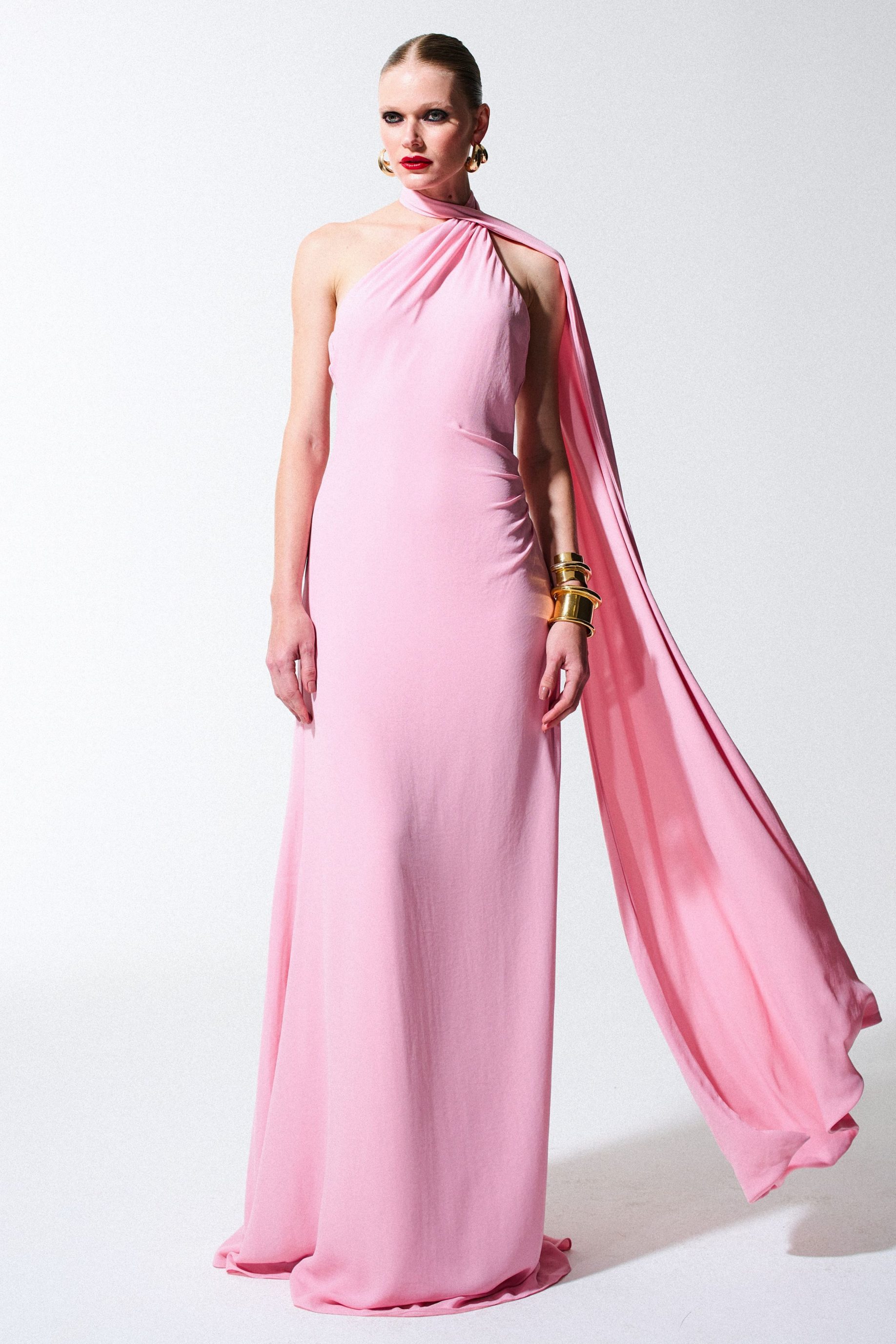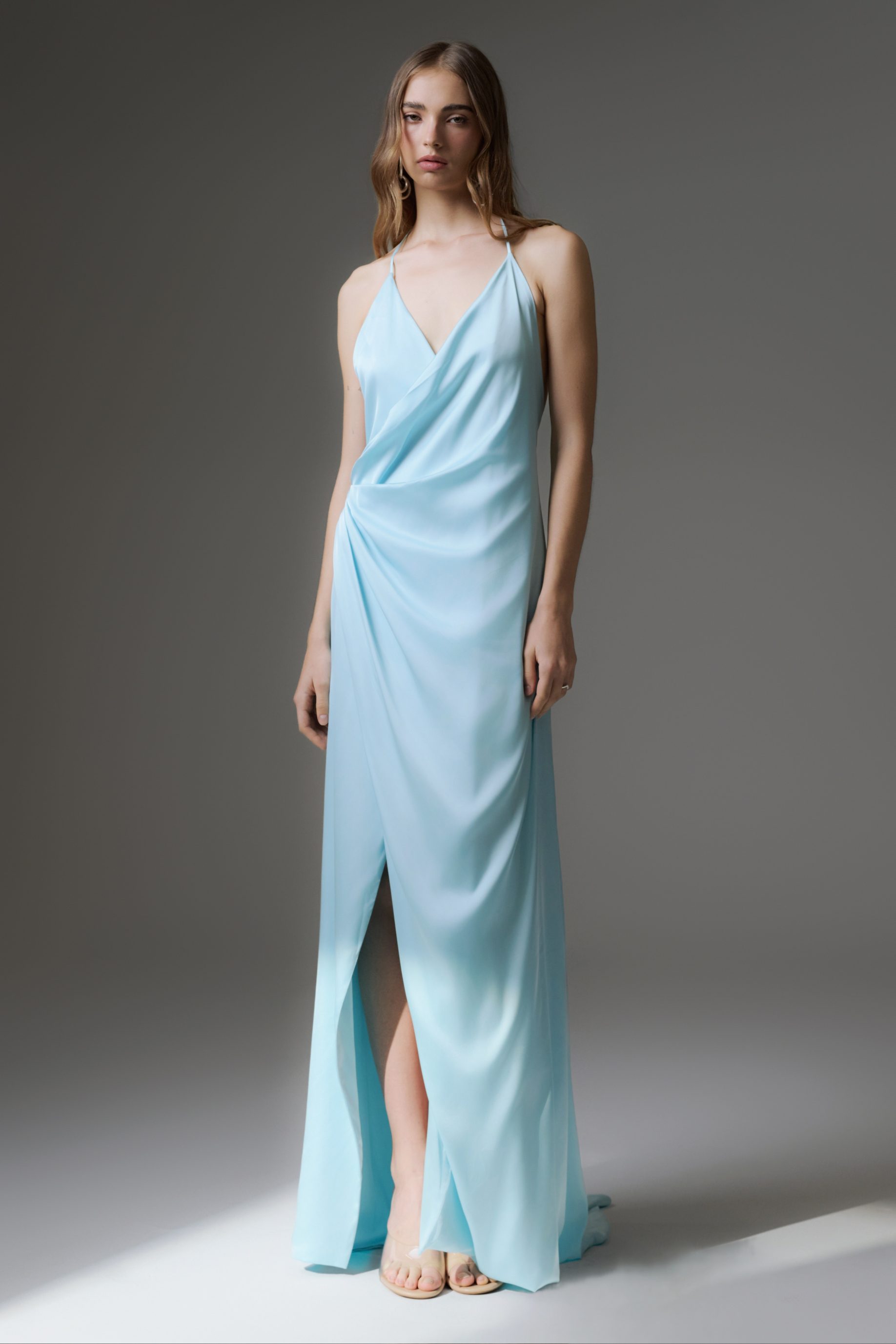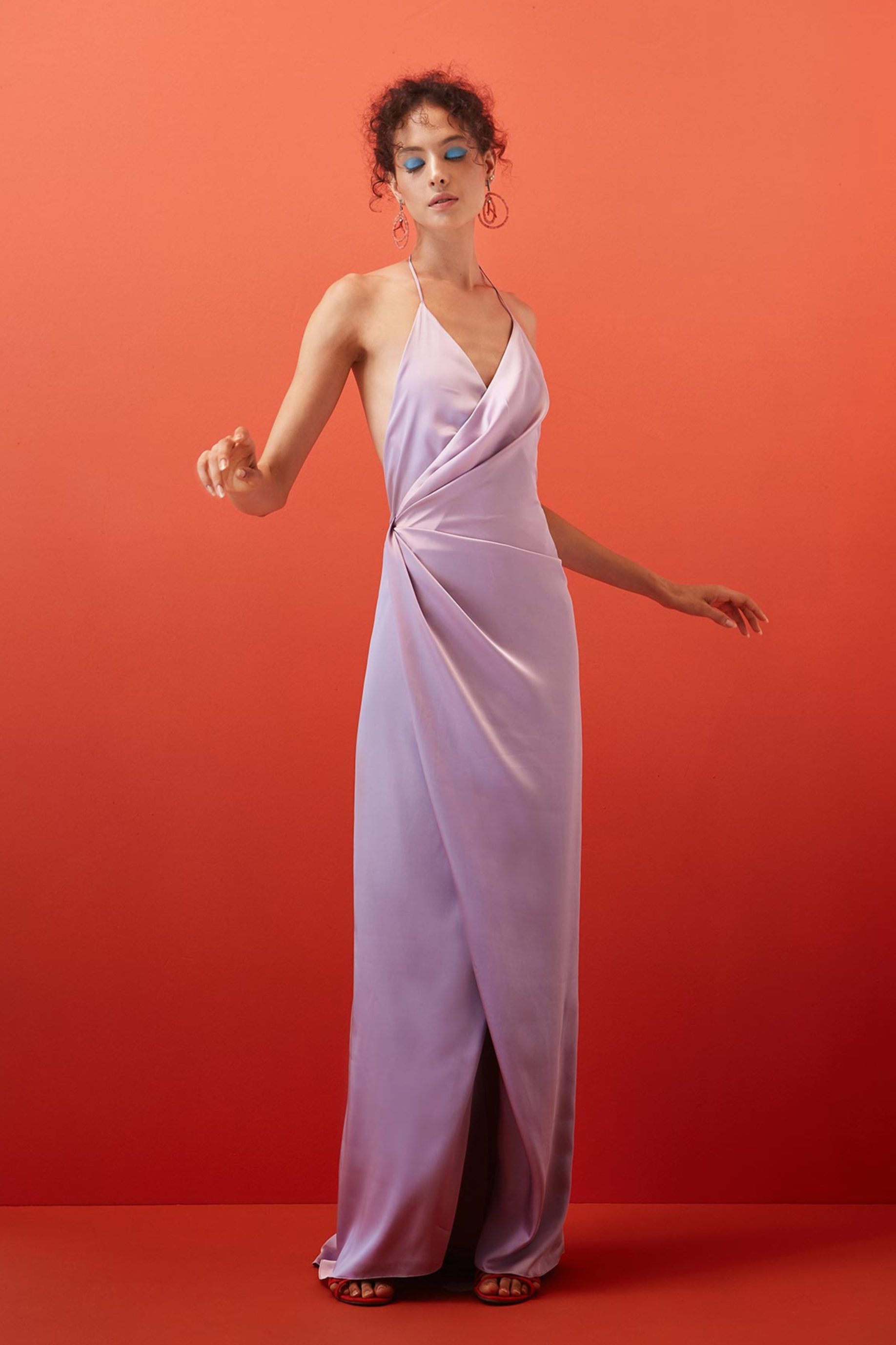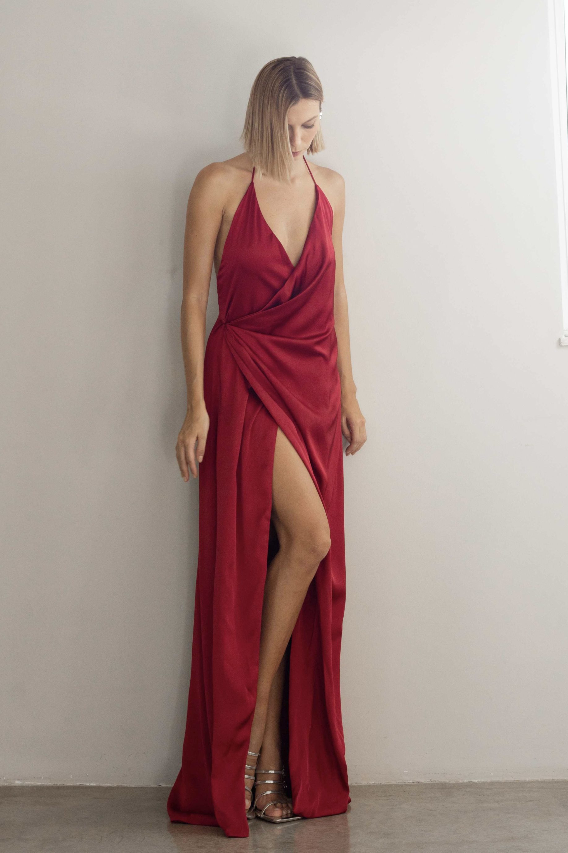 Vestido longo de cetim ajustável, todo duplo, com botão forrado para fechamento e uma cordinha de viés interna para transpassar o vestido. Decote profundo nas costas.