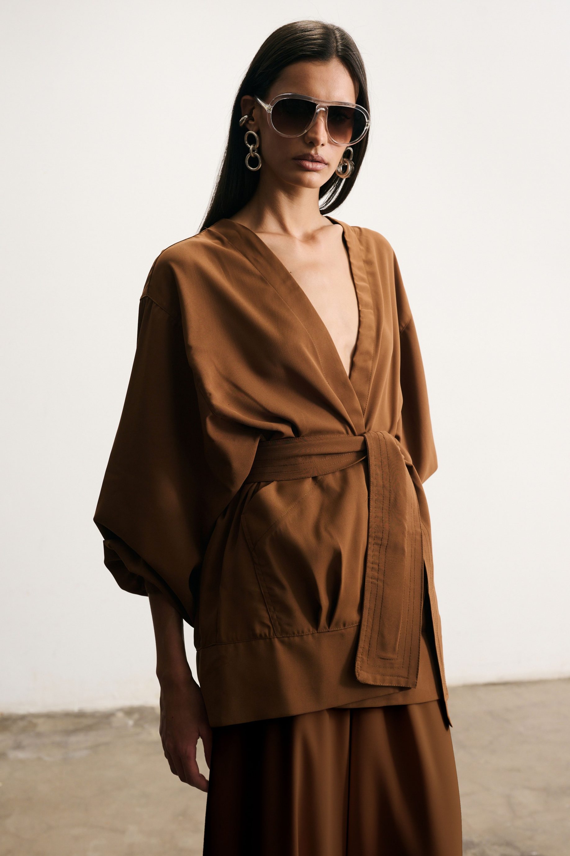 R$468,00 6 x R$78,00Jaqueta Kimono em crepe marrom. Possui modelagem ampla, com manga comprida e bufante, com bolso embutido com pregas. Acompanha faixa para amarração.