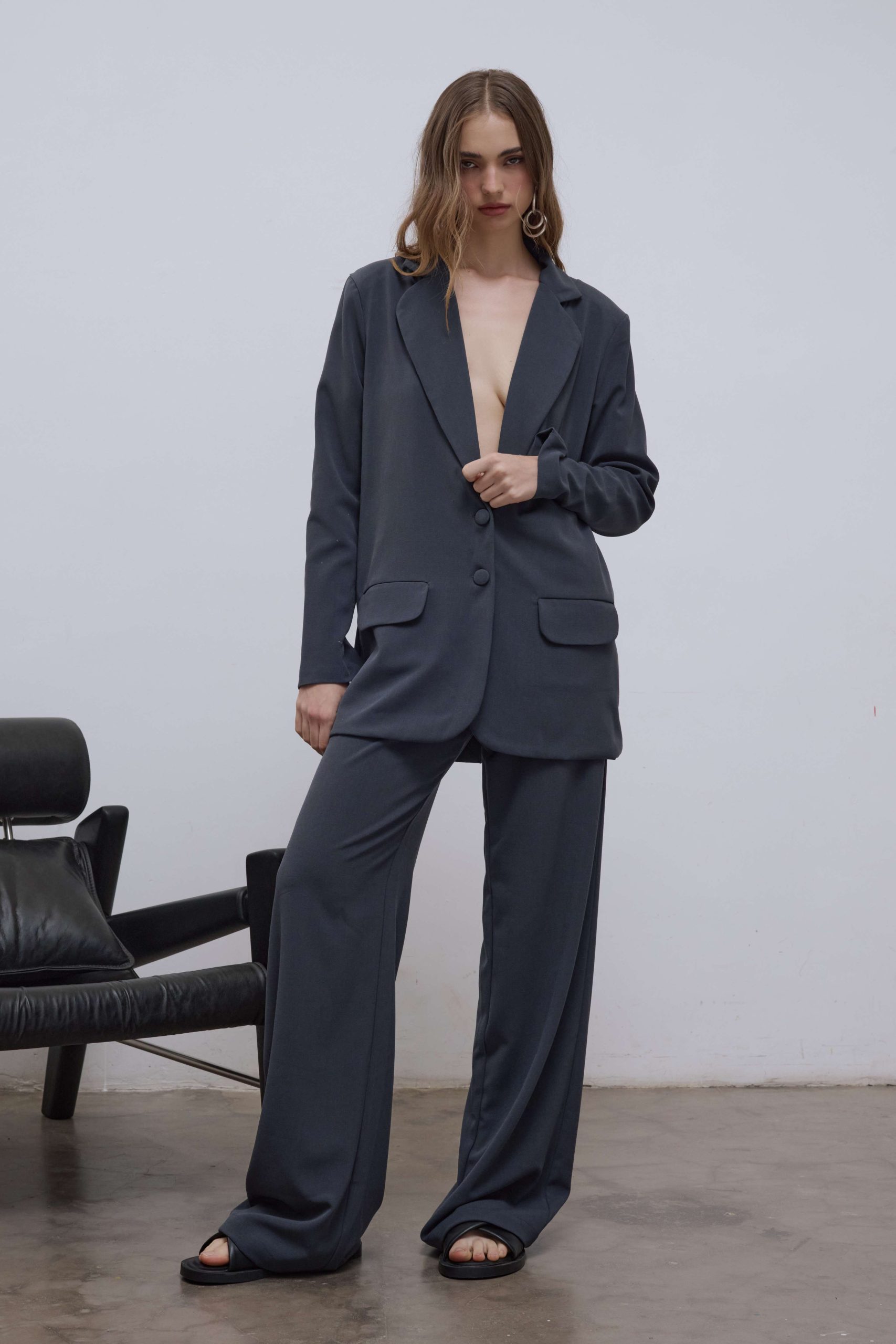 Blazer oversized de crepe com bolsos frontais falsos, ombreiras e fechamento com dois botões forrados com o mesmo tecido. Peça toda forrada.