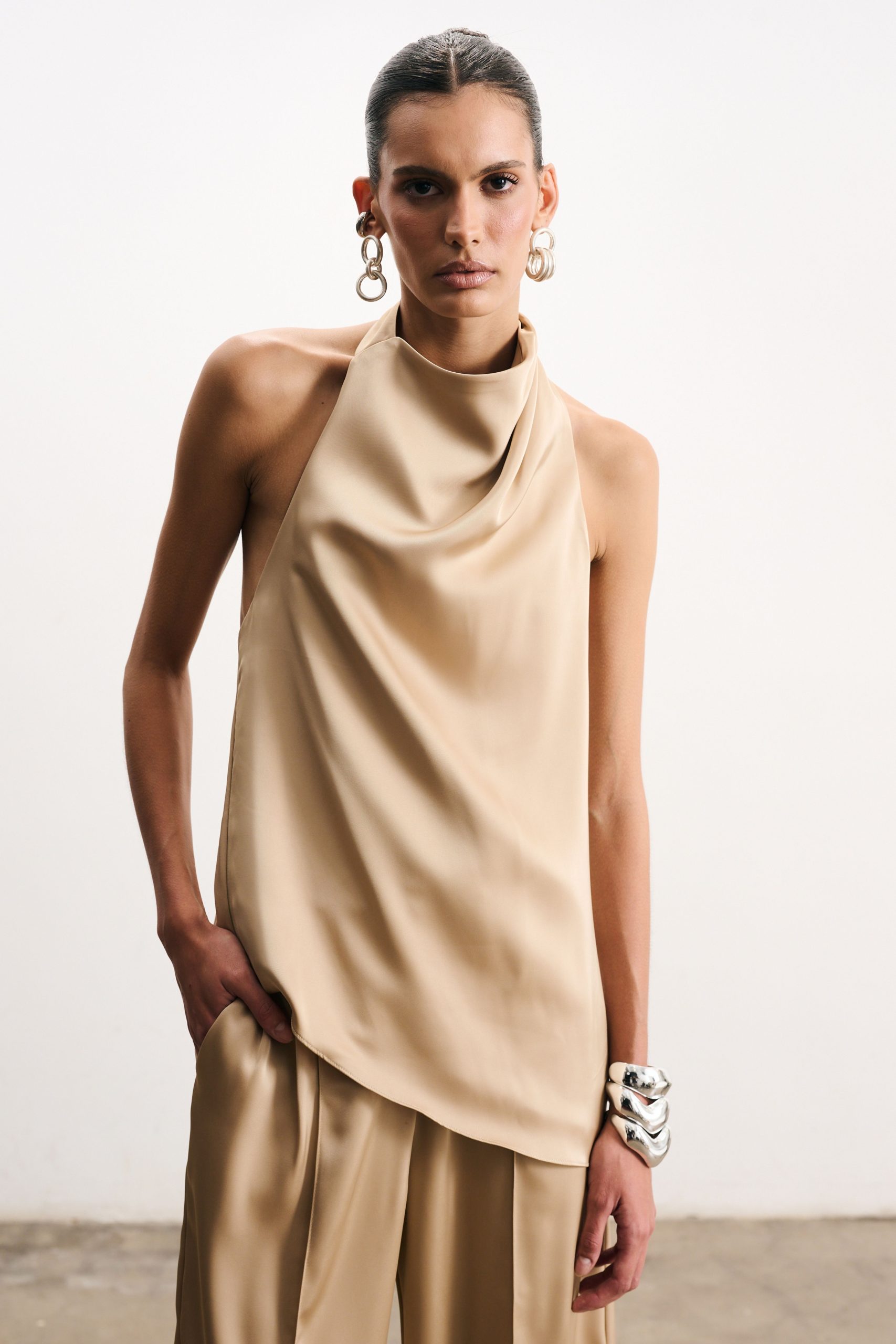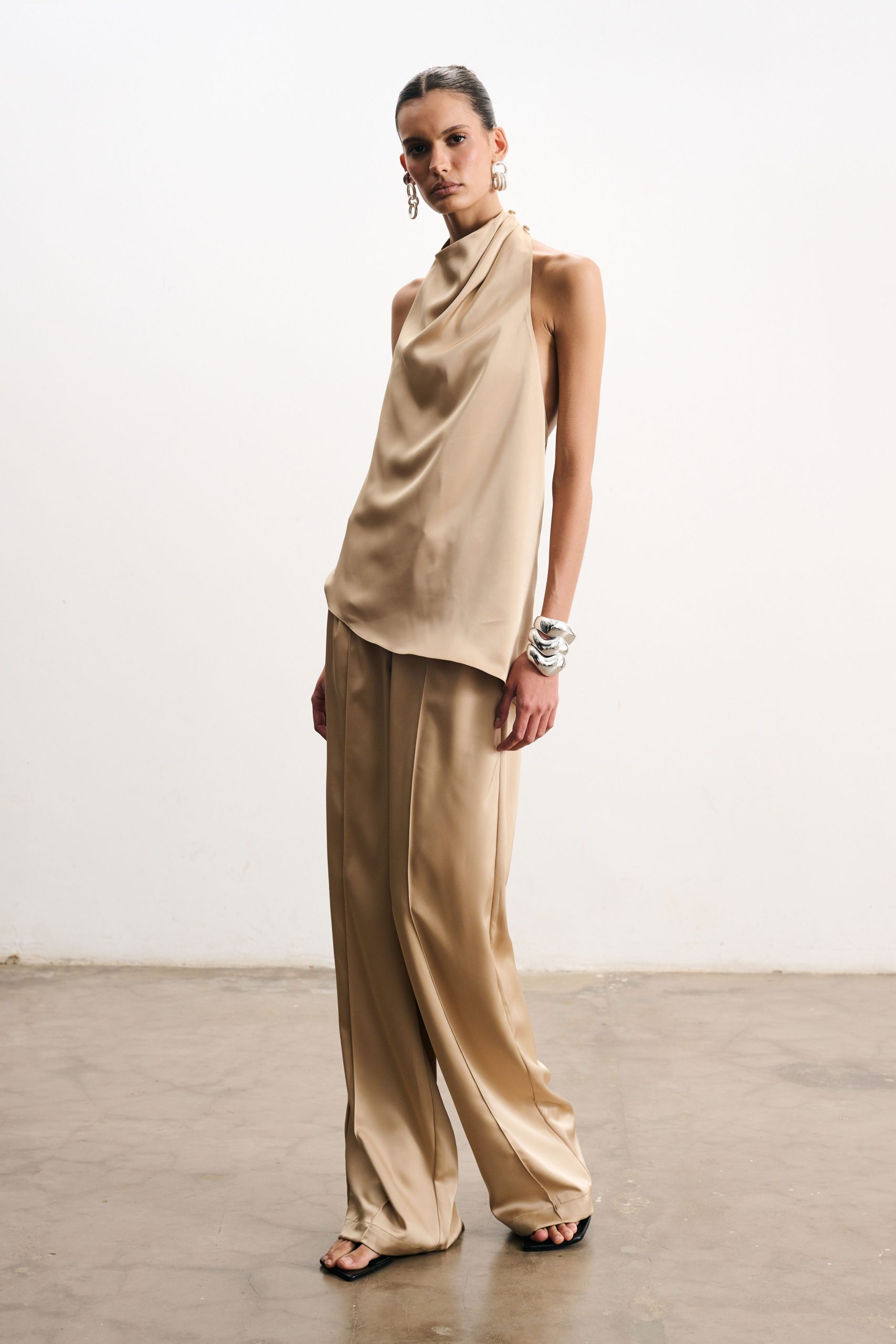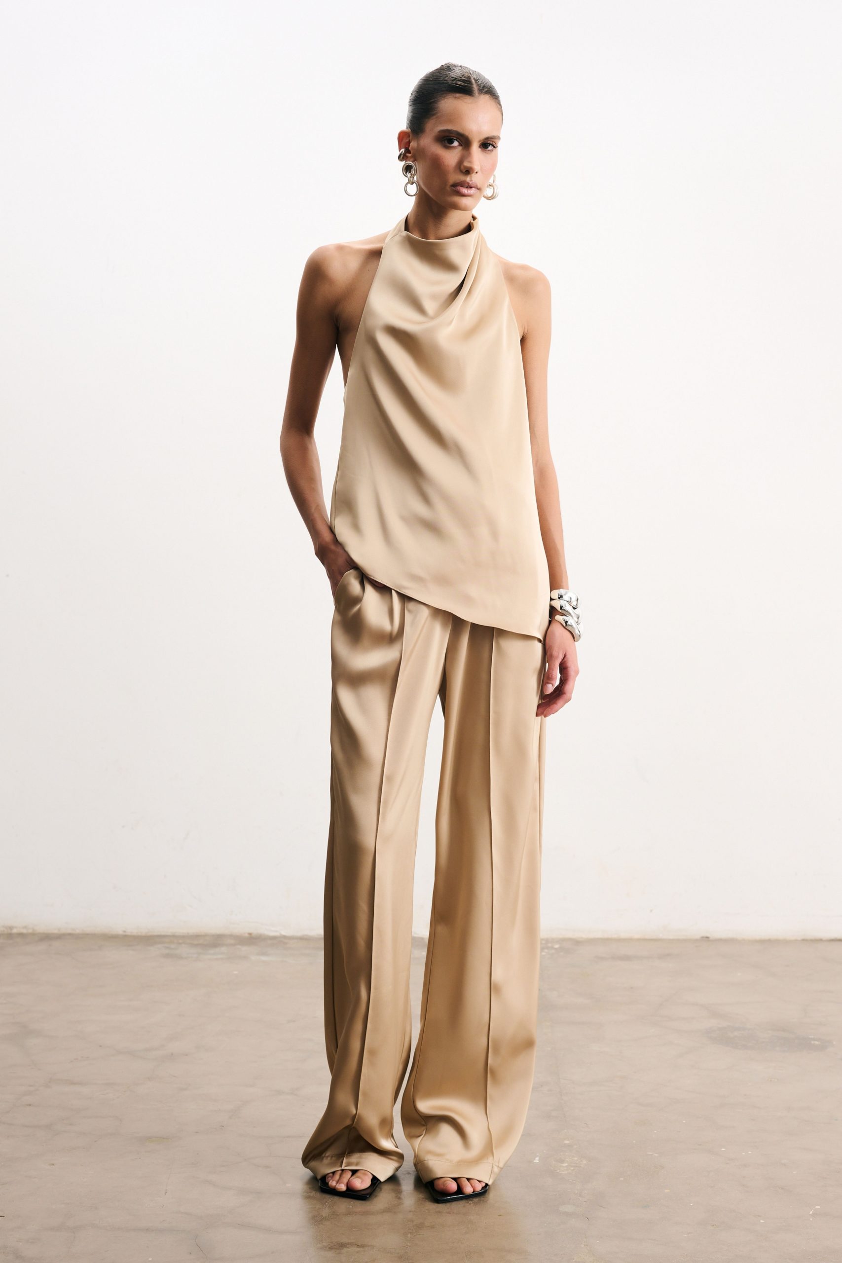 Calça de alfaiataria em cetim macadâmia, toda forrada, modelagem reta e caimento fluido. Possui cintura média, pregas frontais que valorizam a silhueta e fechamento por zíper e gancho embutidos, garantindo sofisticação e conforto.