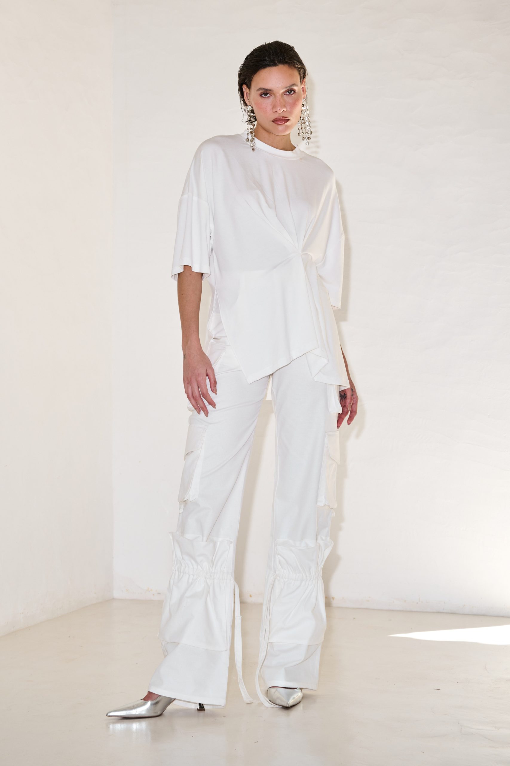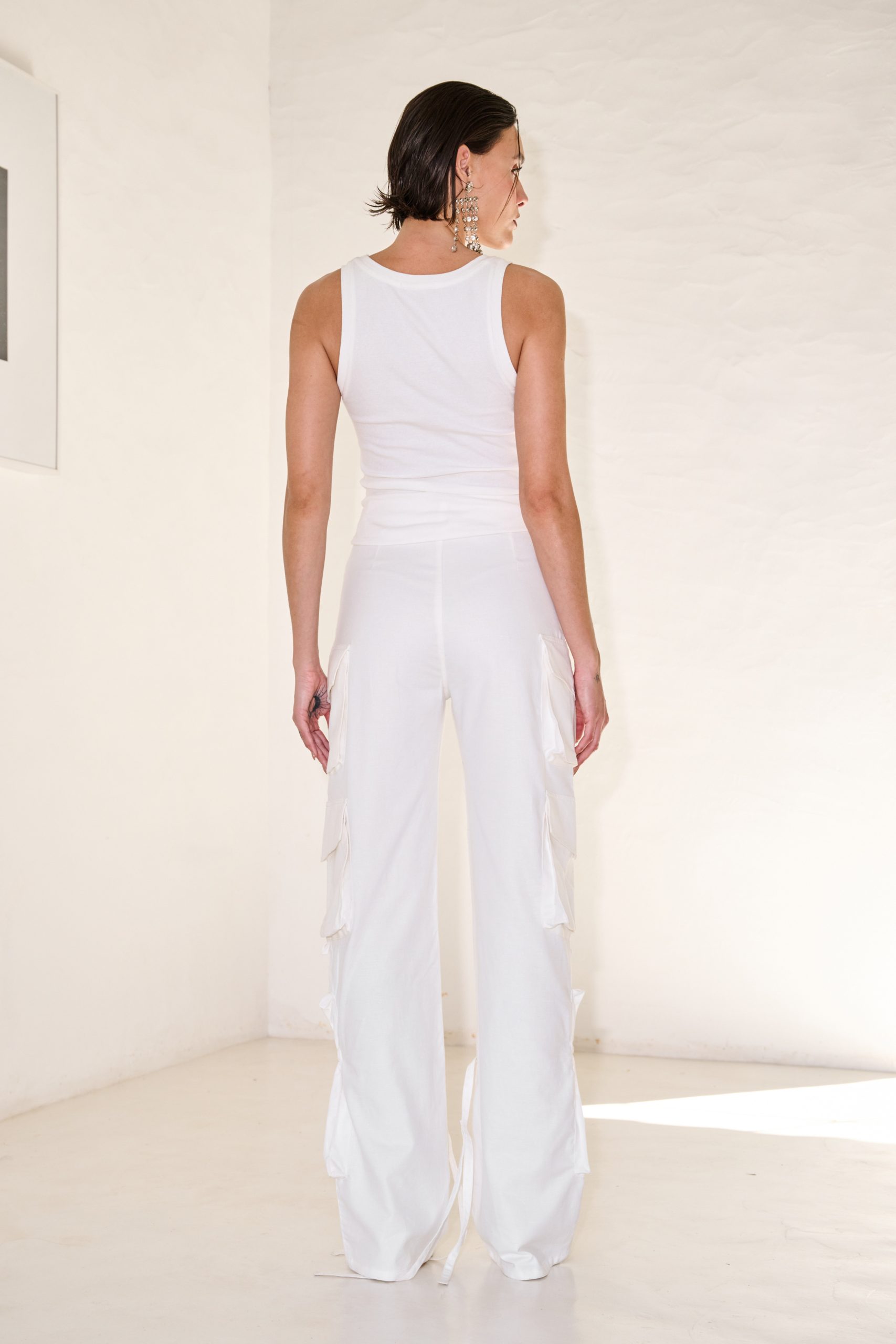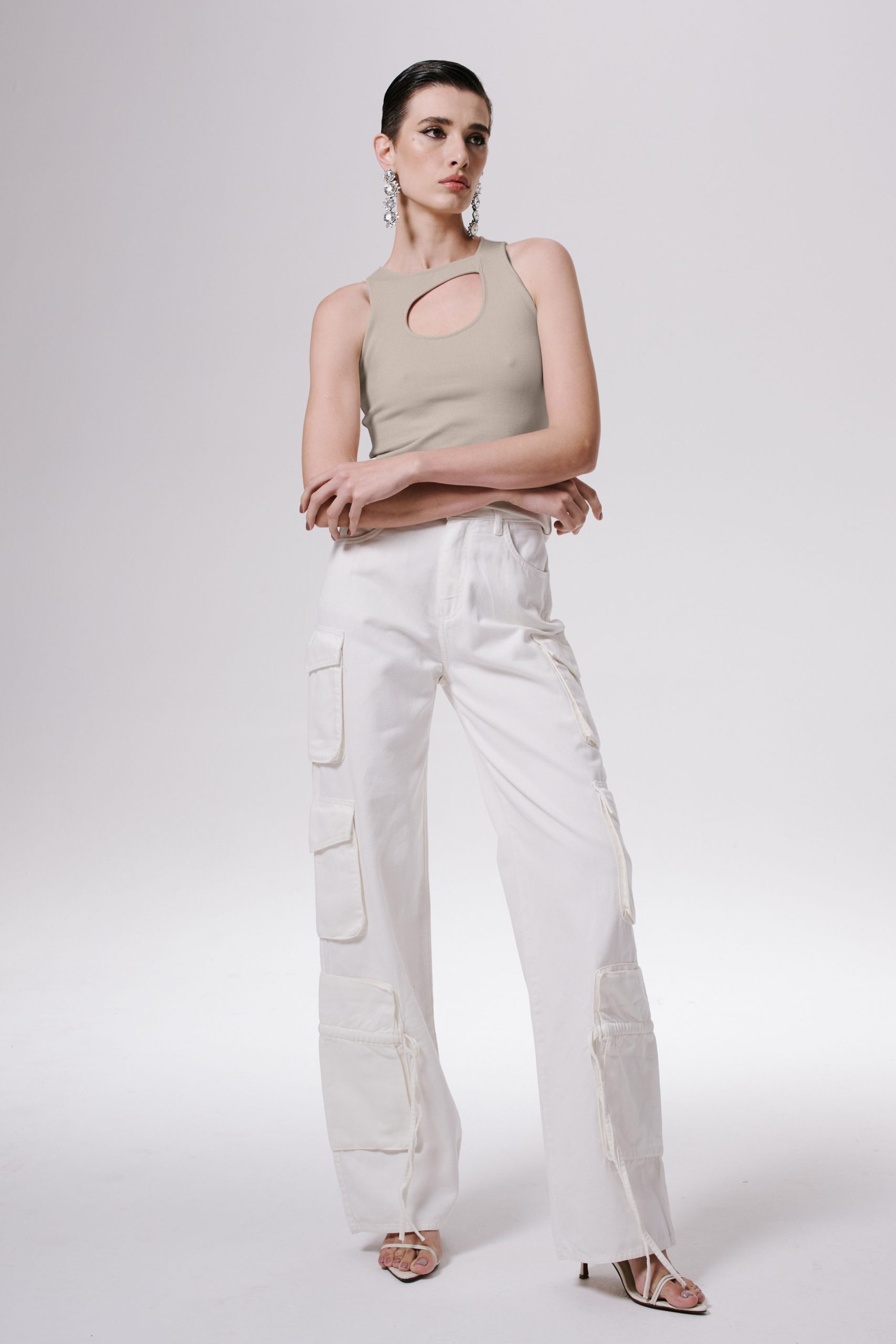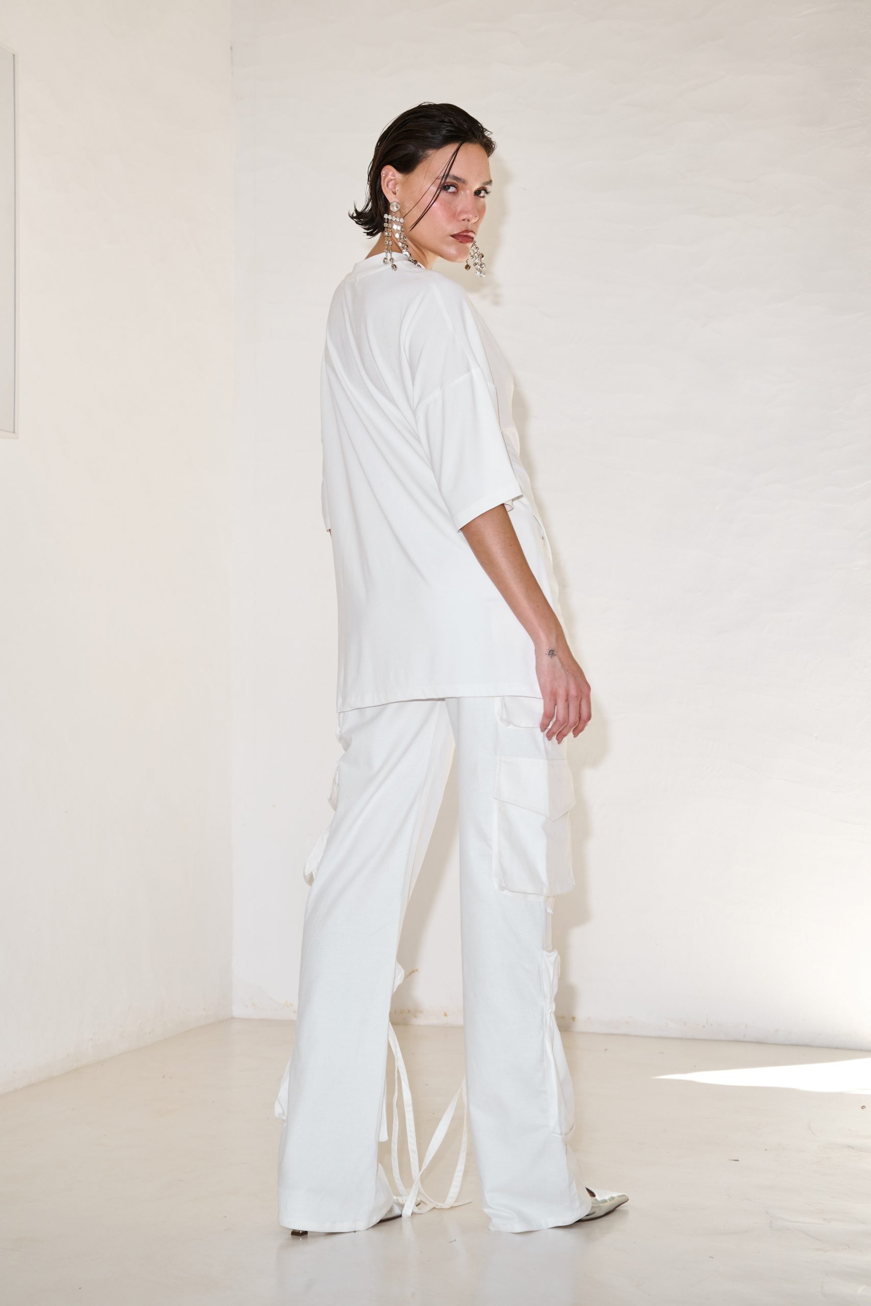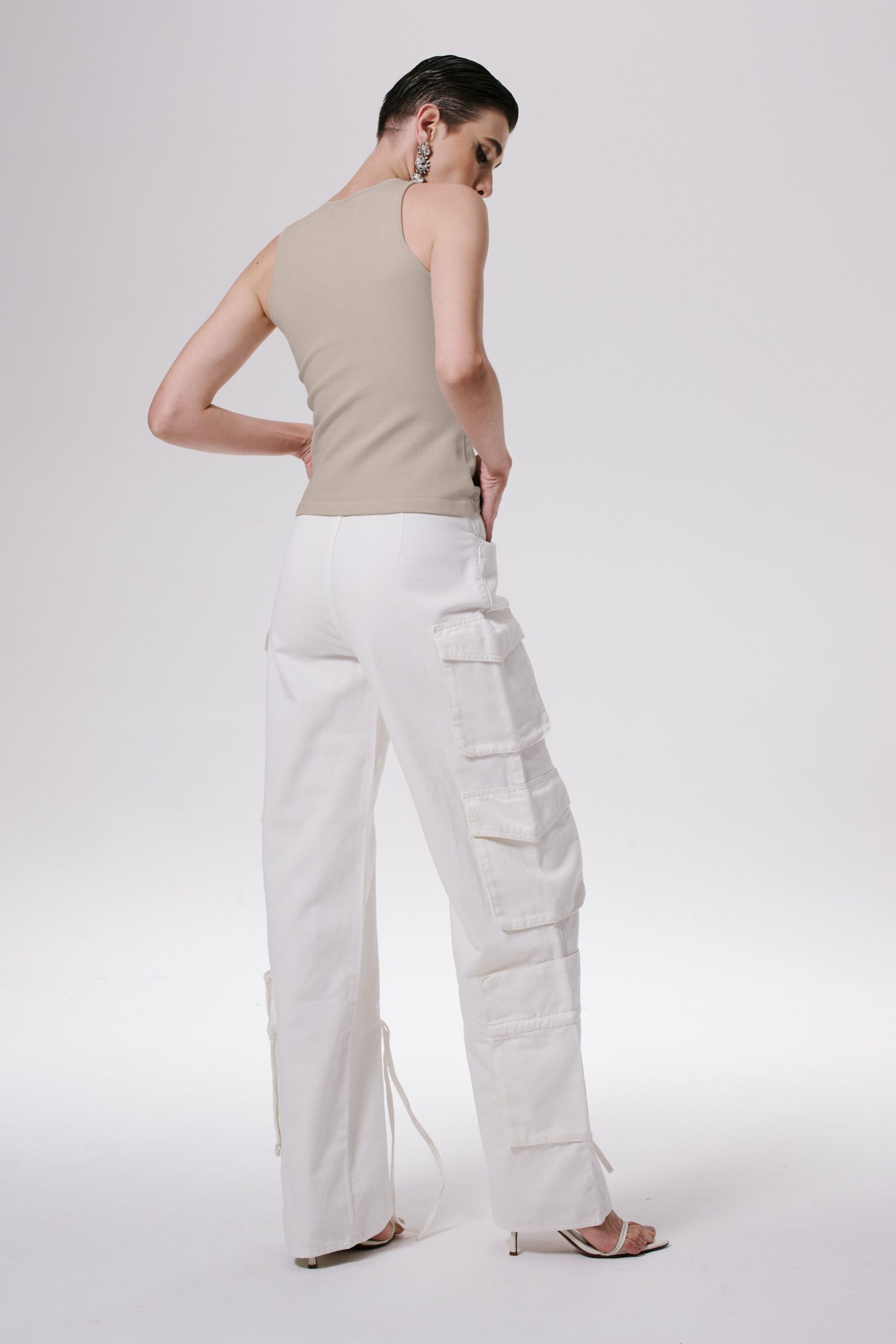 Calça de sarja off white, com bolso faca e bolsos utilitários amplos.