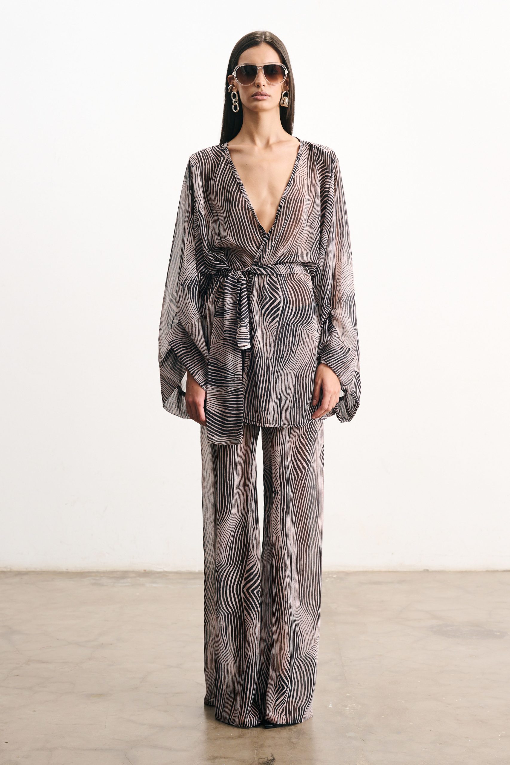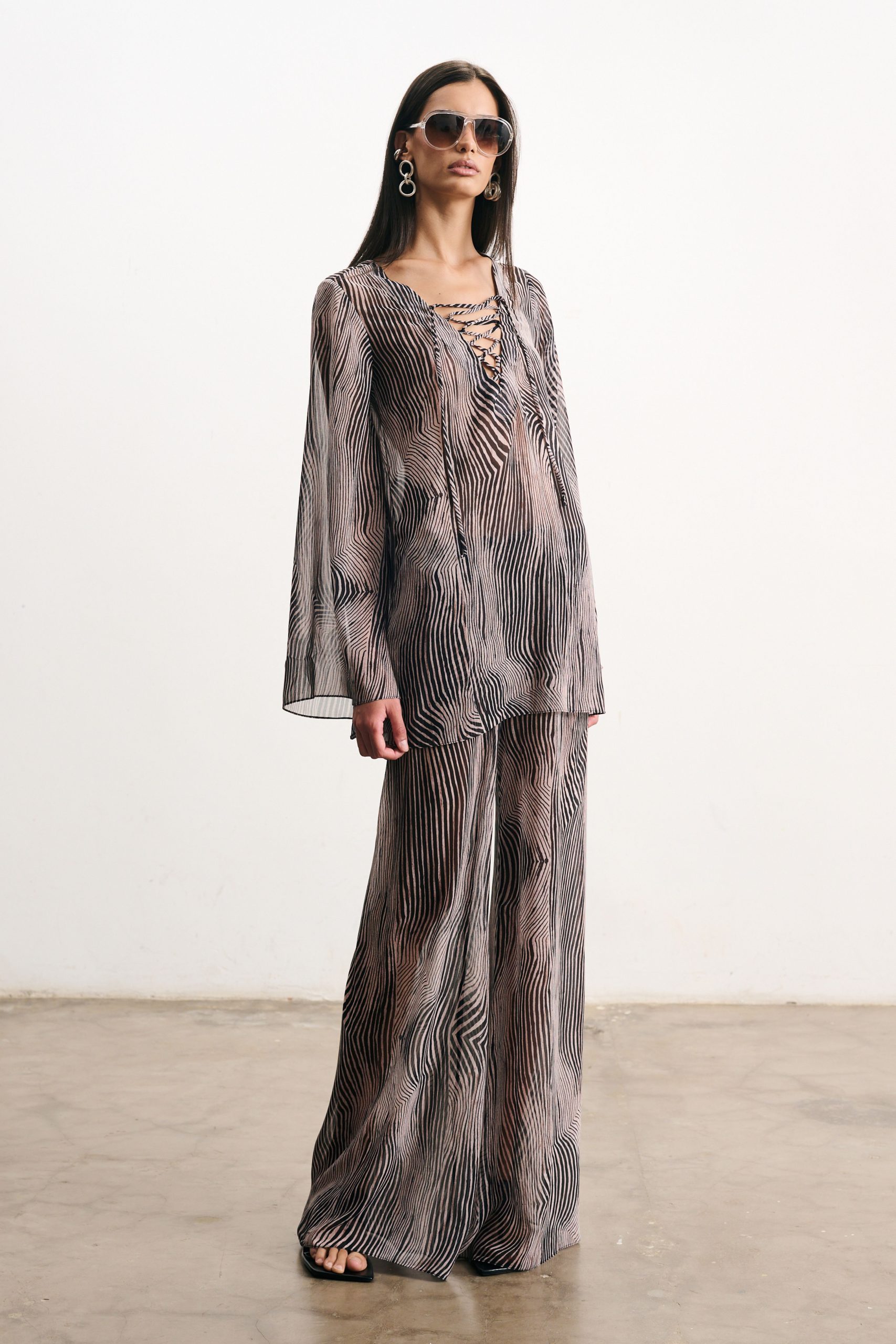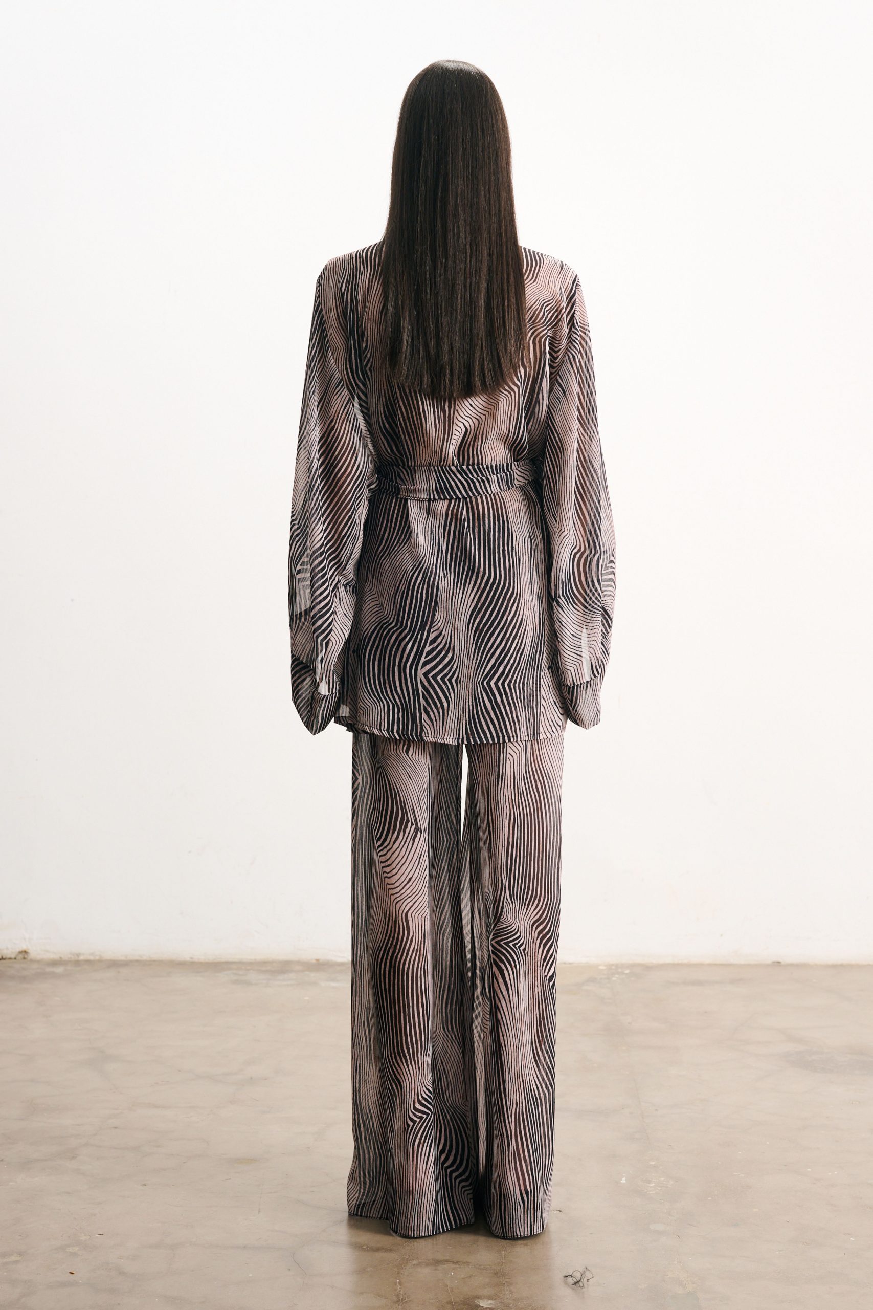Calça em musseline com estampa digital exclusiva. Cós elástico e amarração frontal que ajustam a peça no corpo. Modelagem cortada em viés, que proporciona caimento único e perfeito, modelando a silhueta. Caimento fluído e levemente evasê.