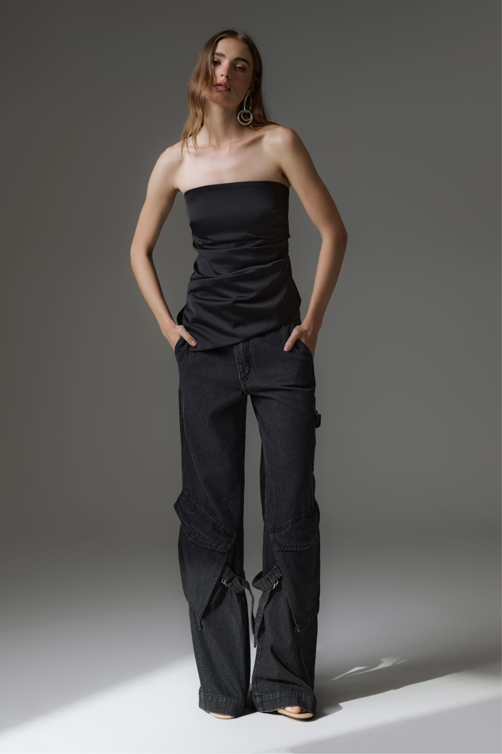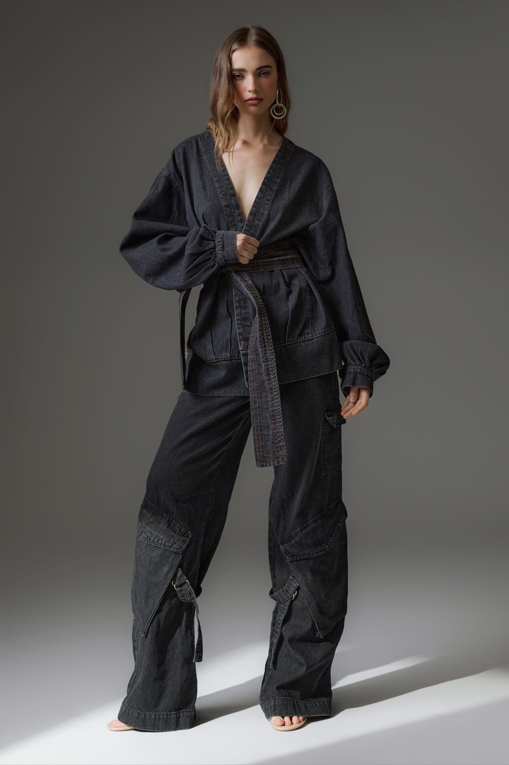 Calça jeans, modelo cargo, com modelagem reta. Possui bolsos funcionais ao longo do seu comprimento, além de maxi bolsos com lapela e detalhe de metal na lateral. Caso queira usar com a cintura baixa, escolher um tamanho maior que o seu habitual.