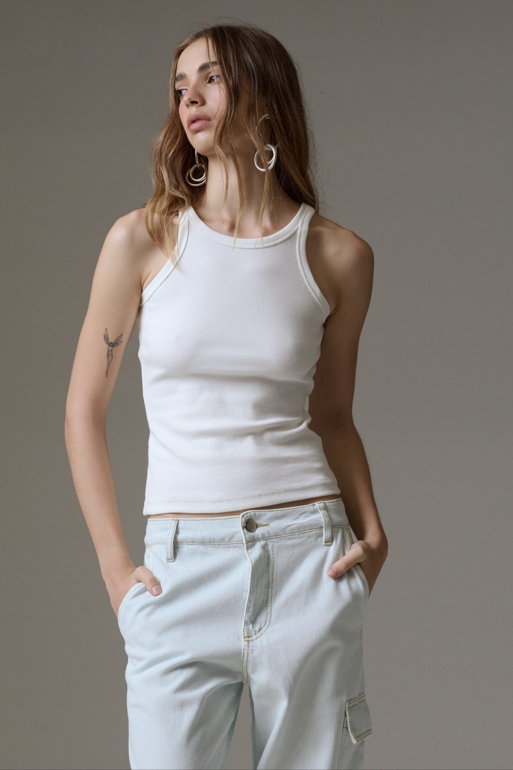 Regata de malha canelada de algodão, com decote halter.