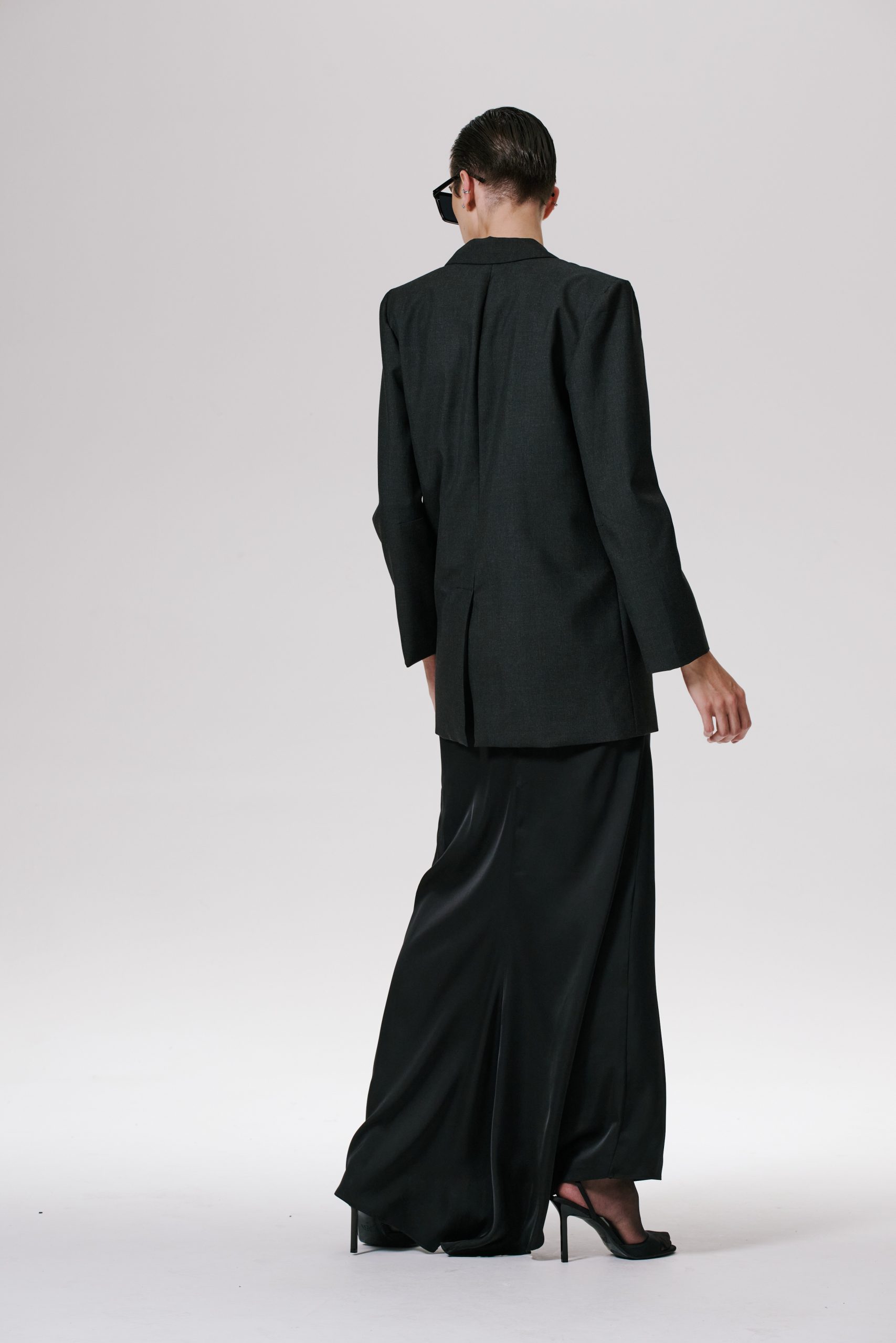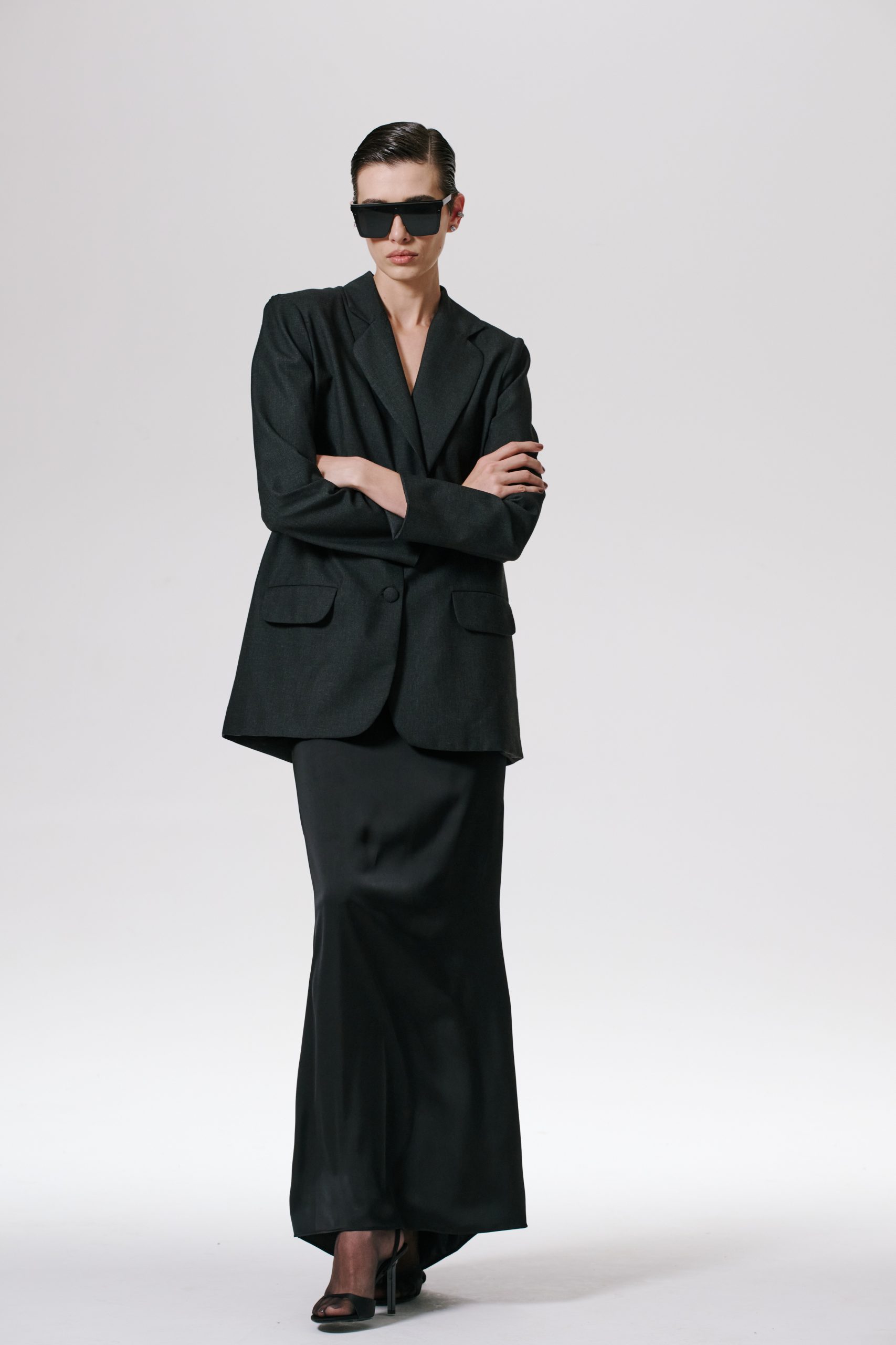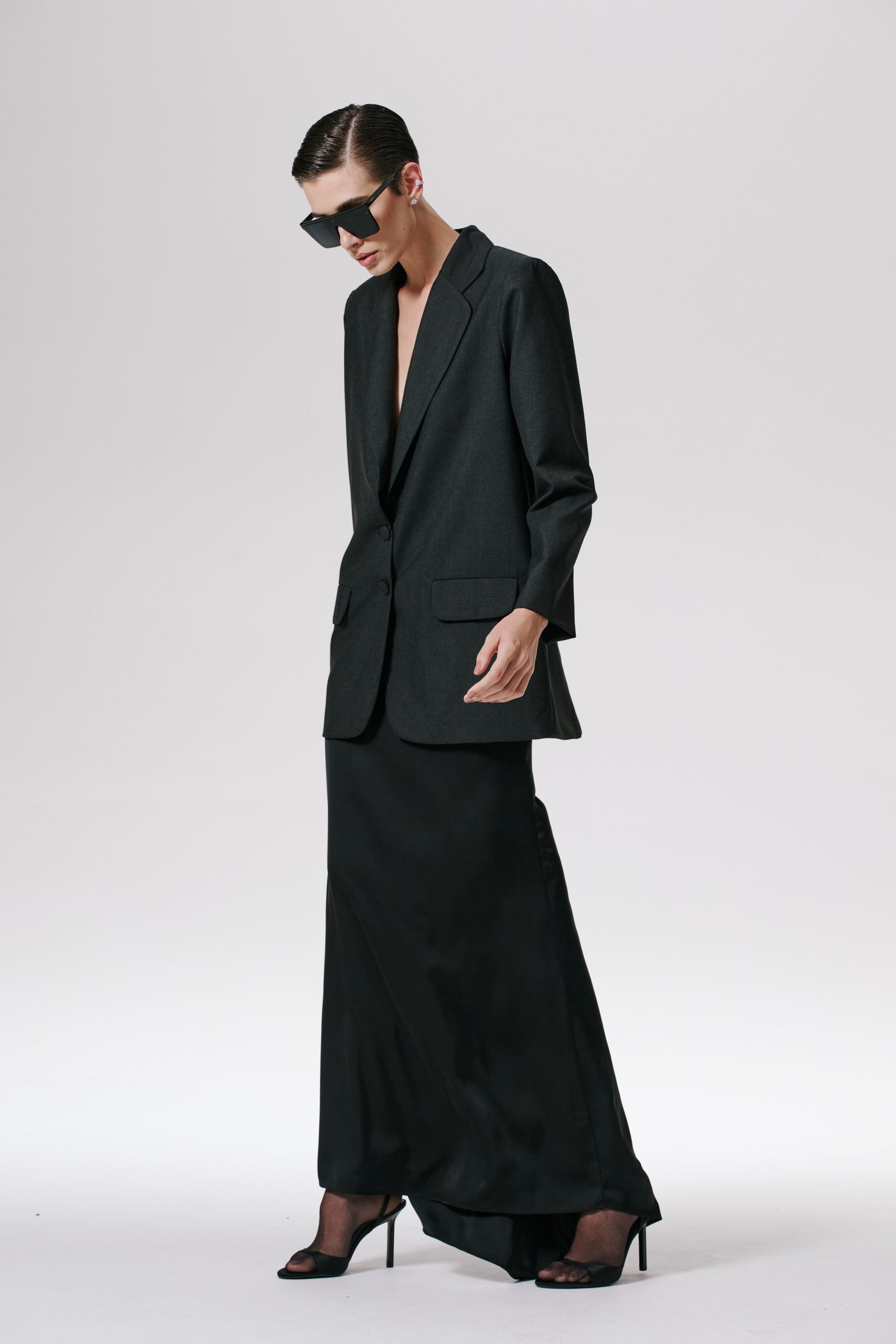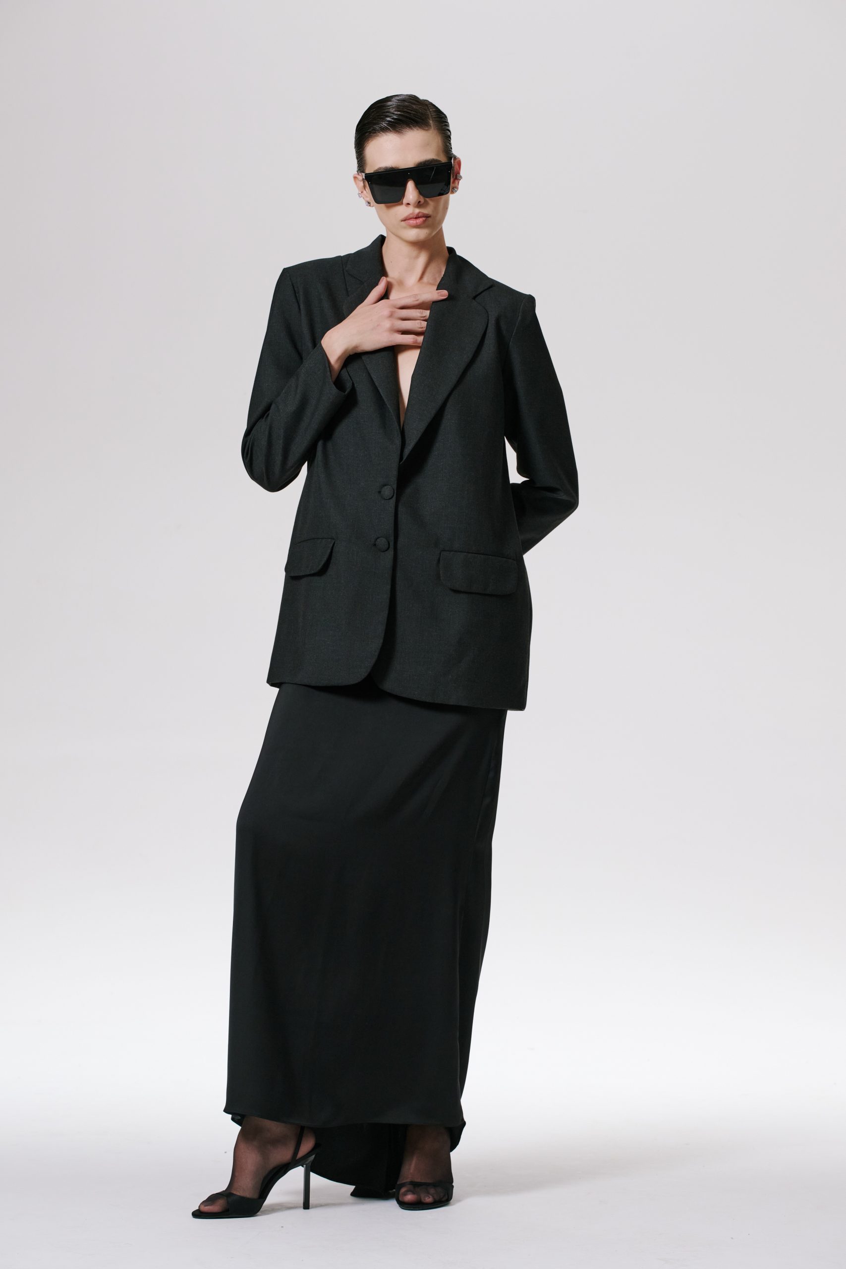 Saia longa de cetim de alta gramatura, com cintura alta e cauda leve. Zíper invisível nas costas.
