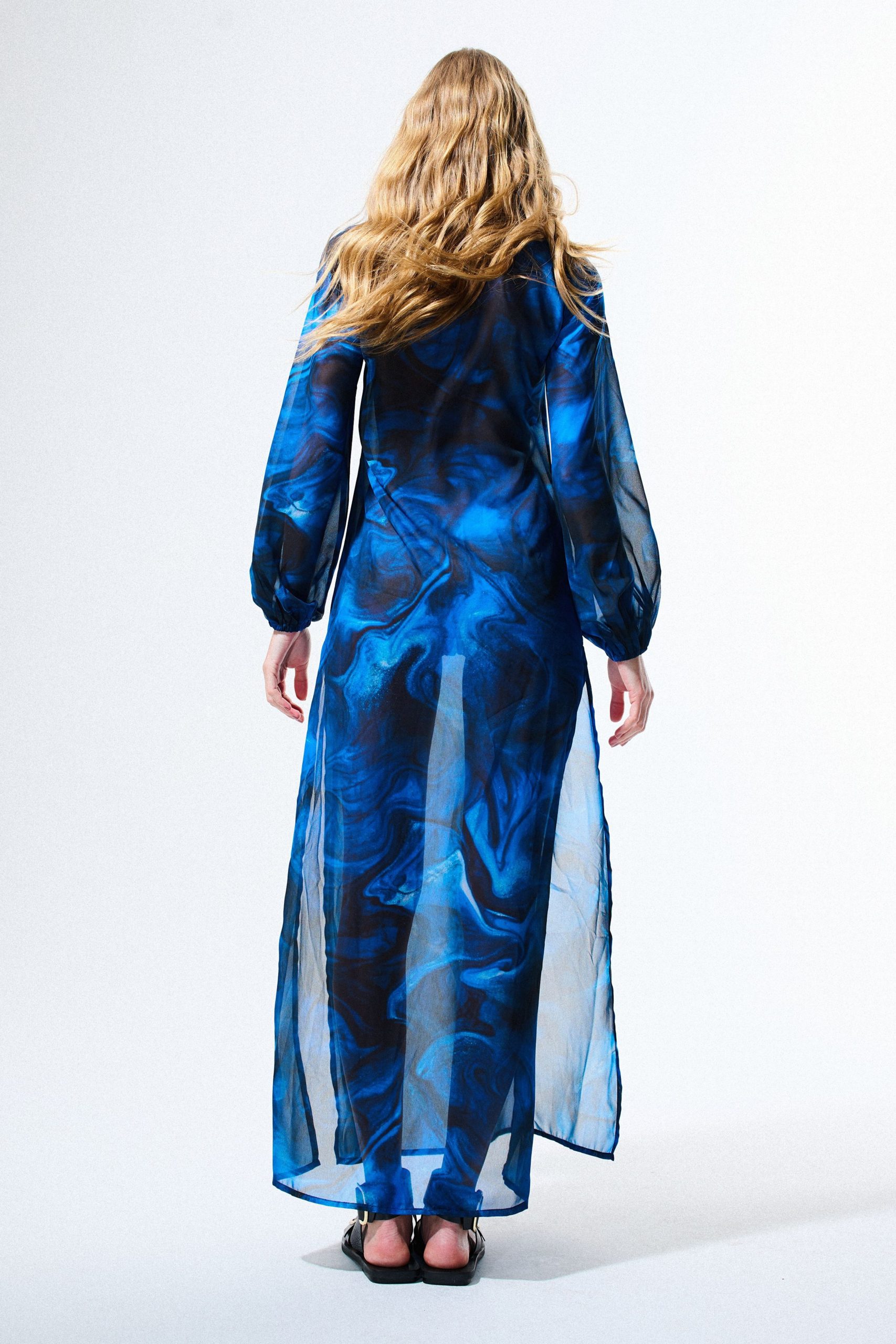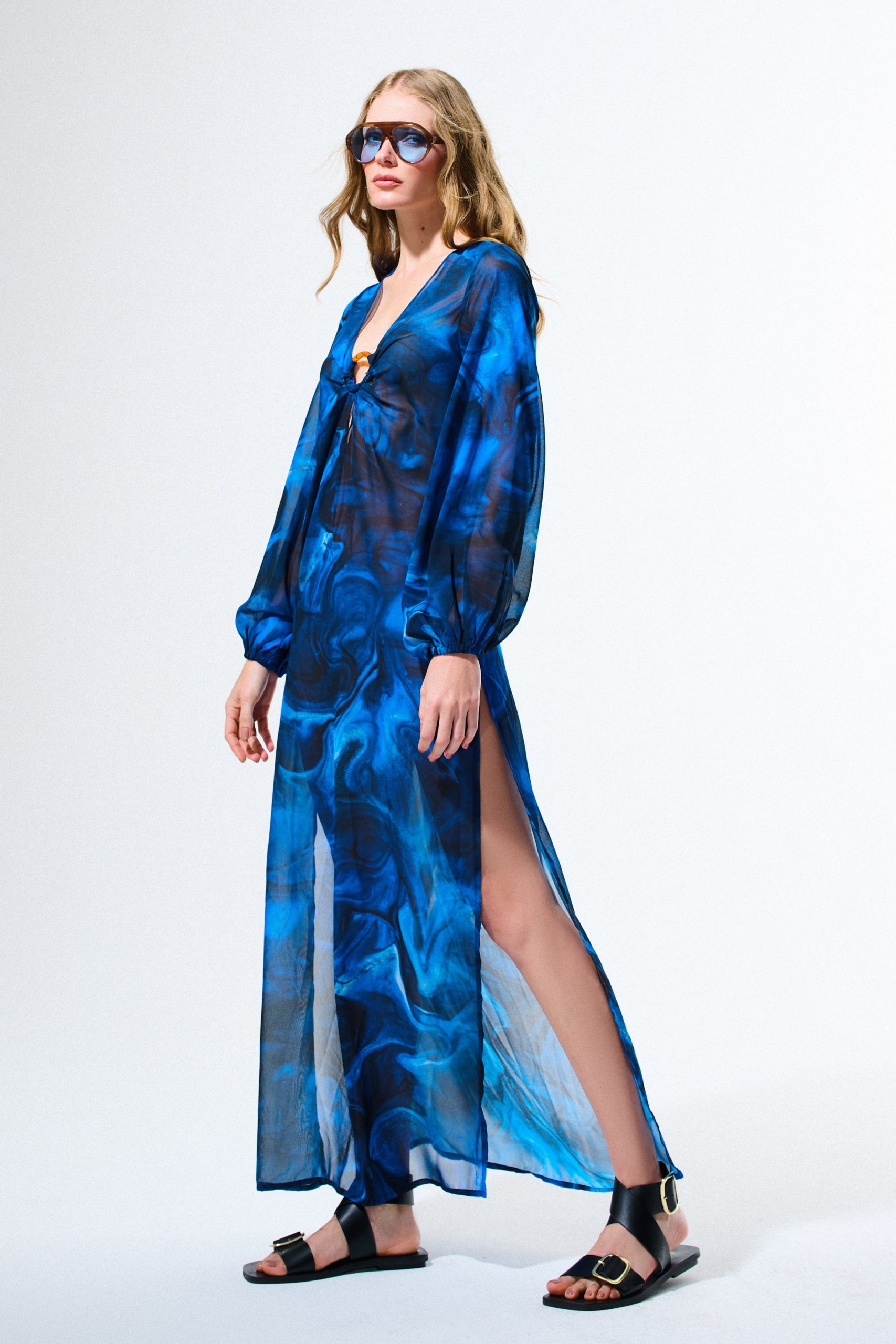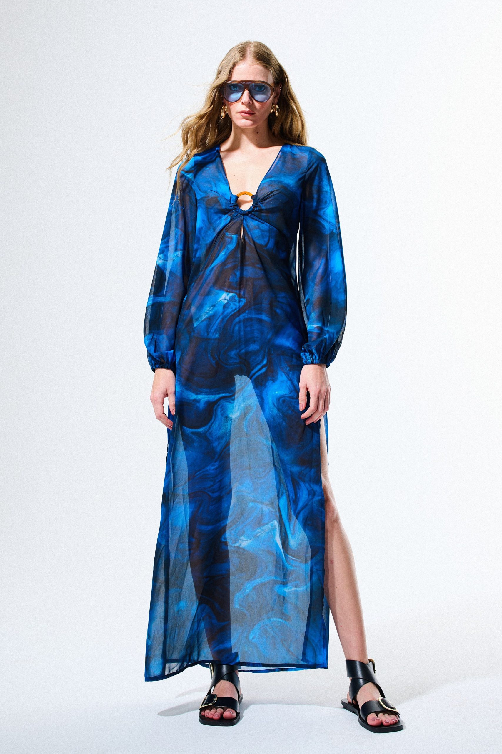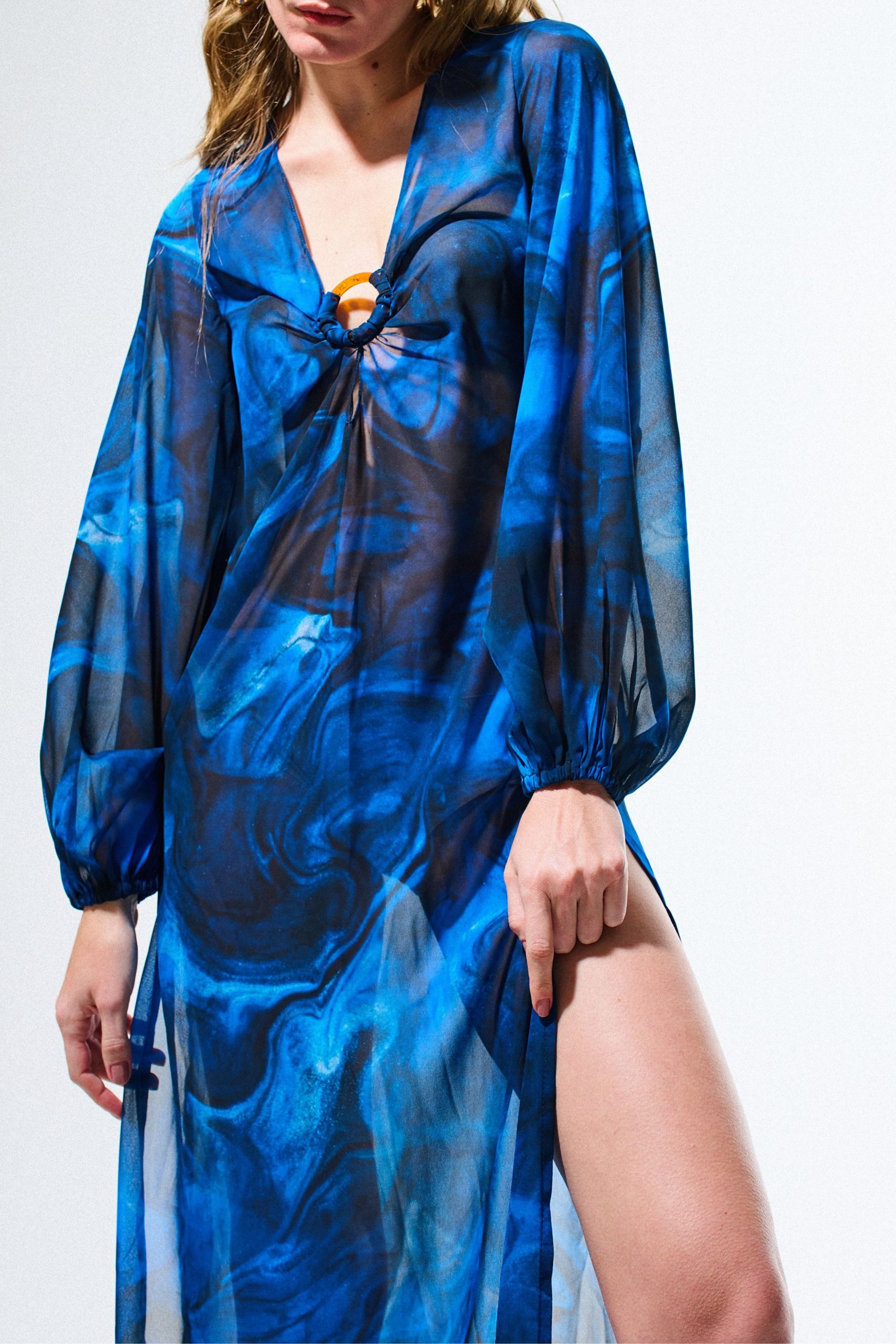 Vestido de musseline com estampa digital exclusiva, manga bufante com elástico no punho e detalhe de argola de acrílico tartaruga no busto.