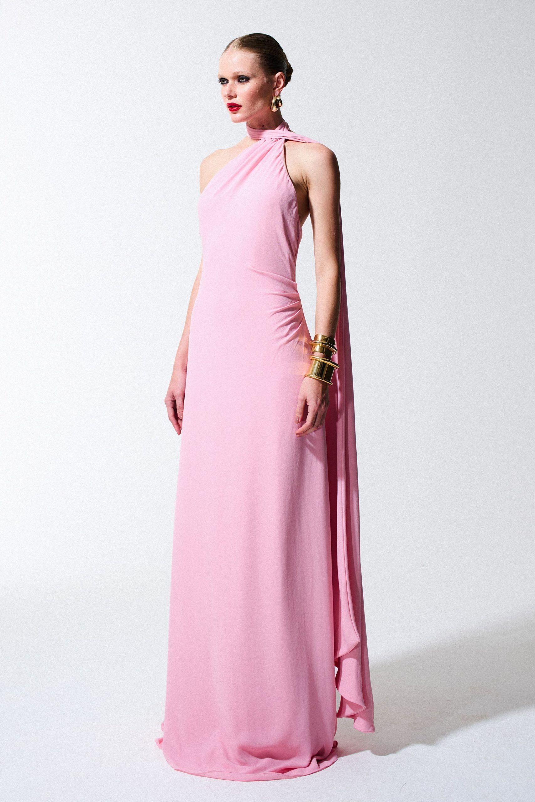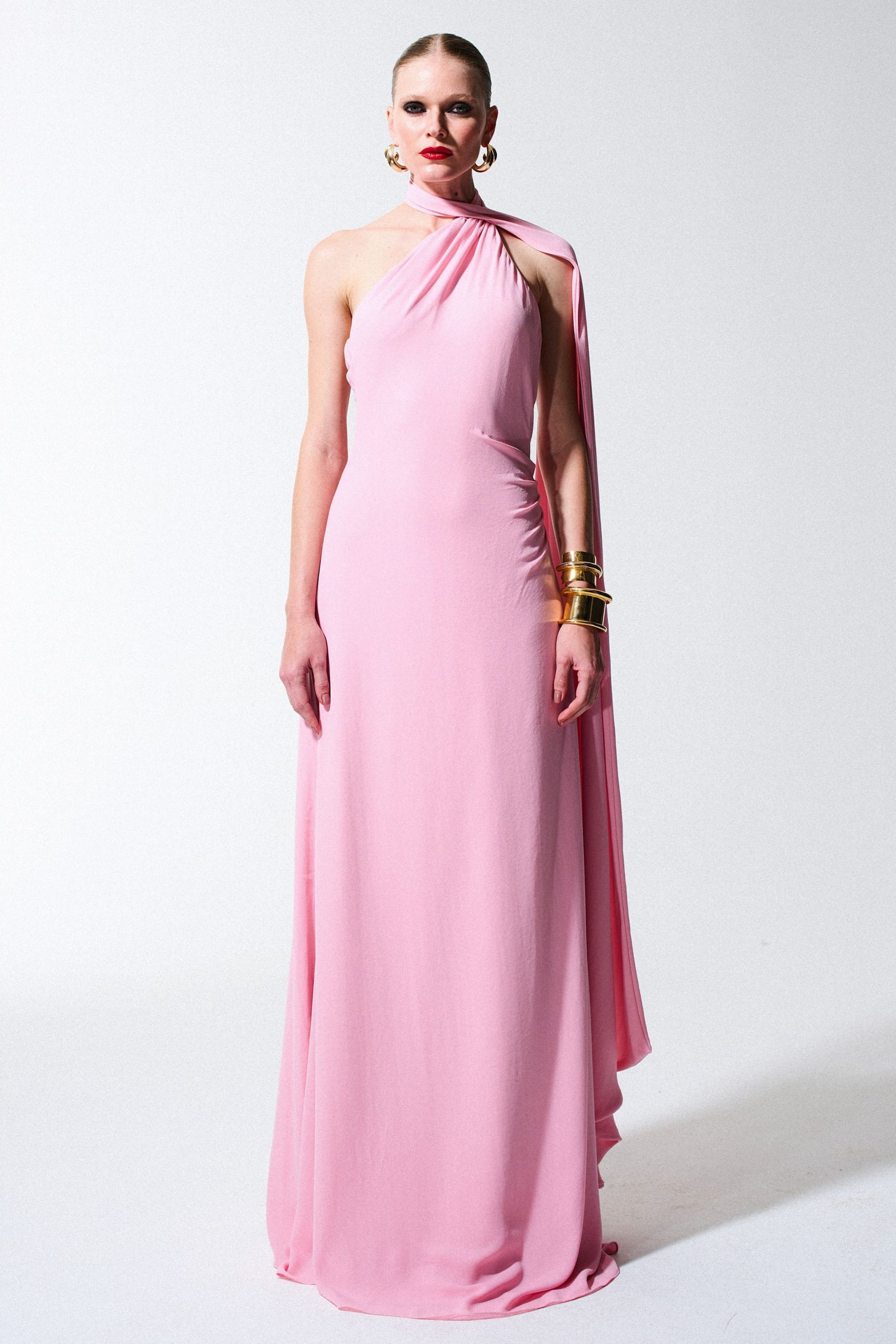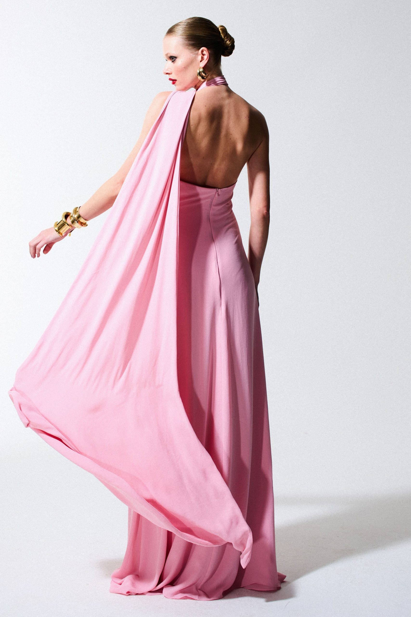 Vestido de musseline todo forrado, com drapeado na cintura e faixa longa que envolve o pescoço. Possui zíper invisível nas costas.