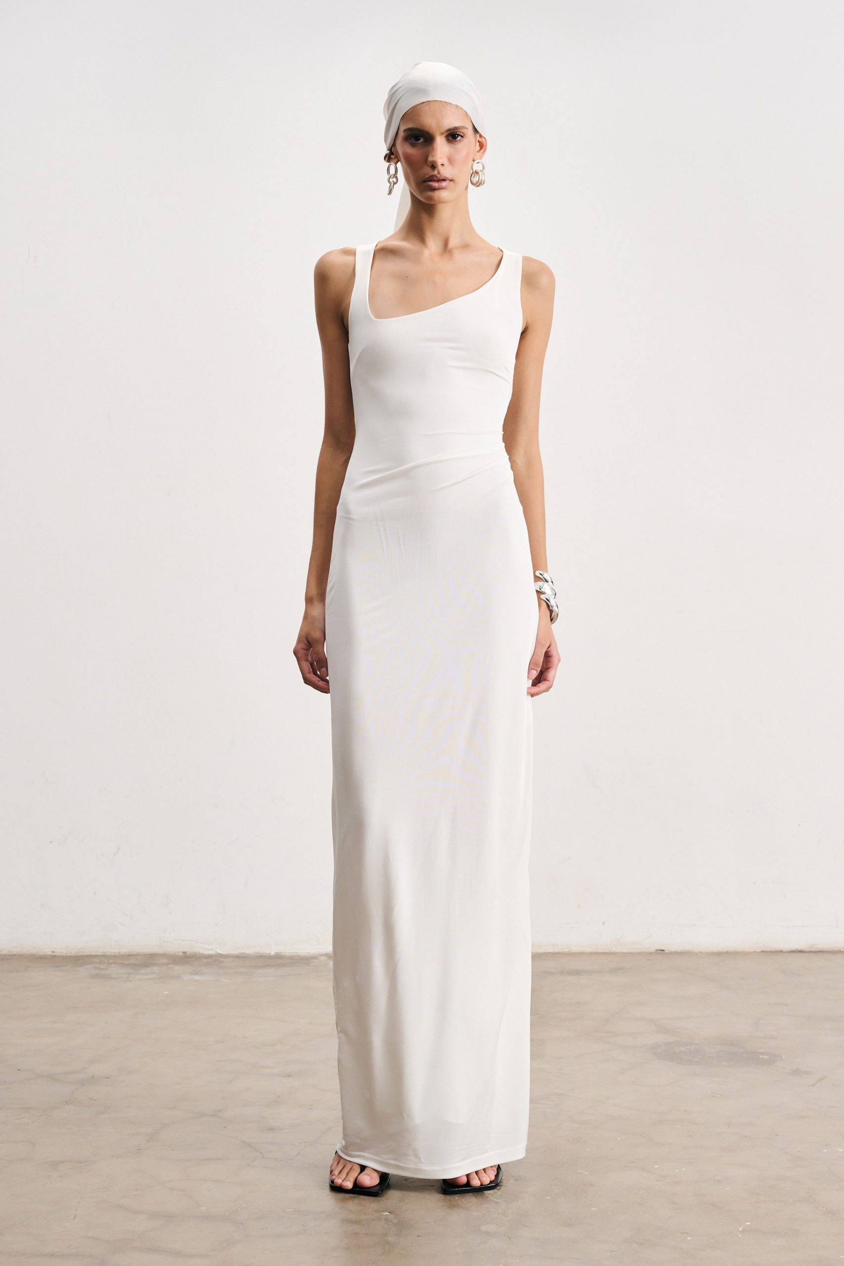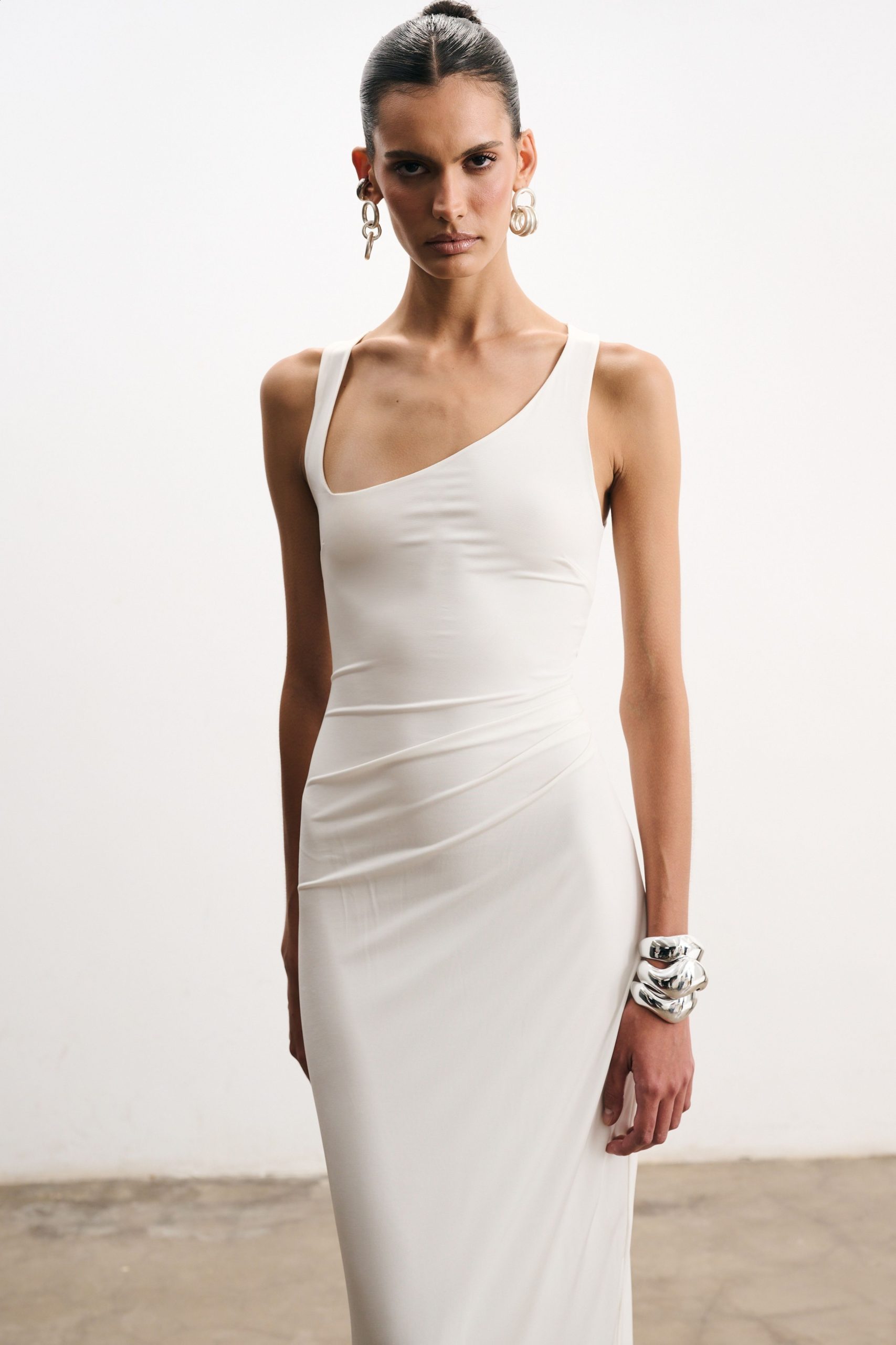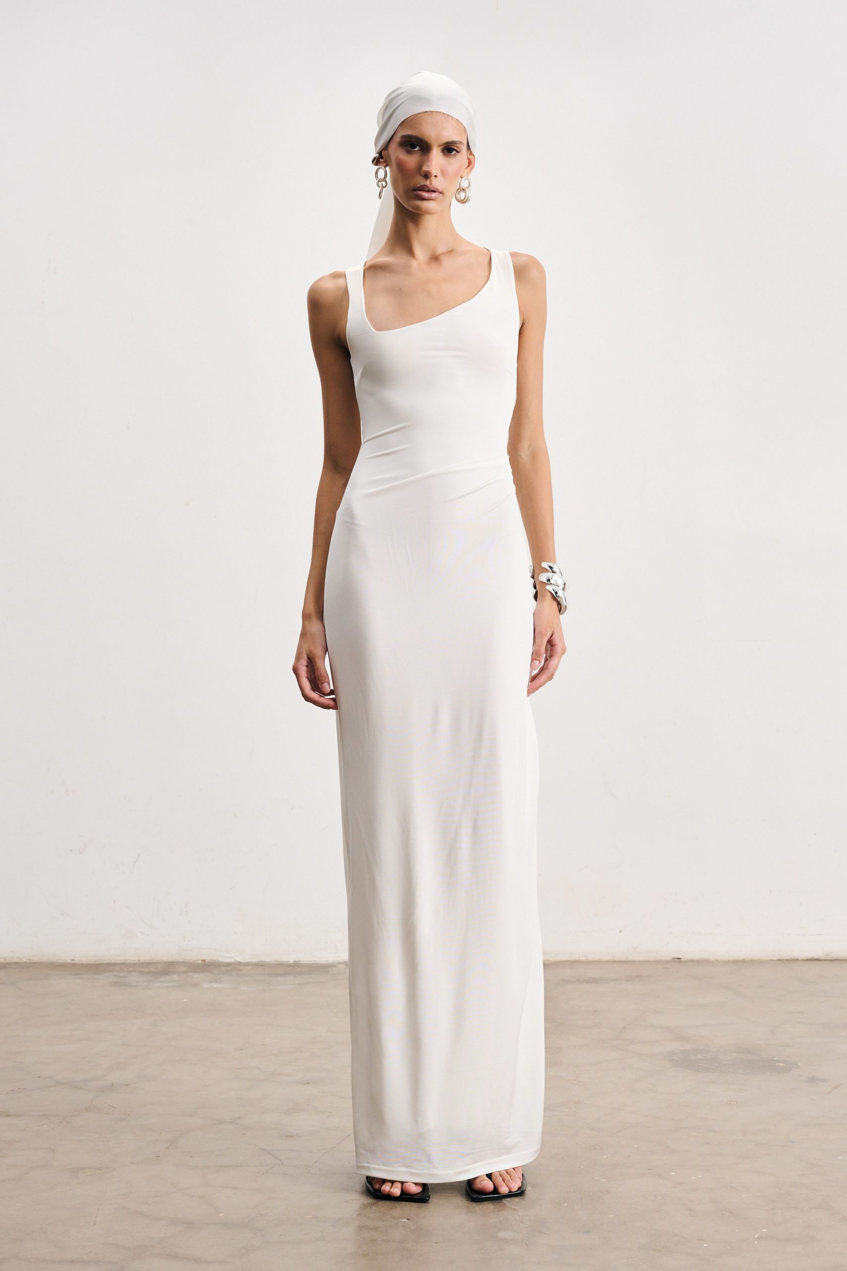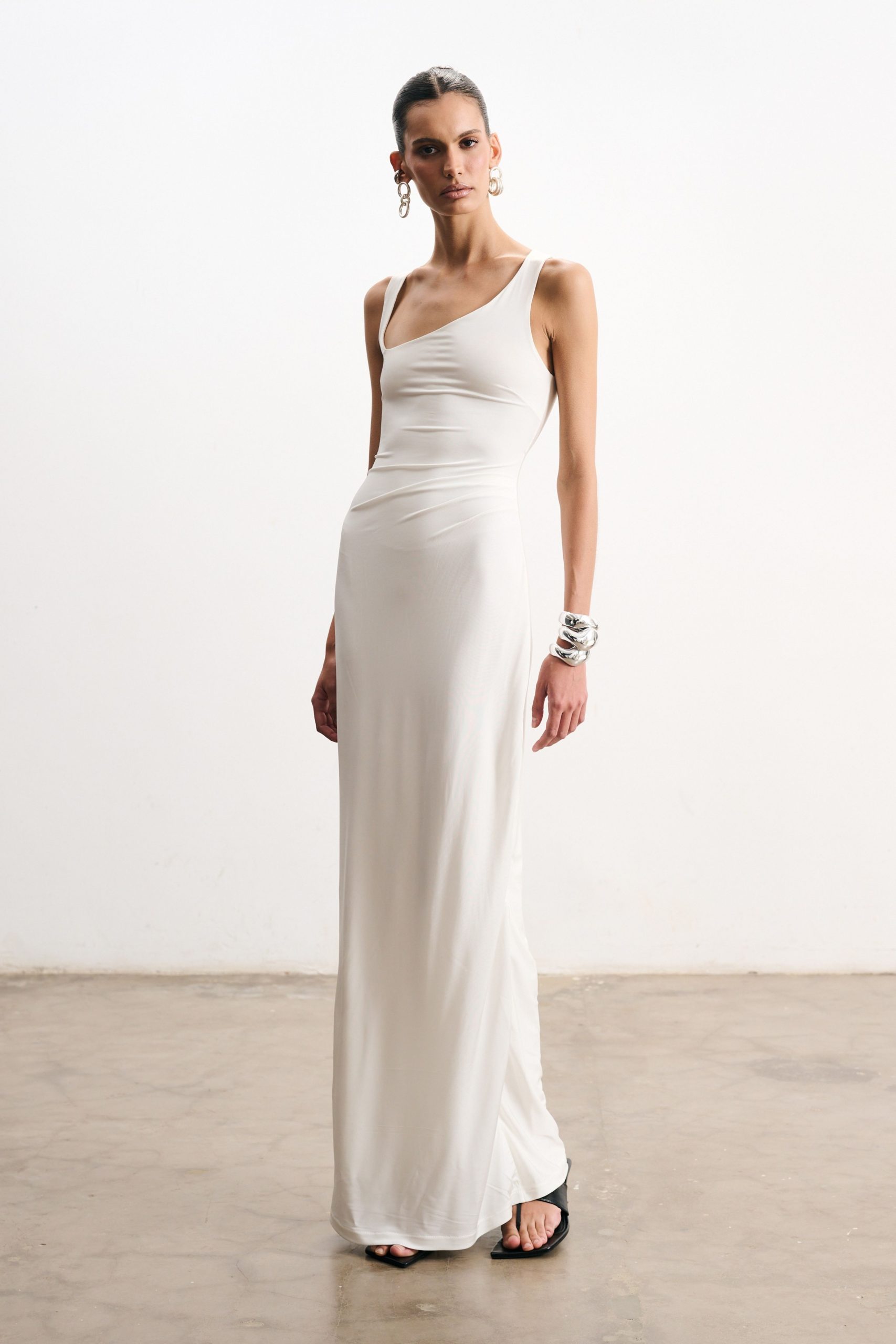 Vestido longo em Jersey de viscose off-white, todo forrado no mesmo tecido. Com decote assimétrico, o modelo realça o colo e alonga a silhueta com sofisticação.