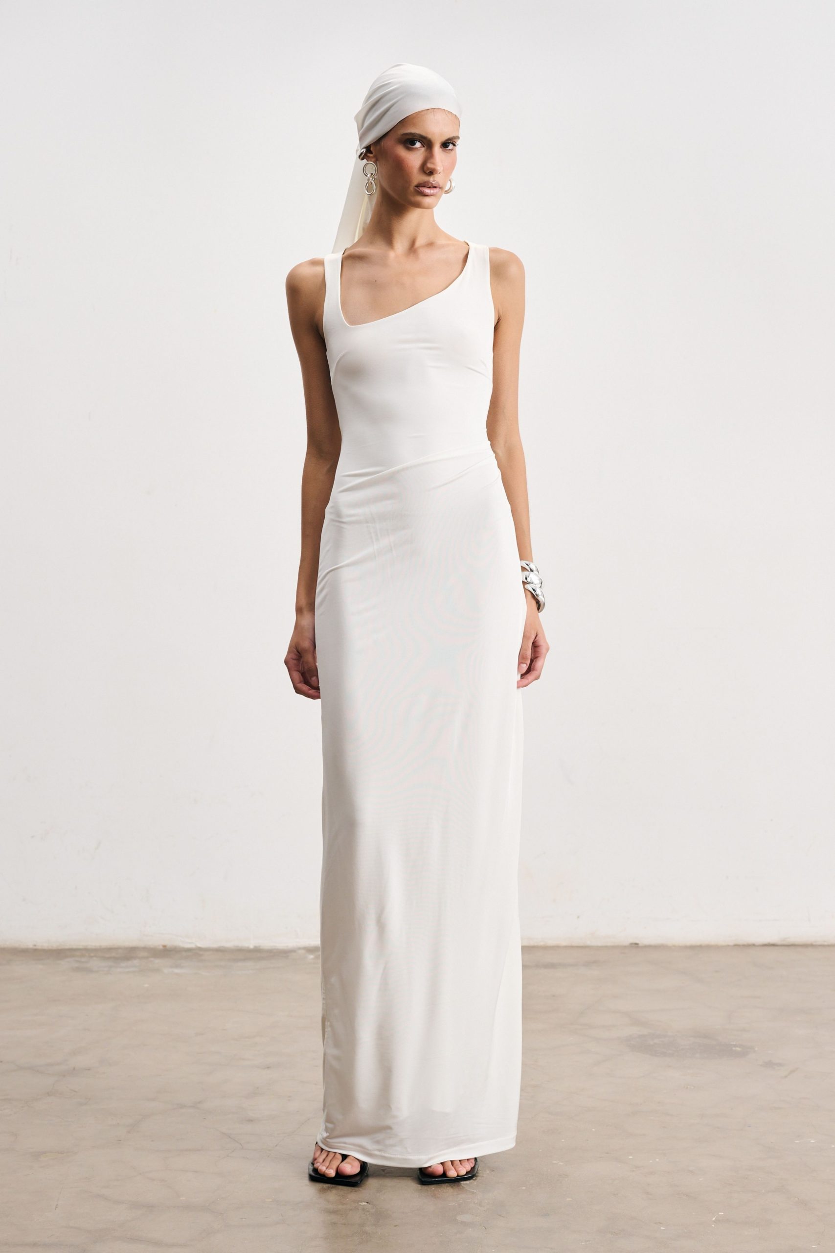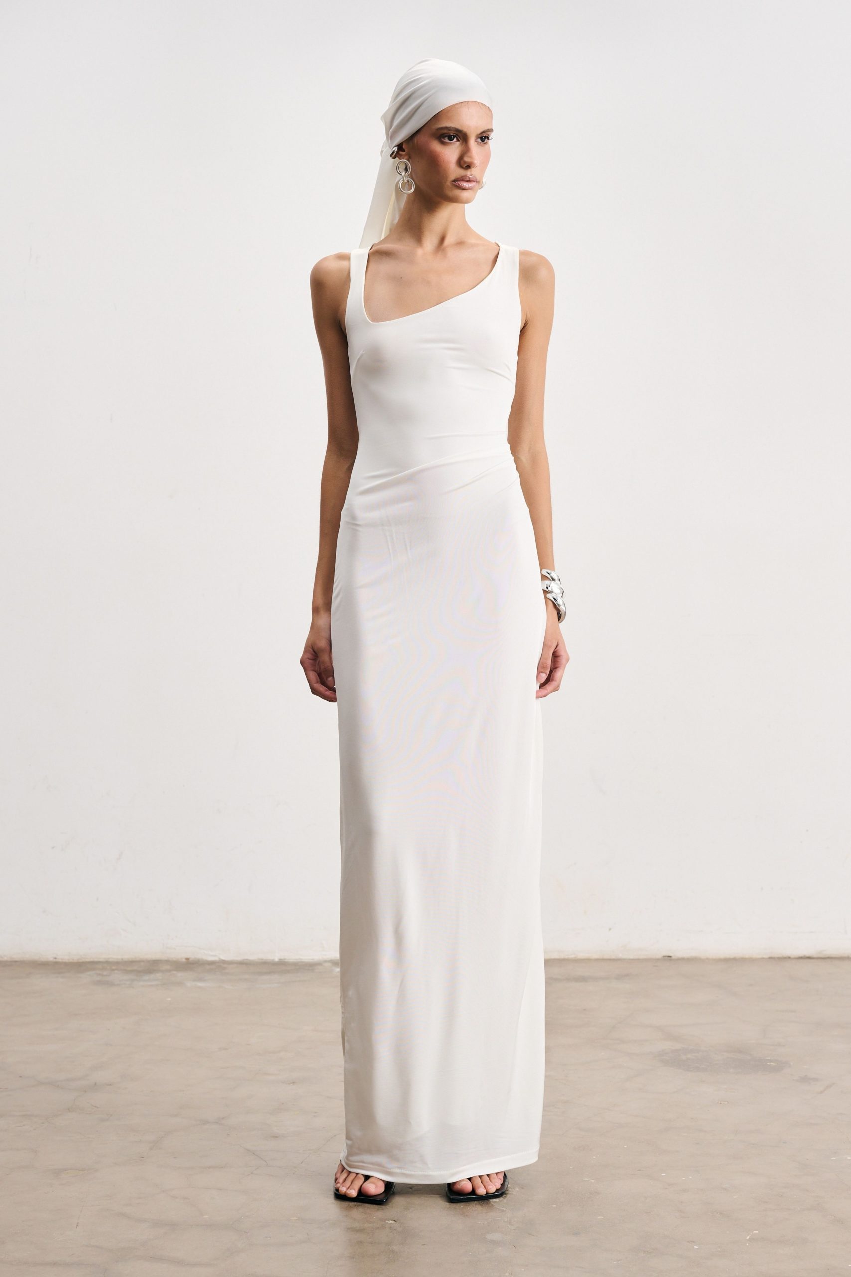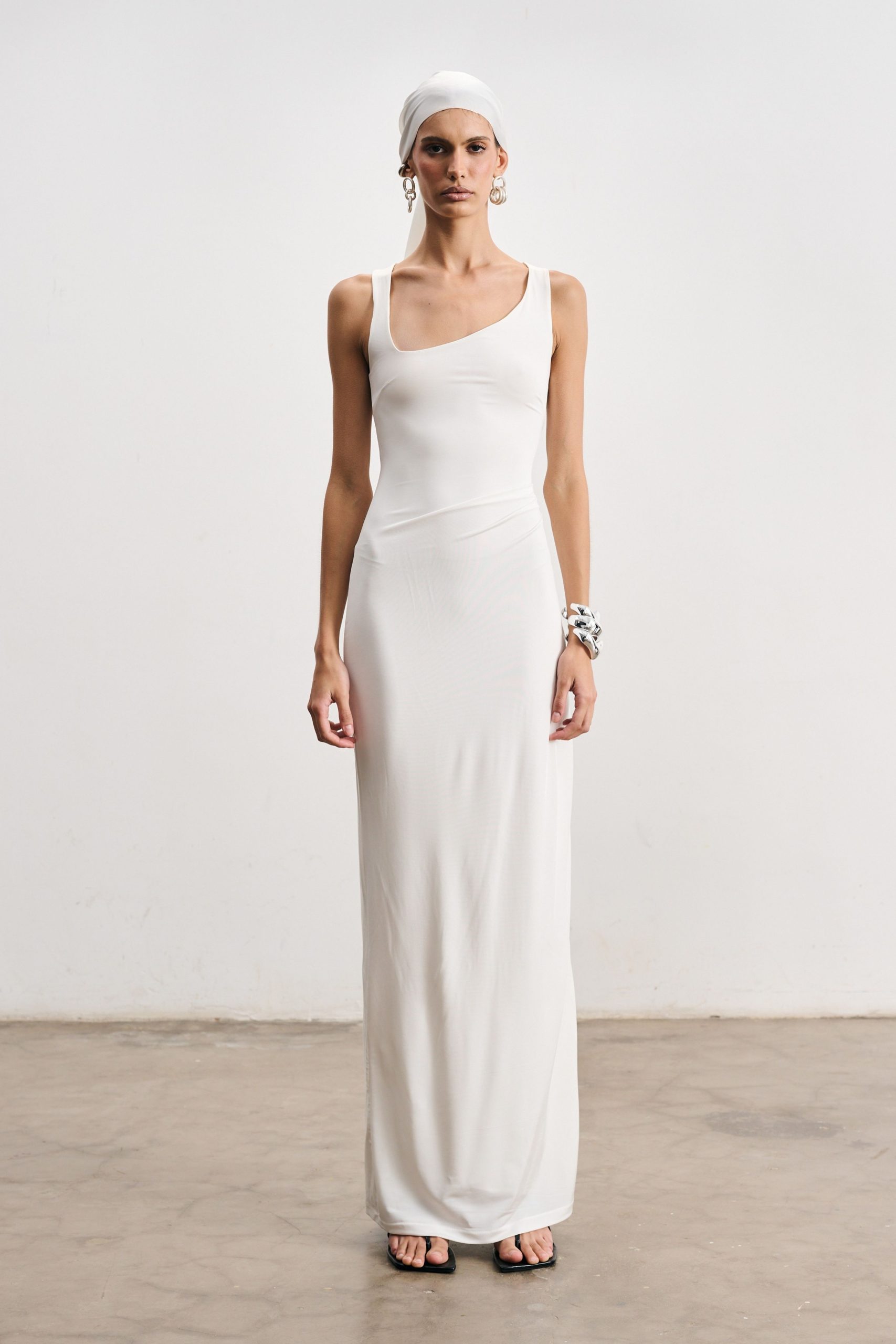Vestido longo em Jersey de viscose off-white, todo forrado no mesmo tecido. Com decote assimétrico, o modelo realça o colo e alonga a silhueta com sofisticação.