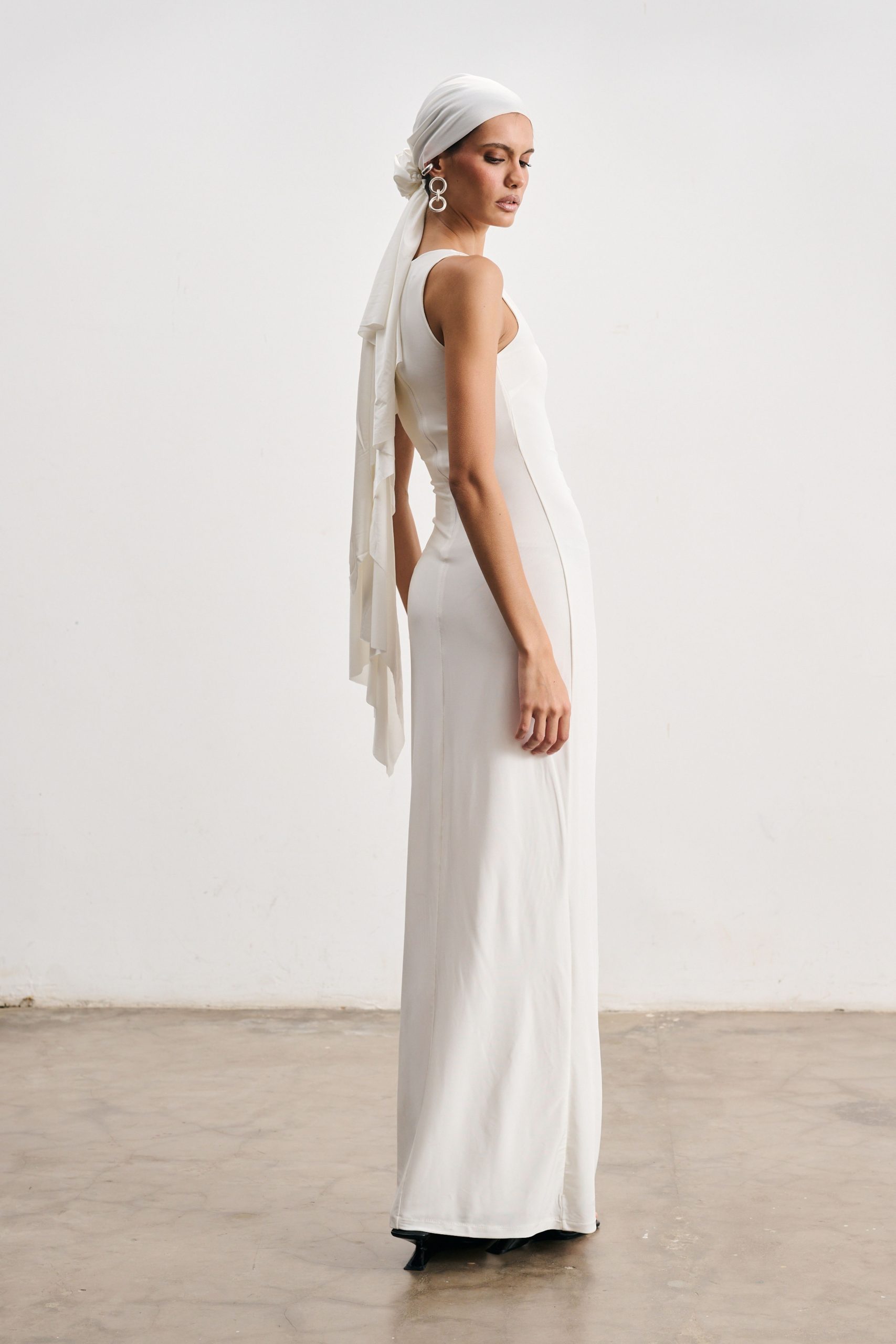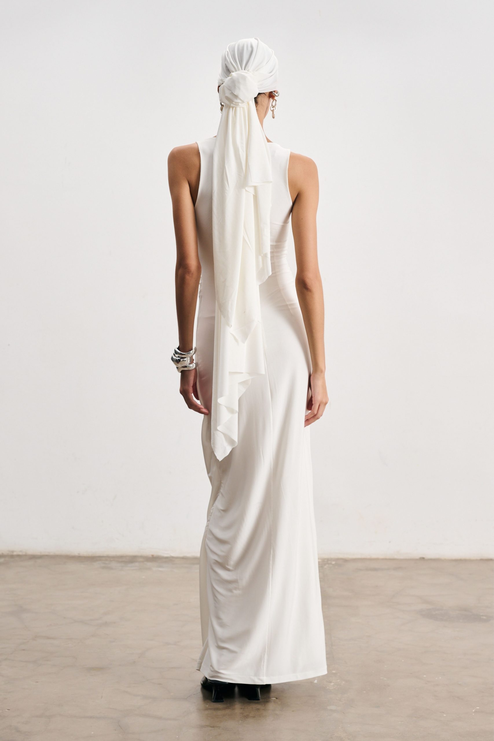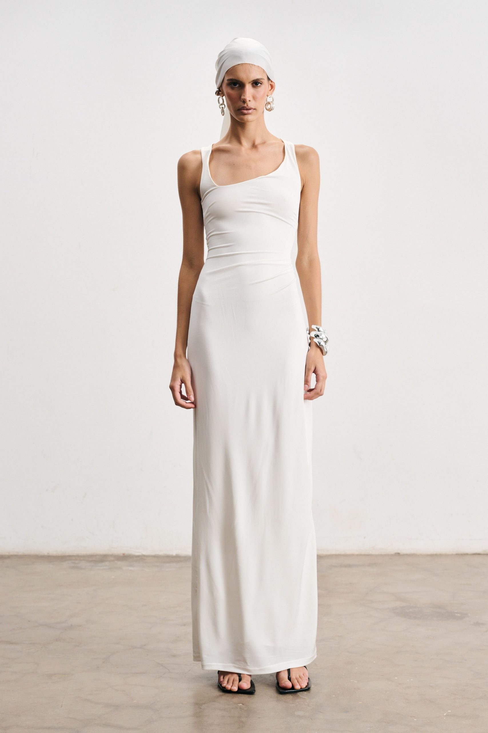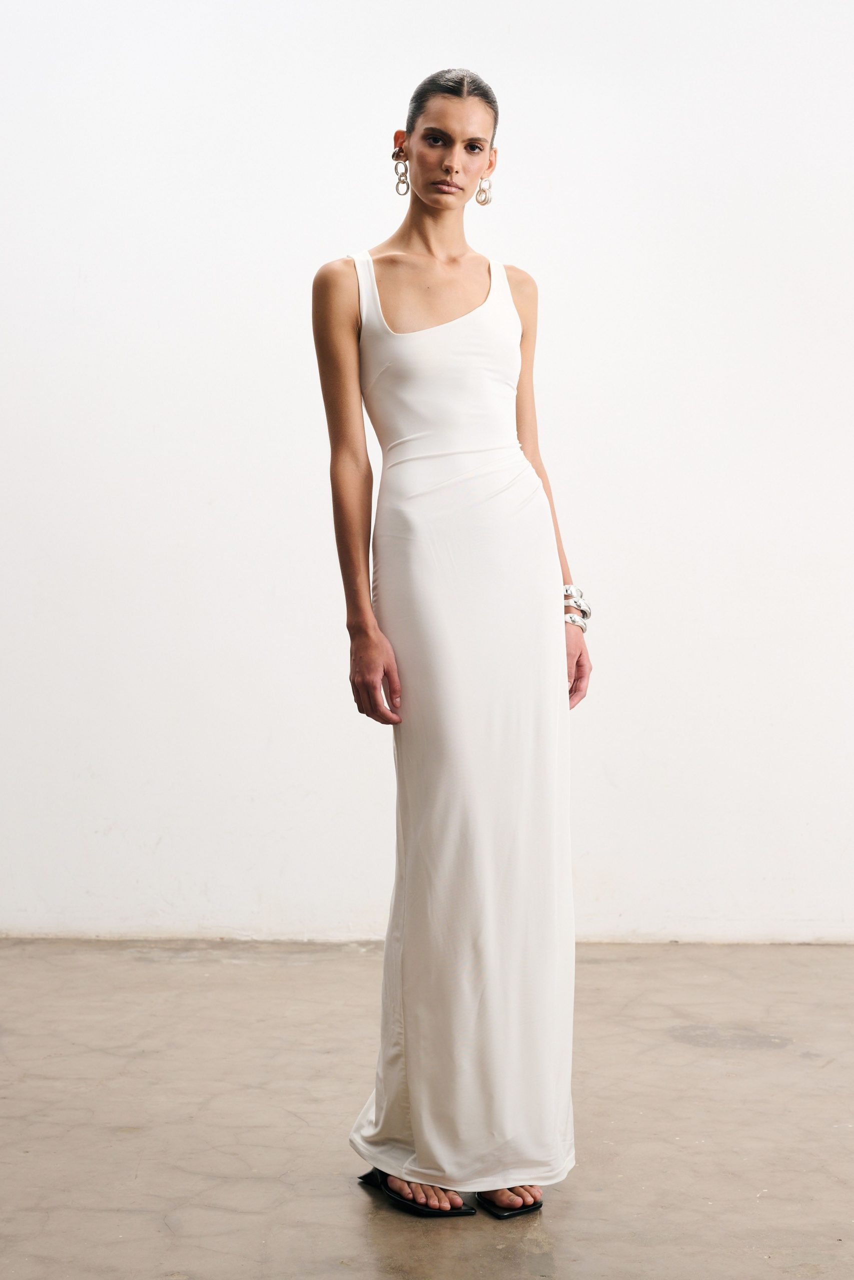 Vestido longo em Jersey de viscose off-white, todo forrado no mesmo tecido. Com decote assimétrico, o modelo realça o colo e alonga a silhueta com sofisticação.