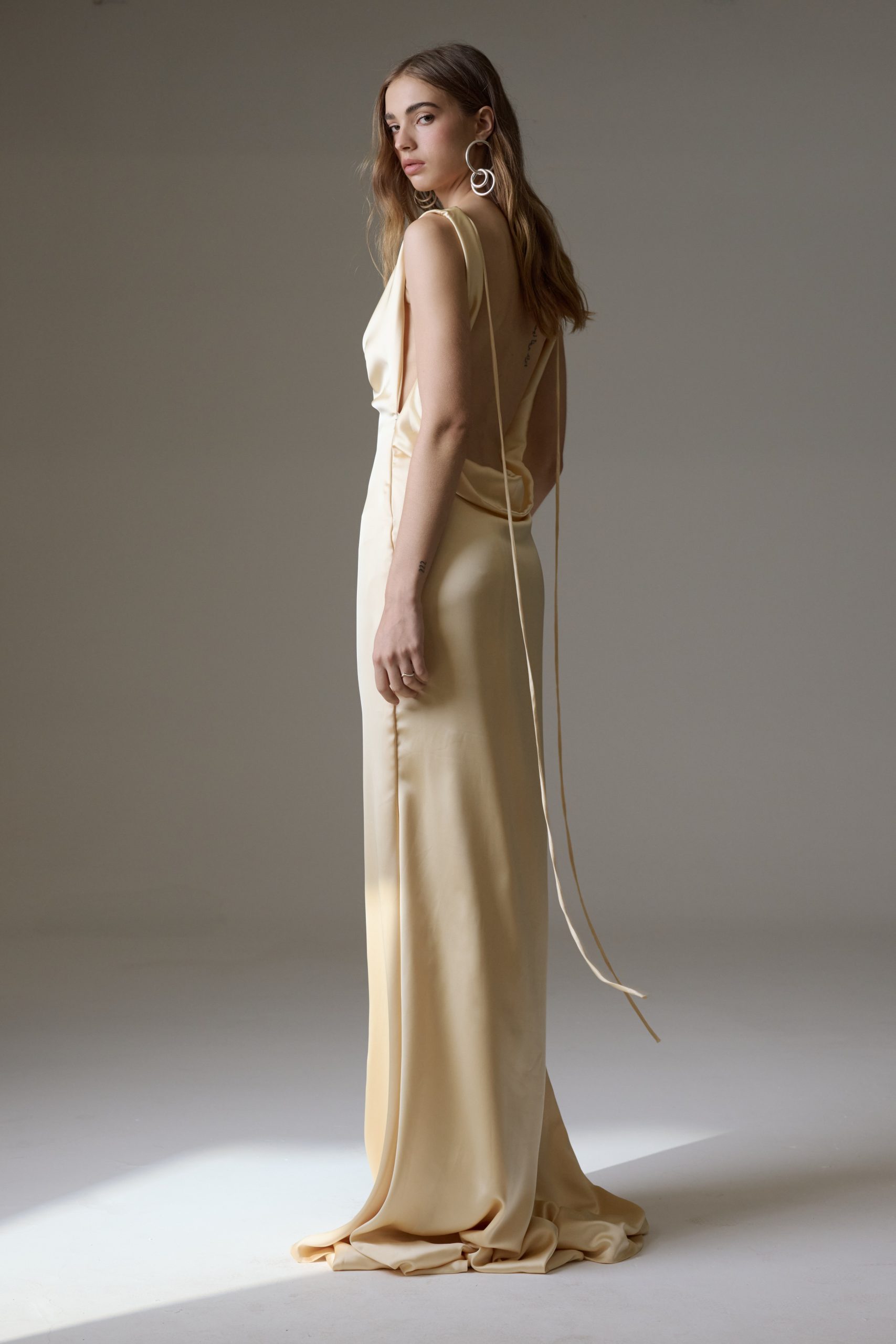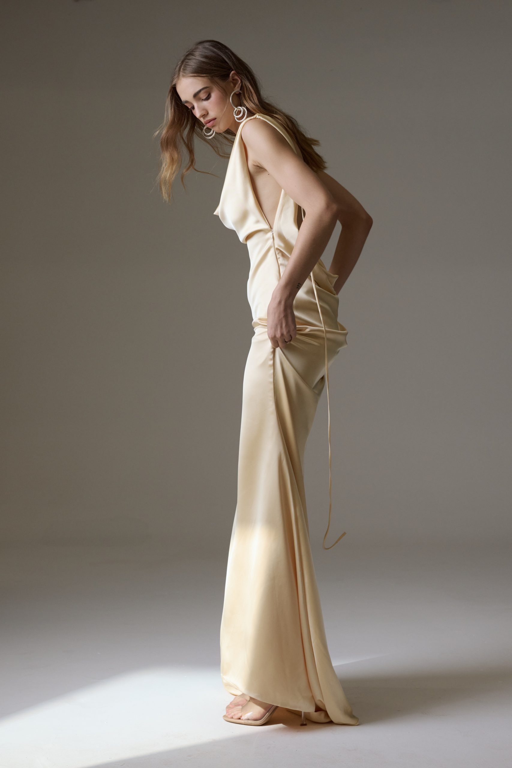 Vestido longo de cetim, todo duplo. Decote slip no busto e nas costas, com cauda. Possui ziper invisivel na lateral.