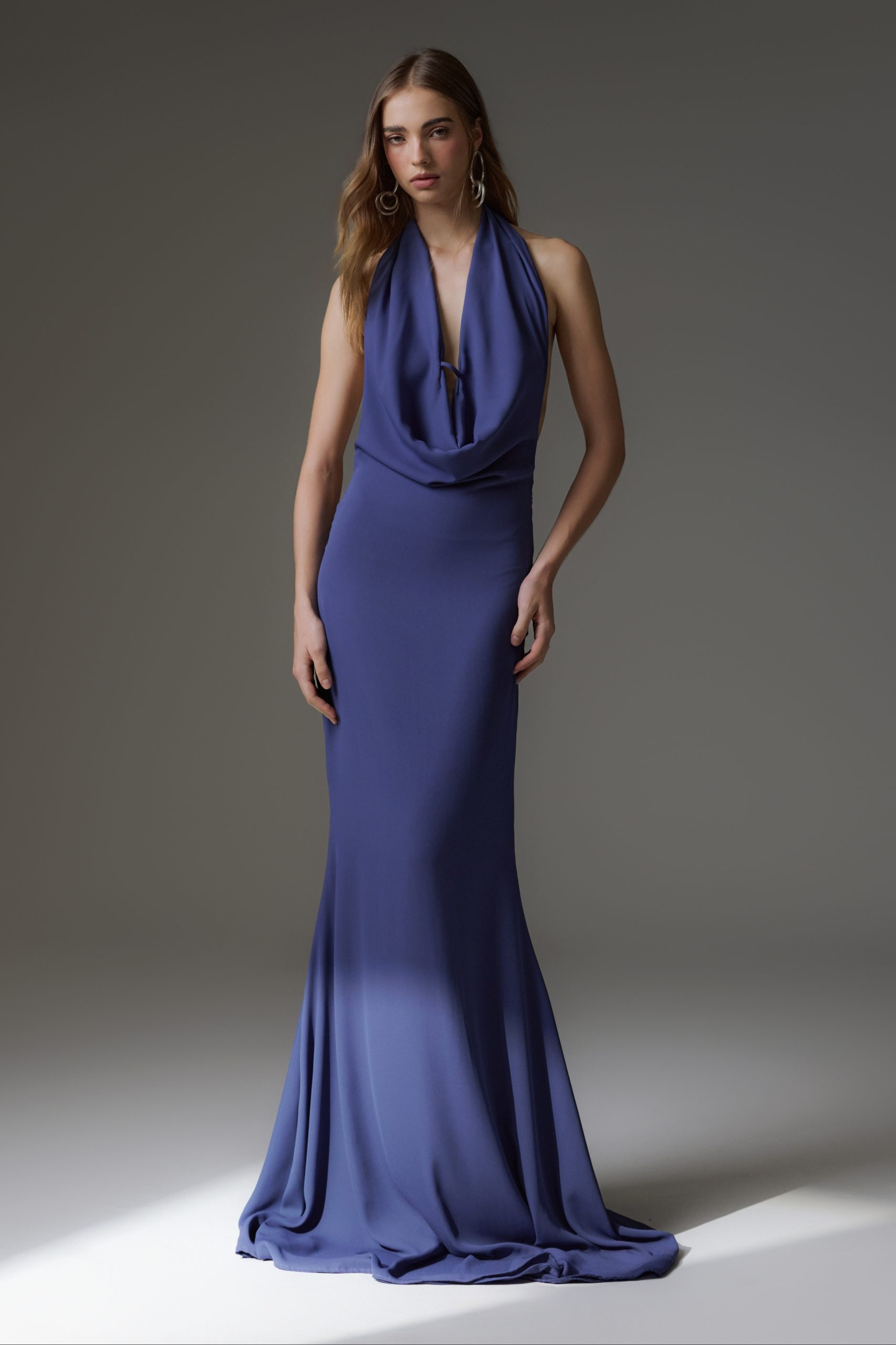 Vestido longo de crepe, todo duplo. Decote slip no busto. Possui ziper invisivel nas costas.