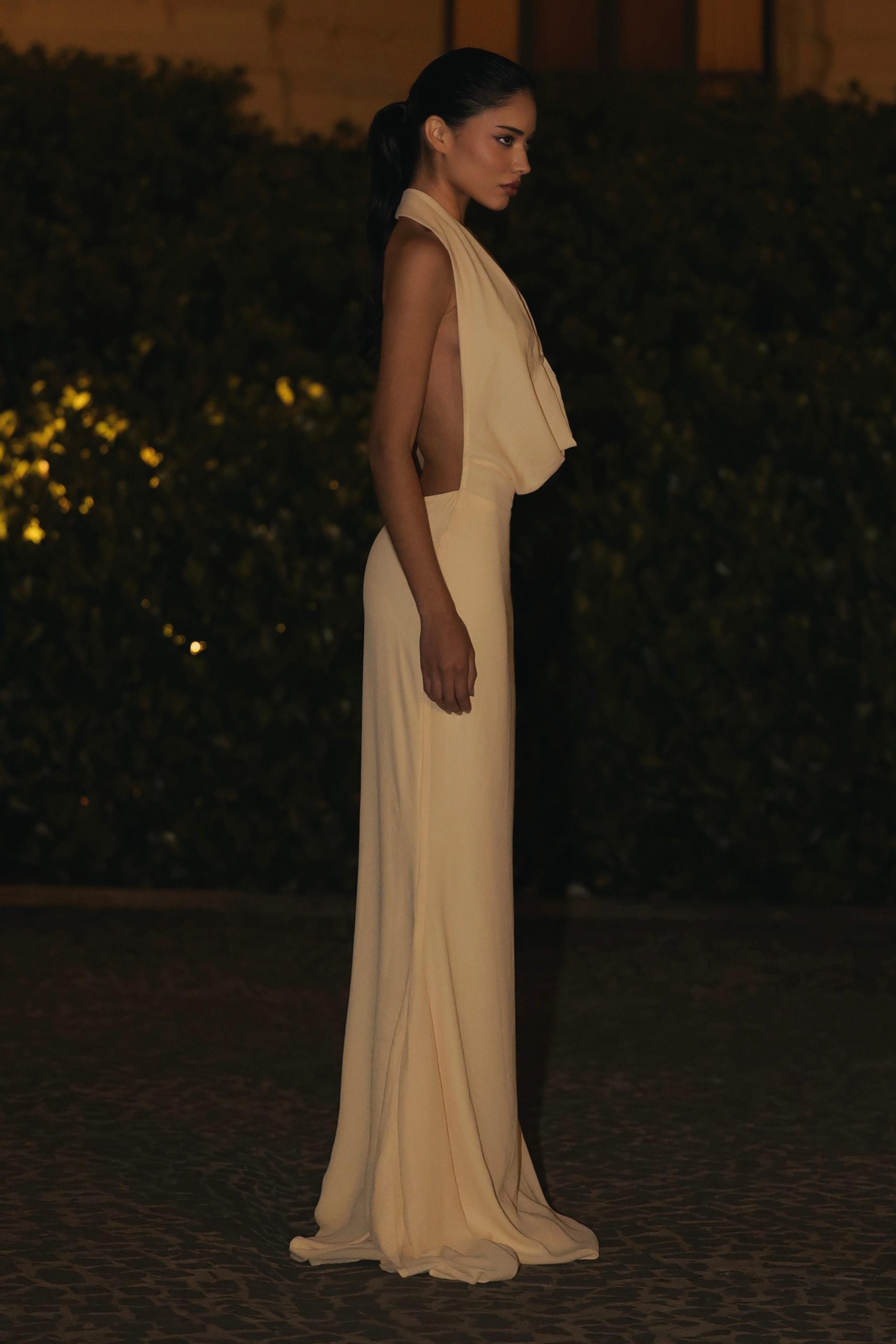 Vestido longo de crepe, todo duplo. Decote slip no busto. Possui ziper invisivel nas costas.
