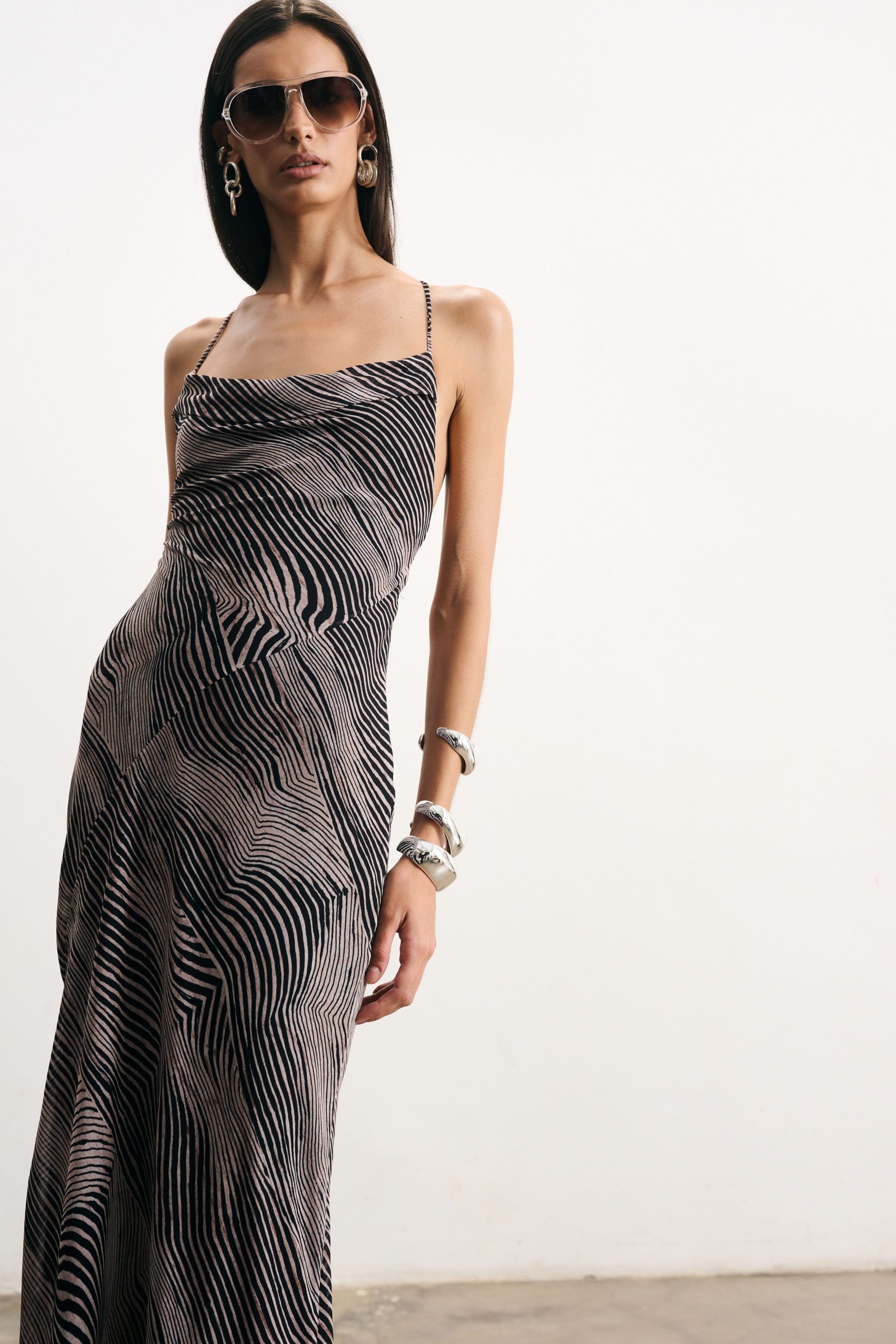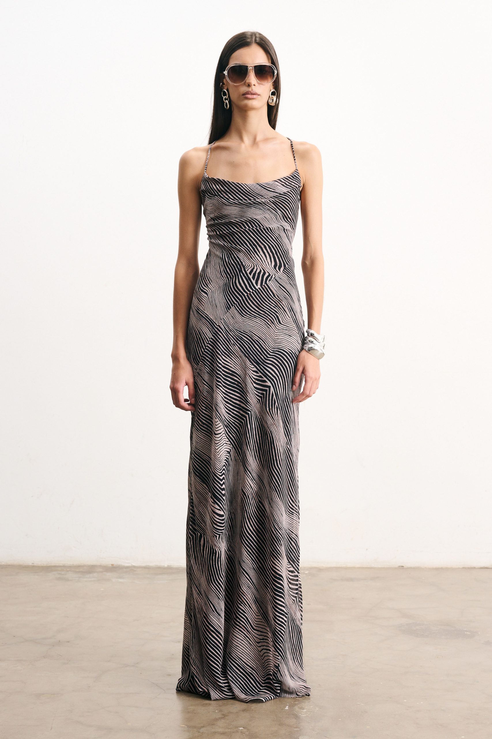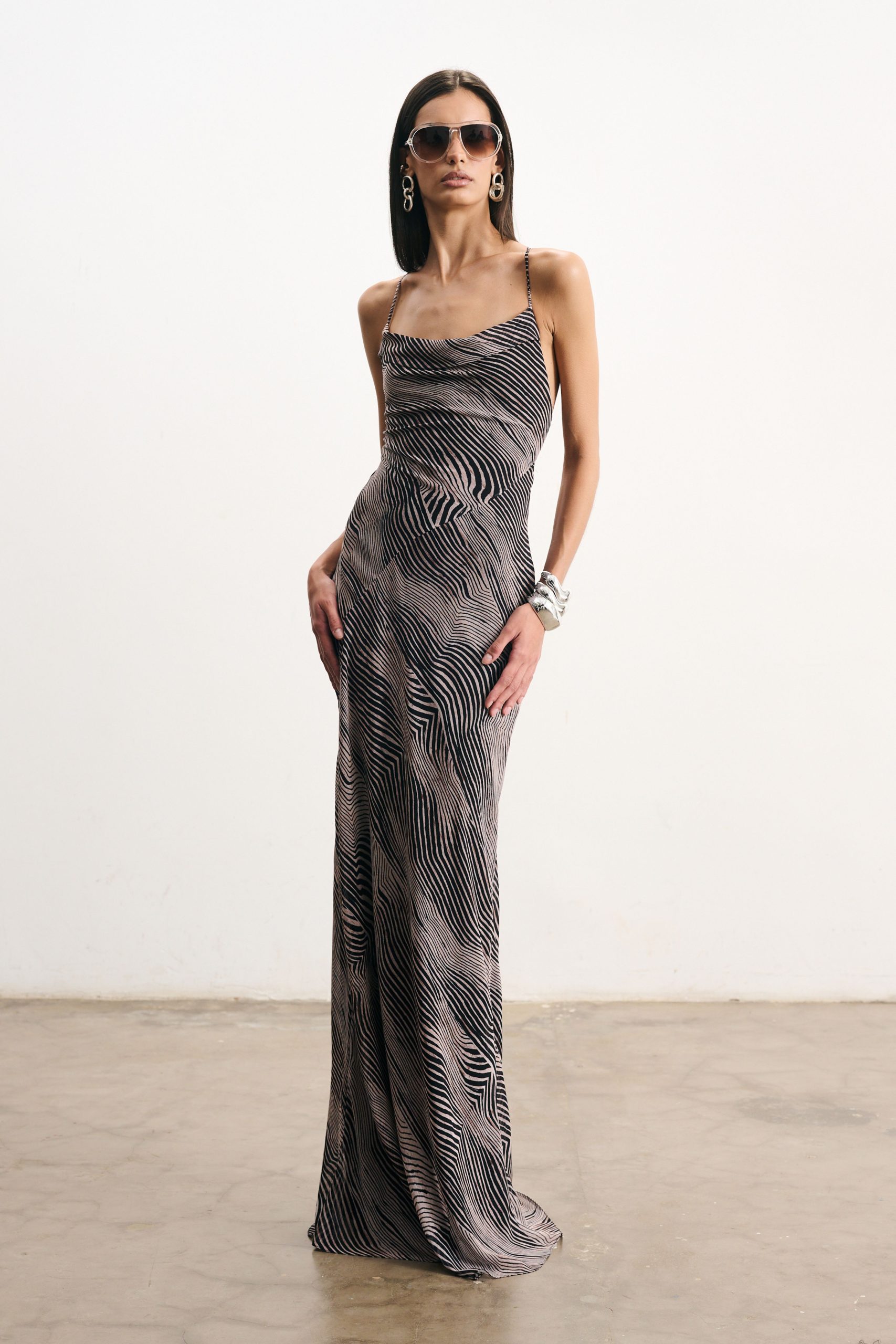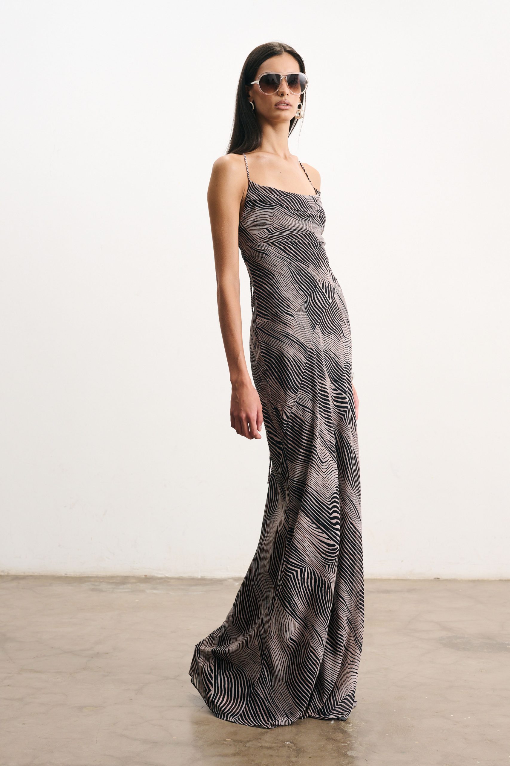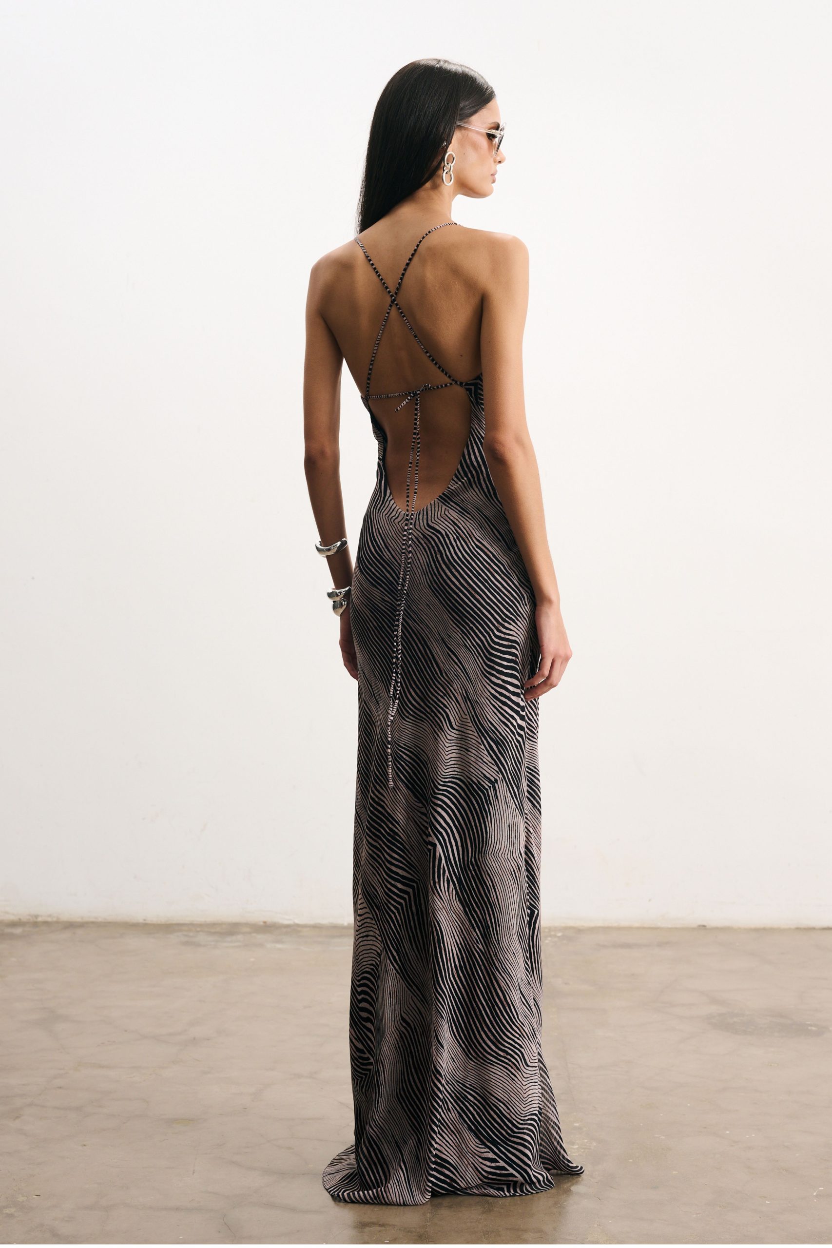 Vestido sereia longo de crepe com estampa digital exclusiva, todo forrado. Decote slip no busto e decote profundo nas costas. Alças fininhas super longas que podem ser cruzadas nas costas, regulando a altura do decote.