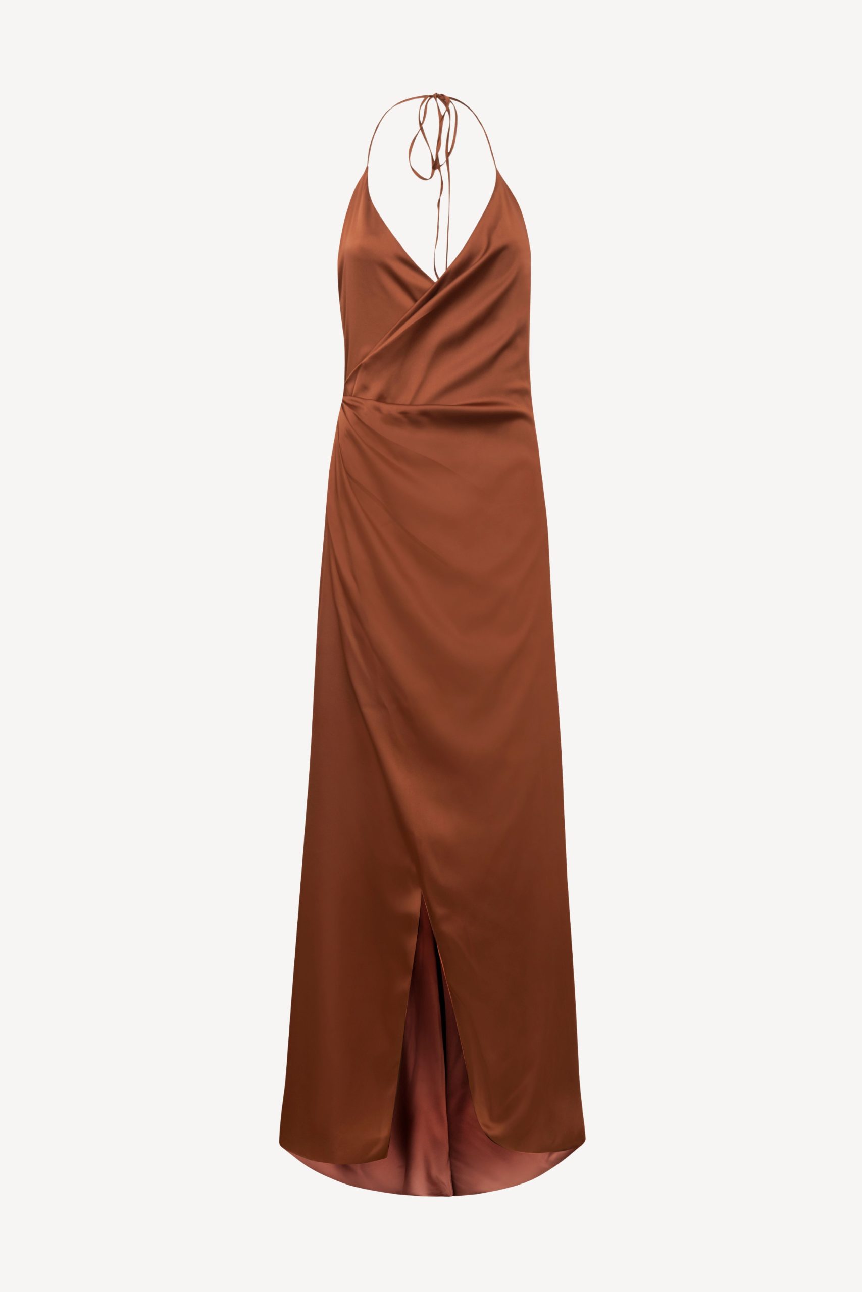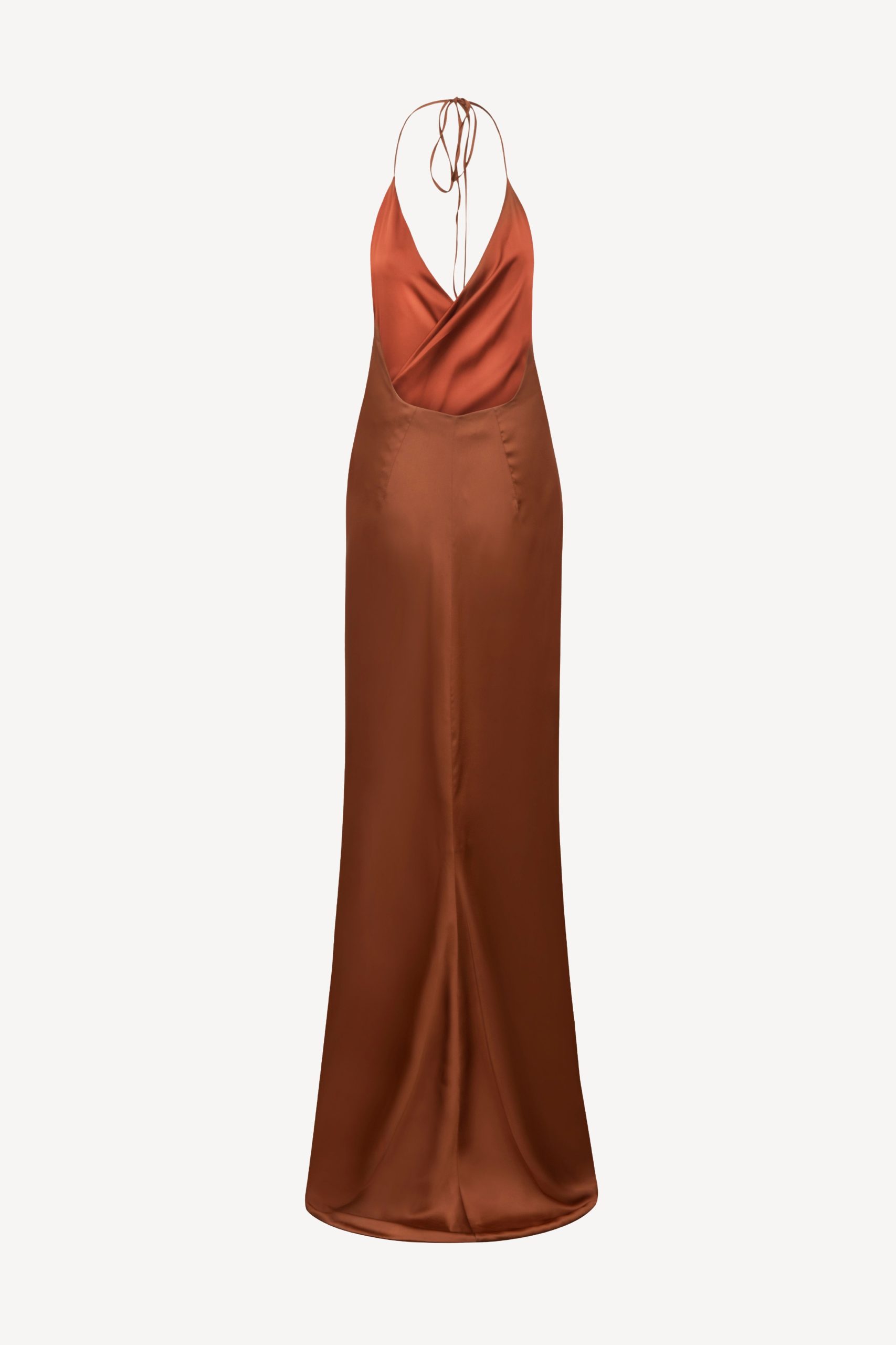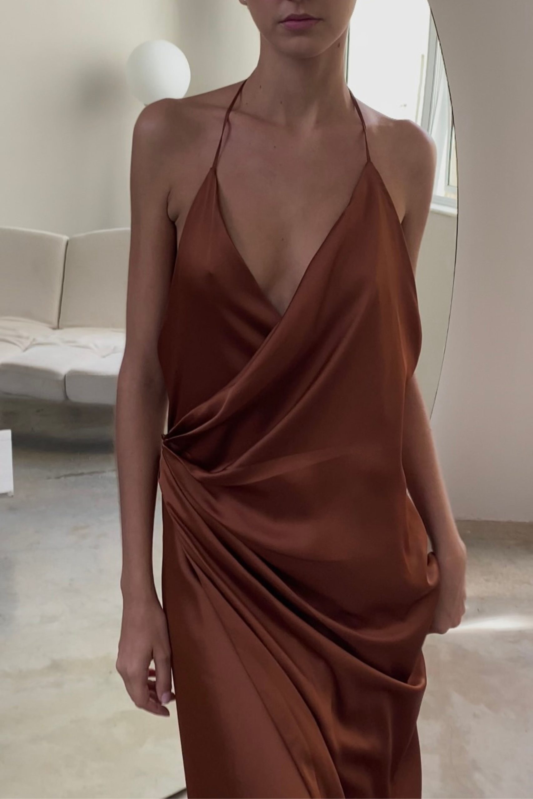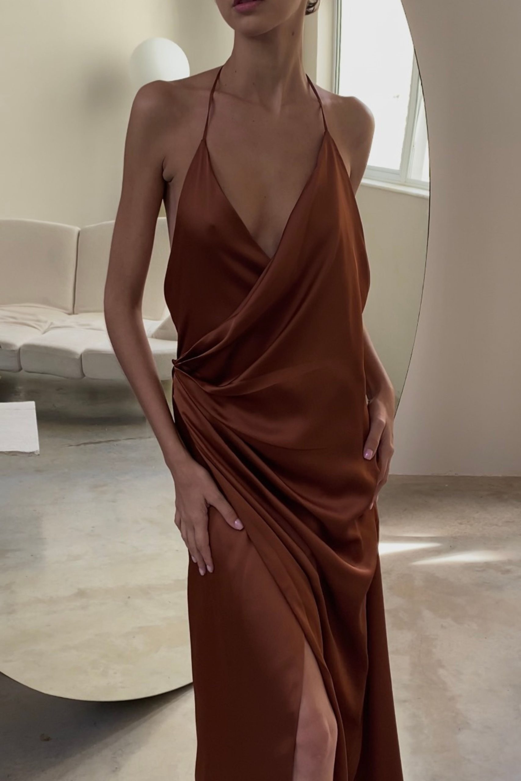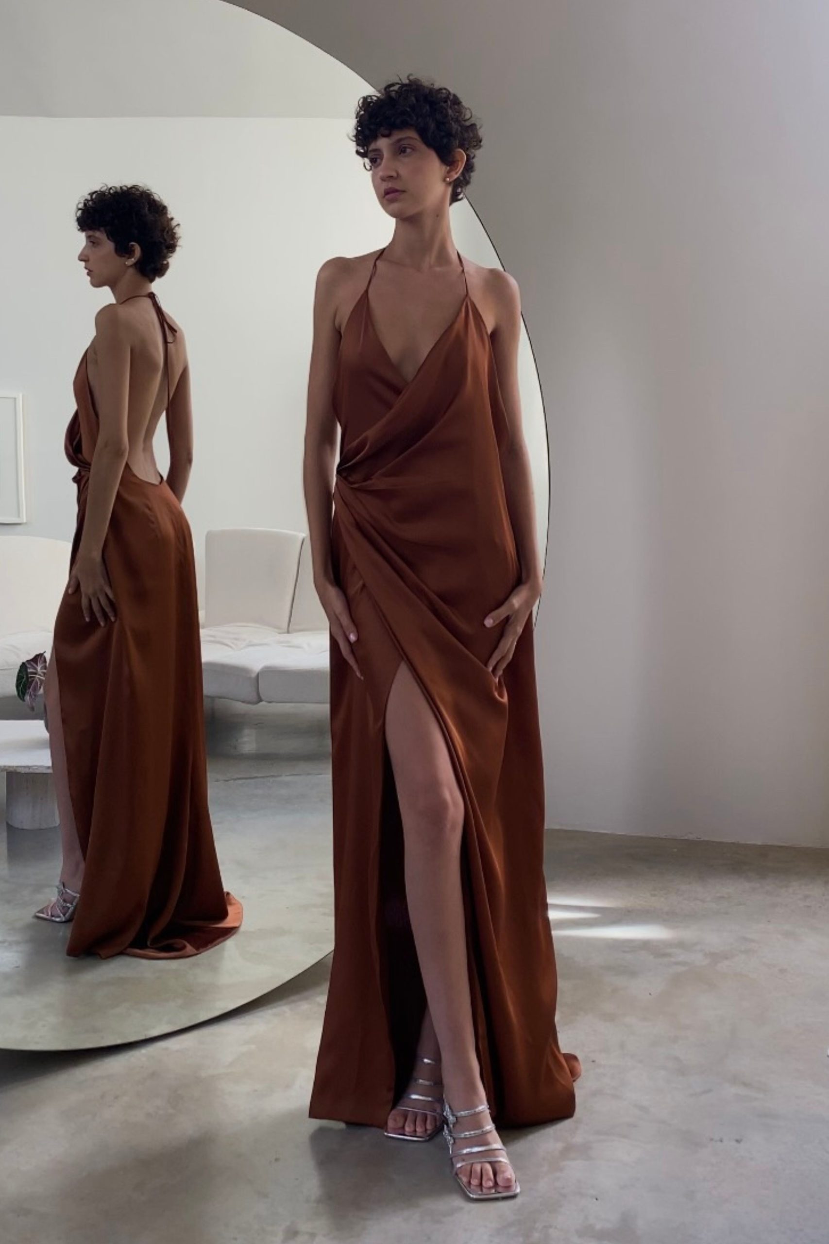 Vestido longo de cetim , possui botão forrado para fechamento e uma cordinha interna para fazer o trespasse.  Decote profundo nas costas. Ajustável, veste bem do PP ao G.
