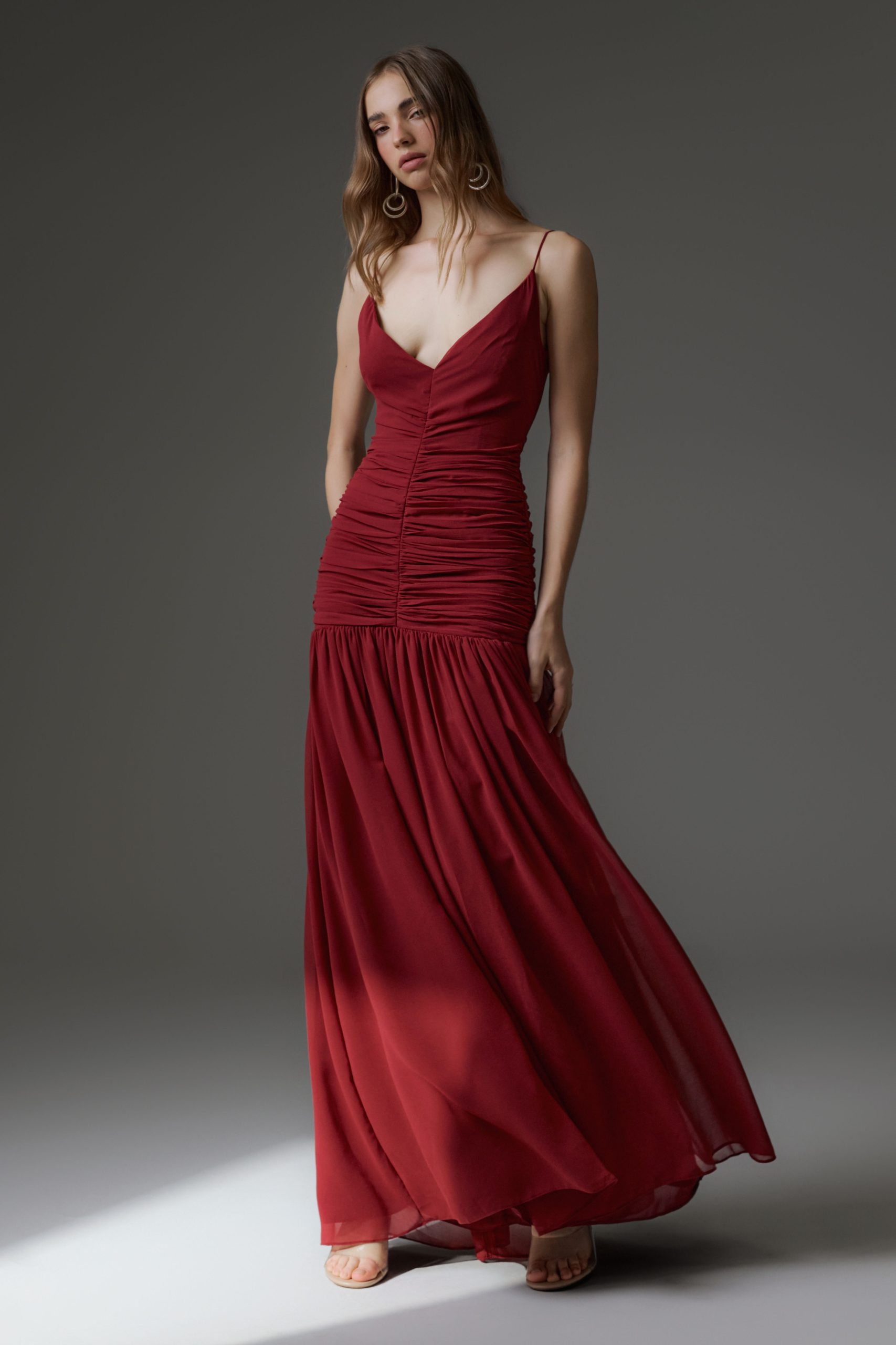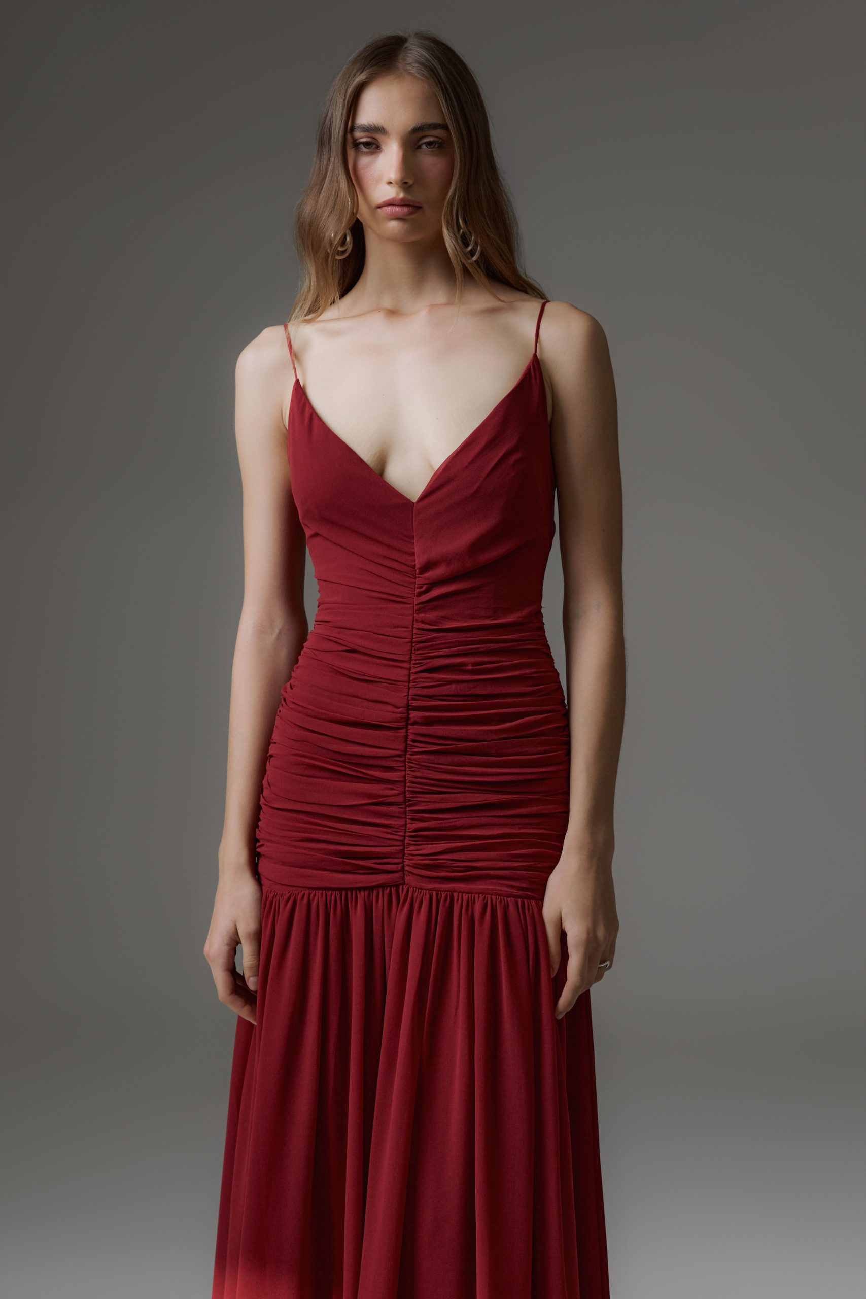Vestido longo em crepe, todo duplo. Modelo com decote em V com a parte superior toda drapeada frente e costas. Saia com caimento reto fluído. Possui fechamento de zíper invisível nas costas.