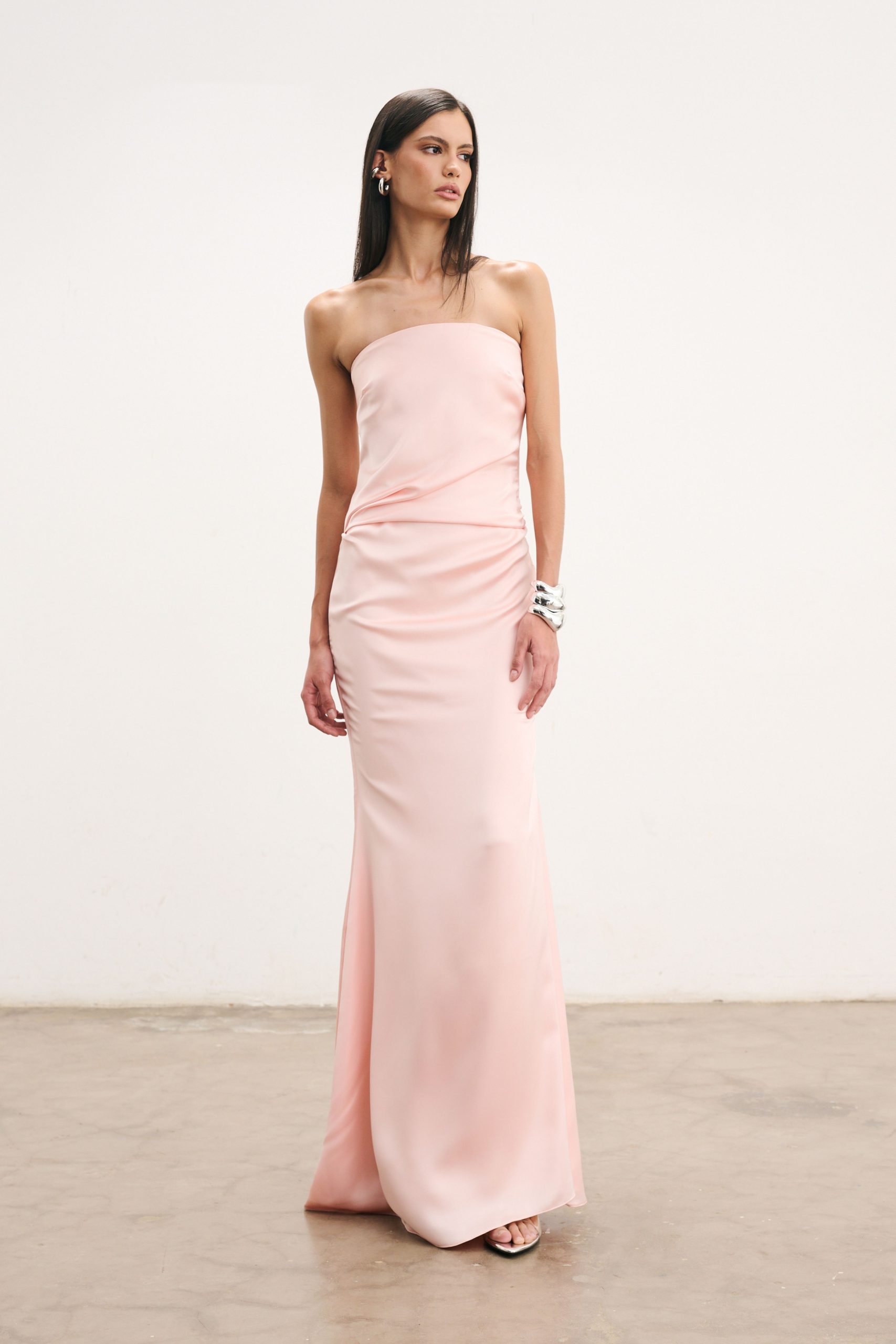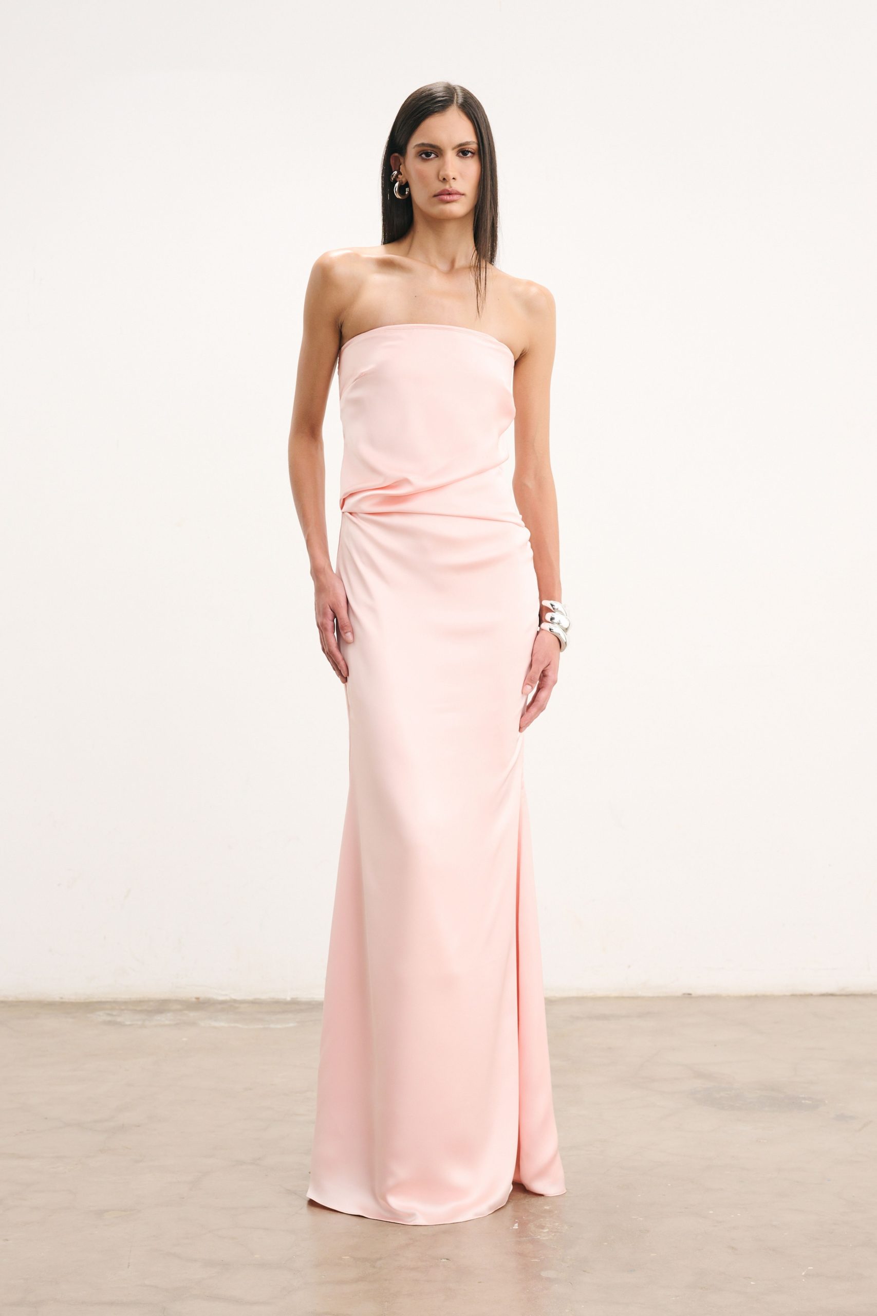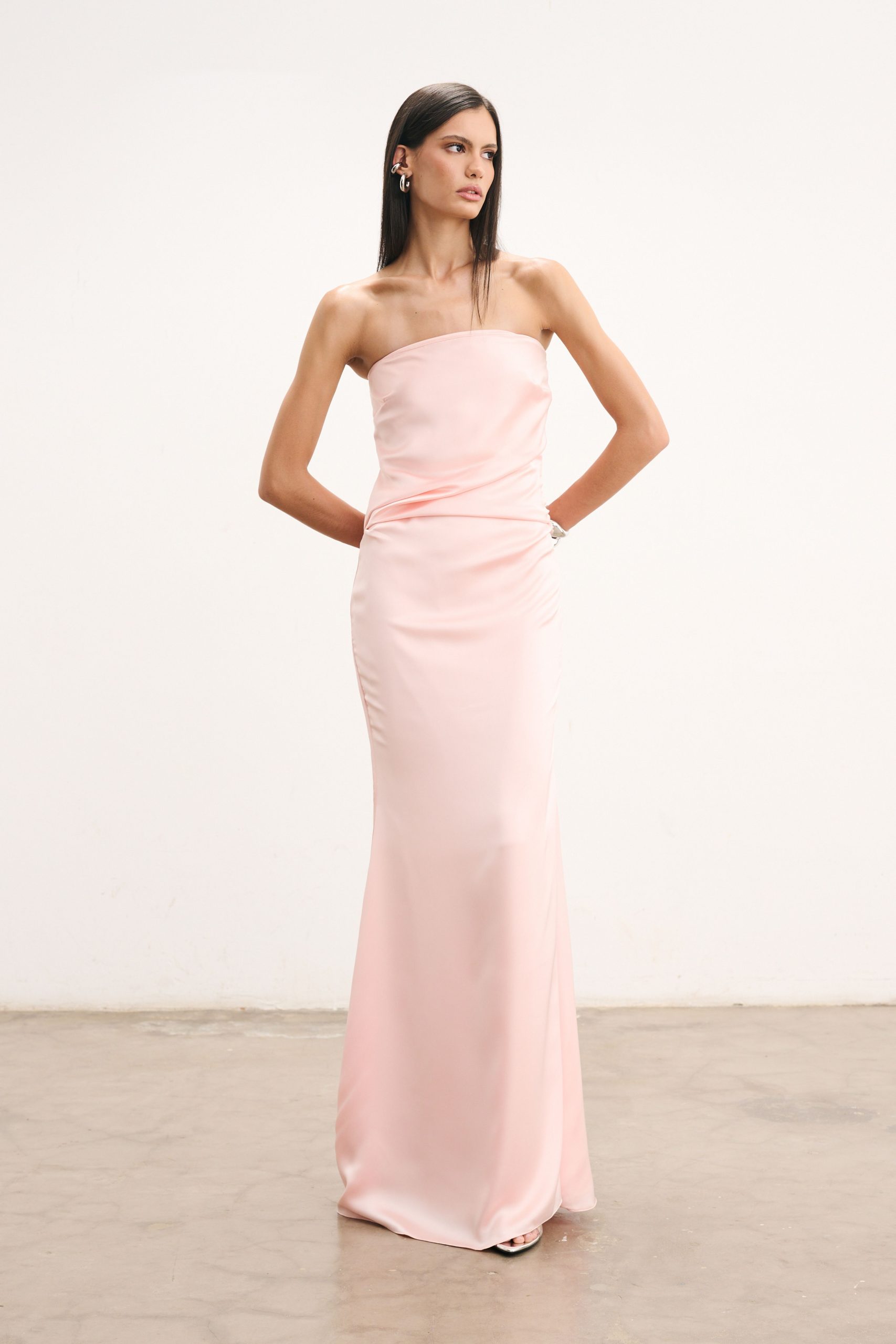 Vestido longo de cetim rosa claro. Decote tomara-que-caia realça o busto e as costas, e drapeado na lateral que modela a silhueta. Possui zíper invisível na lateral.